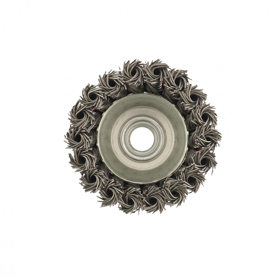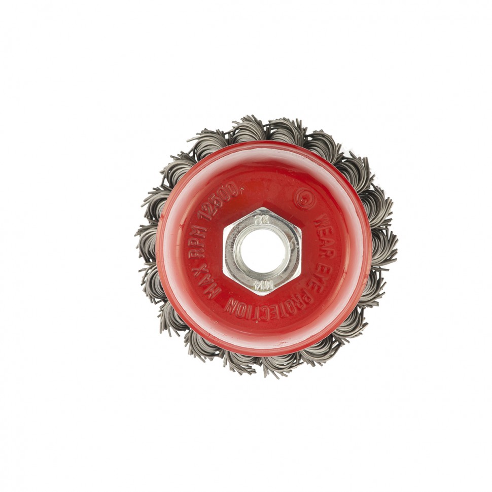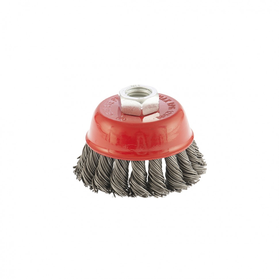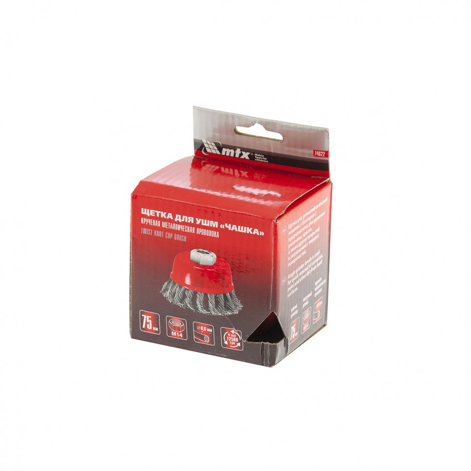 Щетка Matrix «Чашка» 74622 диаметром 75 мм, с присоединительной резьбой М14, с щетиной из крученой проволоки диаметром 0,8 мм, устанавливается на УШМ, поддерживающую работу со скоростью 12500 об/мин. Щетина предназначена для грубой (черновой) обработки поверхностей, более агрессивной по сравнению с щетиной 0,5 мм. Изделие подходит для удаления загрязнений, снятия толстого слоя ржавчины, ЛКМ, зачистки сварных швов.ПреимуществаПрочность и долговечность — щетина из крученой стальной проволоки выдерживает значительные нагрузки.Высокая производительность — насадка формы «чашка» оптимальна для зачистки больших поверхностей.Универсальность — щетка подходит для обработки любых твердых материалов: металла, древесины, цветных металлов, пластика и т. д.Устойчивость к разрушению — корпус покрыт эмалью, а щетина —техническим маслом.