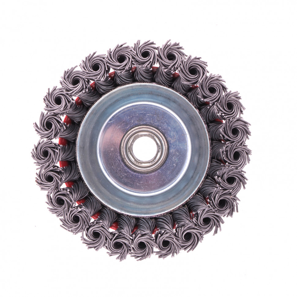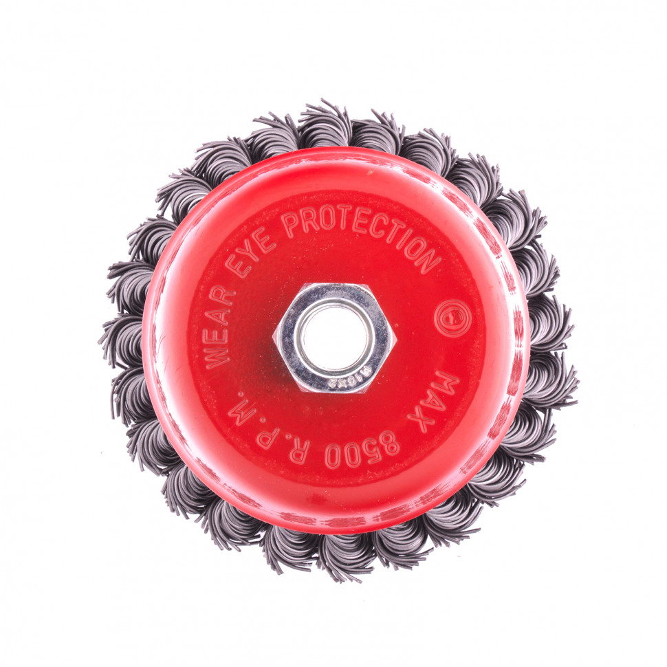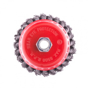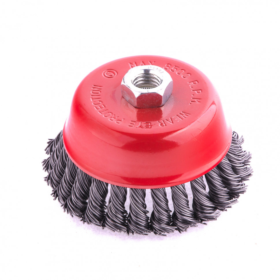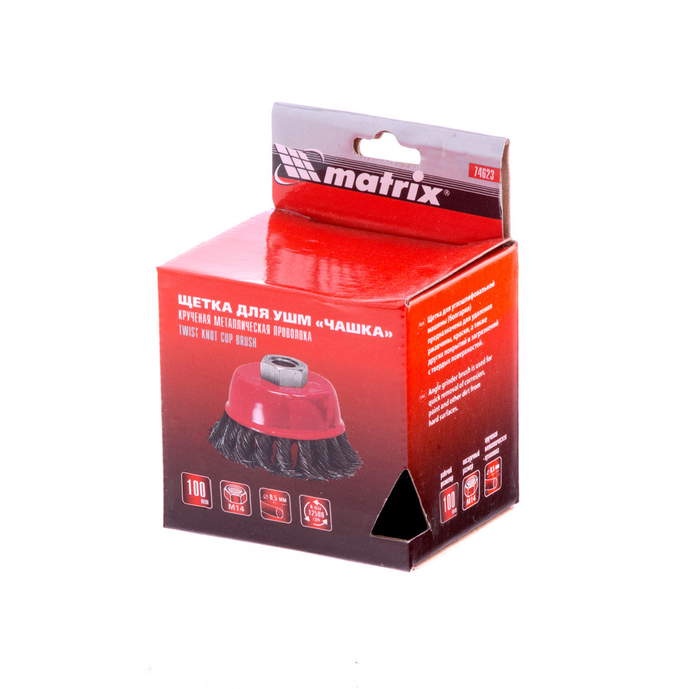 Щетка Matrix «Чашка» 74623 диаметром 100 мм, с присоединительной резьбой М14, с щетиной из крученой проволоки диаметром 0,8 мм, устанавливается на УШМ, поддерживающую работу со скоростью 8500 об/мин. Щетина предназначена для грубой (черновой) обработки поверхностей, более агрессивной по сравнению с щетиной 0,5 мм. Изделие подходит для удаления загрязнений, снятия толстого слоя ржавчины, ЛКМ, зачистки сварных швов.ПреимуществаПрочность и долговечность — щетина из крученой стальной проволоки выдерживает значительные нагрузки.Высокая производительность — насадка формы «чашка» оптимальна для зачистки больших поверхностей.Универсальность — щетка подходит для обработки любых твердых материалов: металла, древесины, цветных металлов, пластика и т. д.Устойчивость к разрушению — корпус покрыт эмалью, а щетина —техническим маслом.