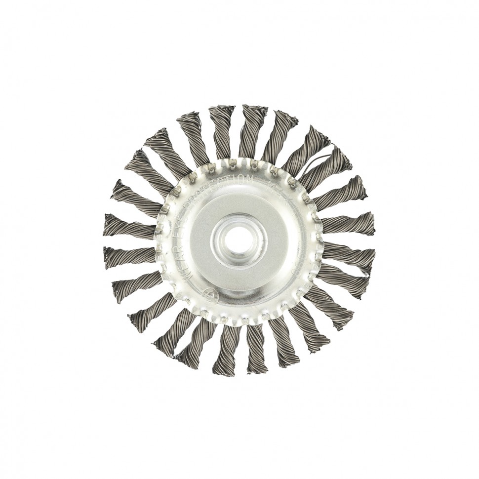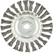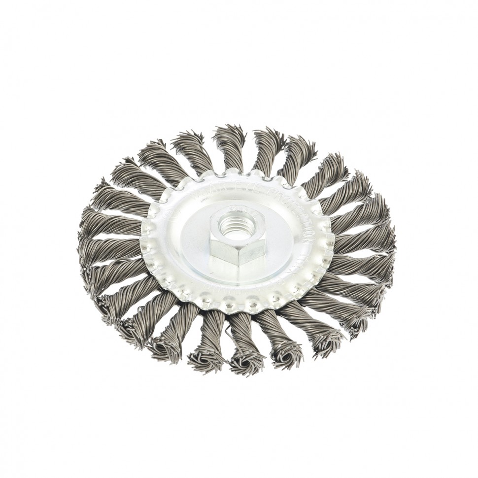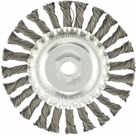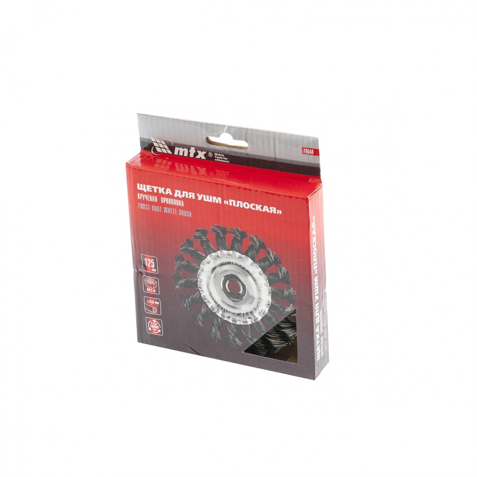 Плоская щетка Matrix 74644 диаметром 125 мм, с щетиной из крученой проволоки толщиной 0,8 мм и гайкой М14, — оснастка для УШМ, предназначенная для грубой (черновой) обработки поверхностей. Максимально допустимая скорость вращения шпинделя — 10000 об/мин. Щетка позволяет снять толстый слой ржавчины, лакокрасочных покрытий, загрязнений, а также зачистить сварные швы. Плоская форма удобна для обработки углов, изгибов и других труднодоступных мест.ПреимуществаДолговечность — щетина из высококачественной стальной проволоки устойчива к износу.Универсальность — щетка подходит для обработки любых твердых поверхностей: из металла, древесины, цветных металлов, пластика и т. д.Стойкость к разрушению — корпус оцинкован, а щетина покрыта техническим маслом для защиты от коррозии.