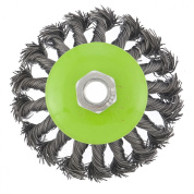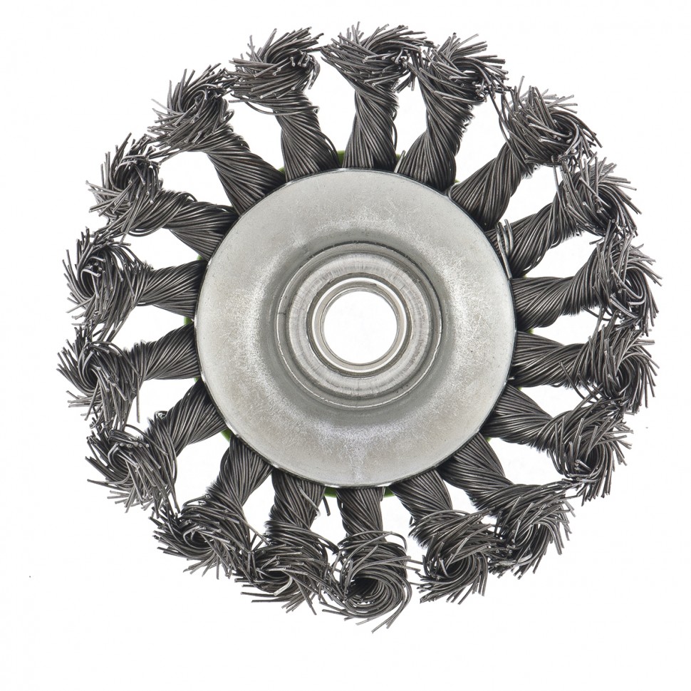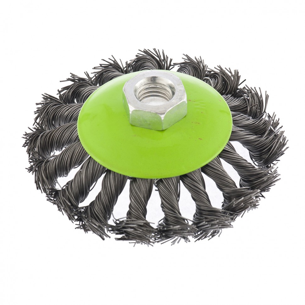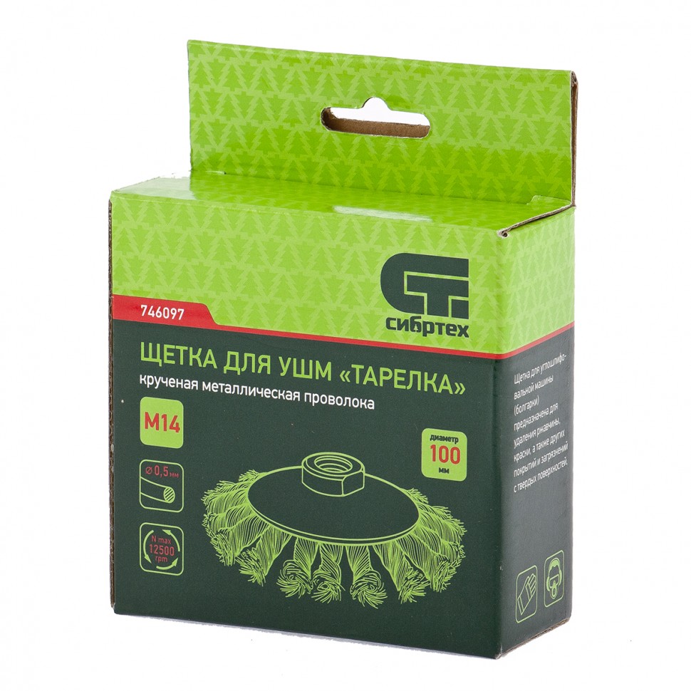 Щетка Сибртех «тарелка» 746097 диаметром 100 мм, с щетиной из крученой проволоки толщиной 0,5 мм, устанавливается на УШМ при помощи гайки М14. Выполнена в форме тарелки, за счет чего подходит для грубой (черновой) обработки плоских и угловых поверхностей. Удаляет ржавчину, загрязнения, лакокрасочные покрытия, подходит для зачистки сварных швов. Использование на скорости до 12500 об/мин позволяет продлить срок службы насадки.ПреимуществаИзносостойкость — щетина изготовлена из высококачественной стальной проволоки.Универсальность — насадкой можно обрабатывать различные твердые материалы: металл, древесину, пластик, бетон.Антикоррозийная защита — на корпус нанесено эмалевое покрытие, щетина покрыта техническим маслом.