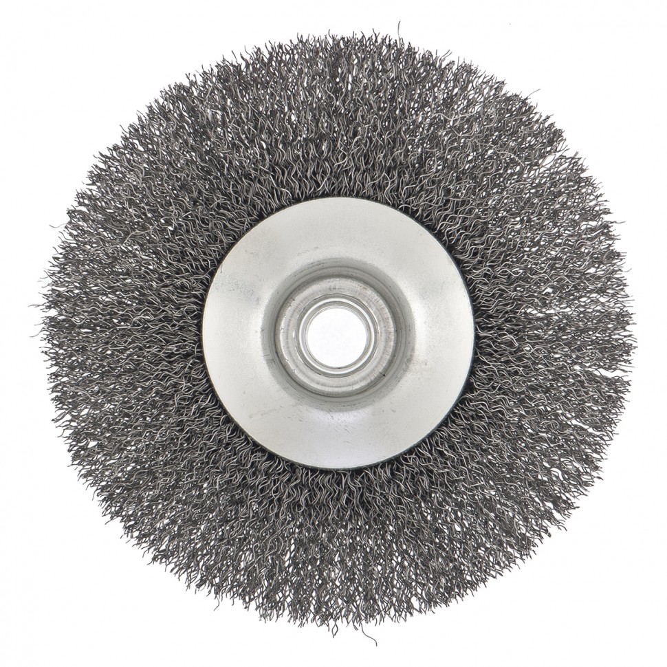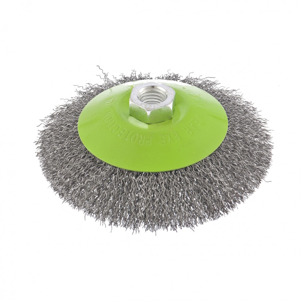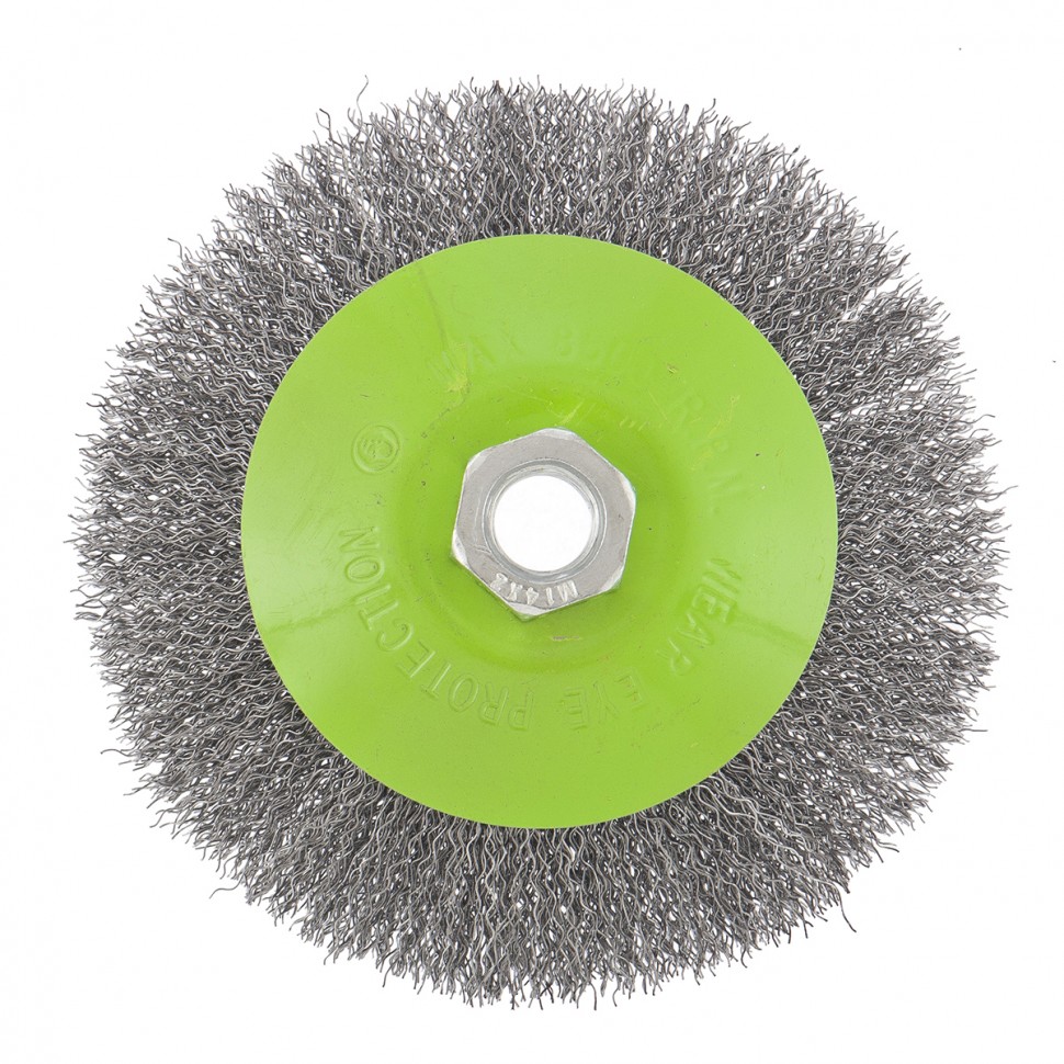Щетка для УШМ «Тарелка» Сибртех 746167, М14, 125 мм, с щетиной из витой проволоки толщиной 0,3 мм, применяется для очистки металлических, деревянных и пластиковых поверхностей от ржавчины, старых лакокрасочных покрытий и загрязнений. Очищает как плоскости, так и труднодоступные места, поэтому оптимальна для обработки изделий сложной формы. Подходит для придания материалу шероховатости и матовости. Щетка устанавливается на вал углошлифовальной машины и выдерживает вращение со скоростью до 12500 об/мин, что обеспечивает высокую производительность оснастки. Во время работы следует использовать средства индивидуальной защиты. Щетка пригодится для проведения ремонта и решения бытовых задач.ПреимуществаДеформационная стойкость щетины — витая проволока принимает исходную форму после снятия нагрузок.Защита от коррозии — корпус покрыт эмалью, а на щетину нанесено техническое масло.Быстрая установка и замена насадки — щетка крепится на вал УШМ при помощи гайки М14.