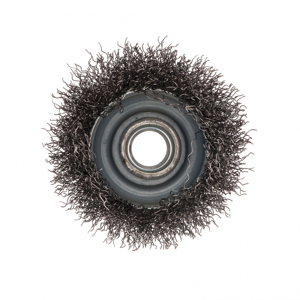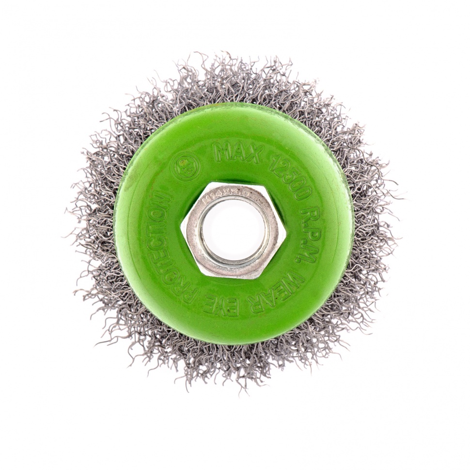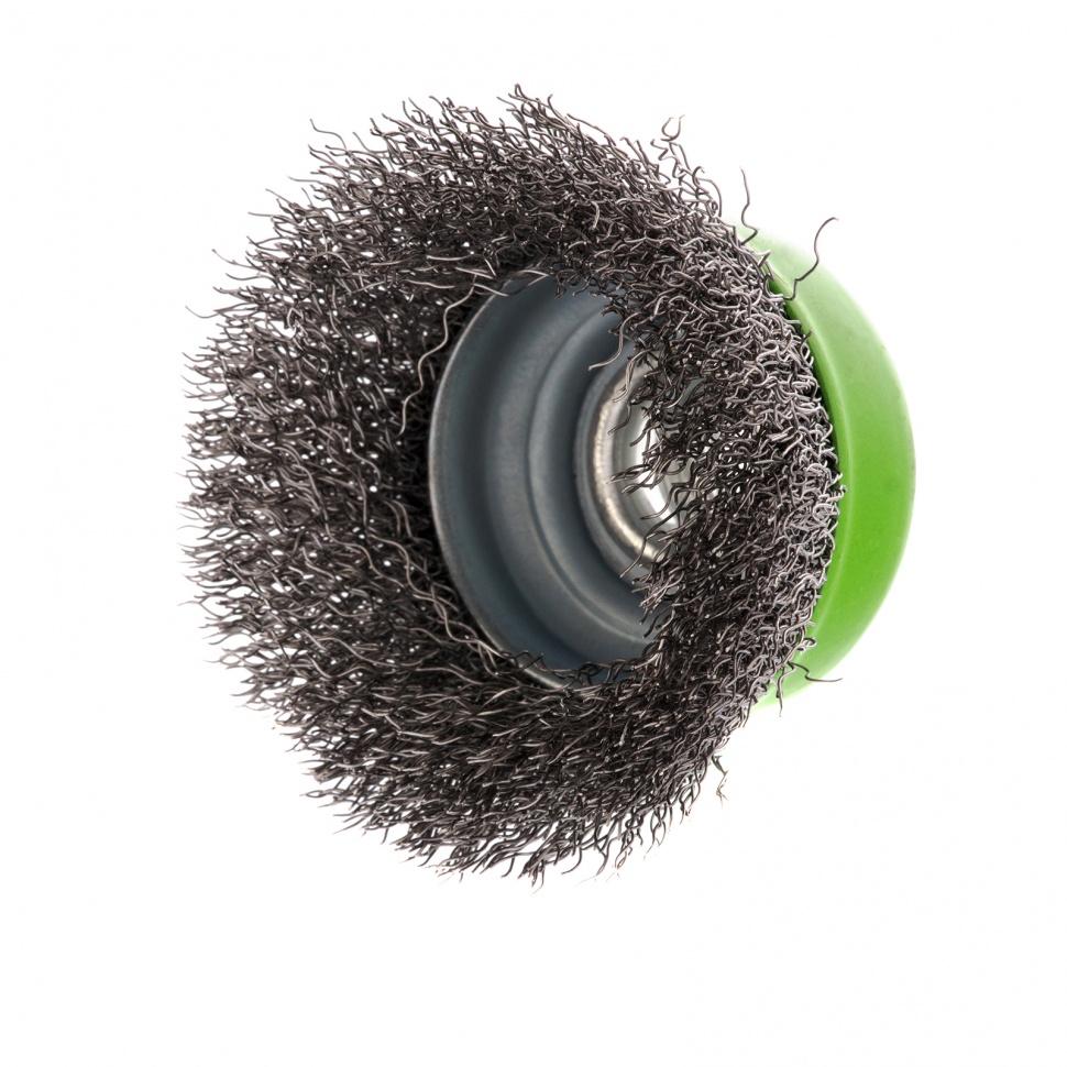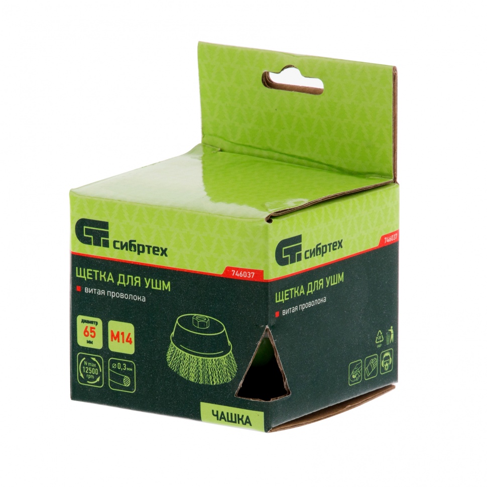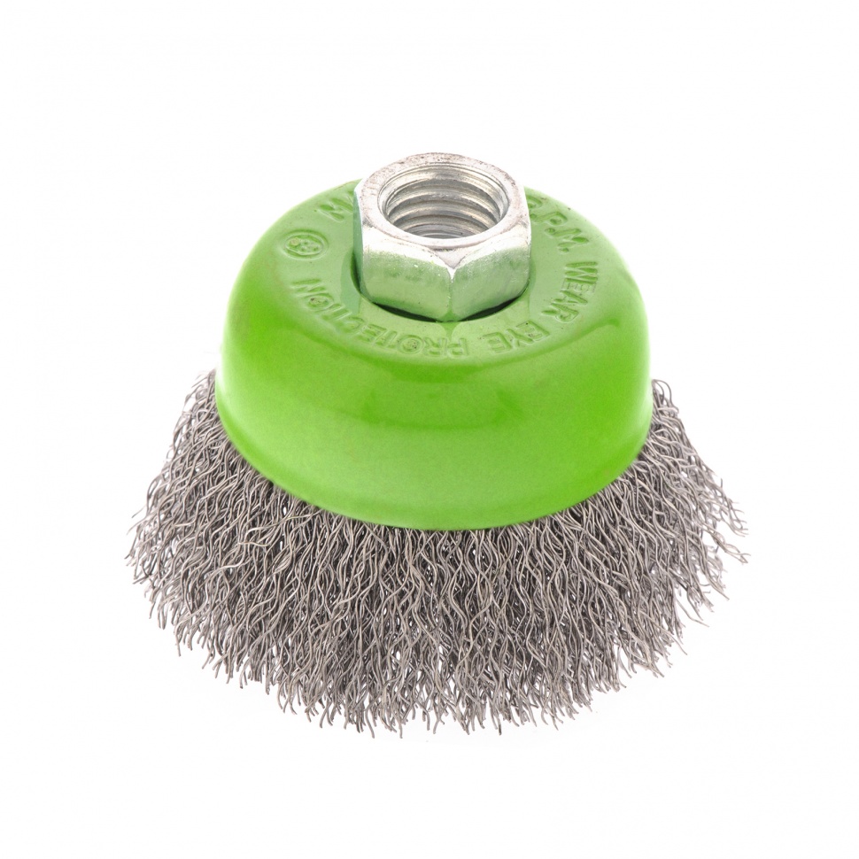 Щетка для УШМ Сибртех «чашка» 746037, М14, диаметром 65 мм, с щетиной из витой проволоки 0,3 мм, предназначена для постепенного снятия тонкого слоя материала с металлических, деревянных и пластиковых поверхностей. Удаляет ржавчину, загрязнения, а также остатки краски и других покрытий. Подходит для обработки участков значительной площади. Щетку устанавливают на вал углошлифовальной машины (УШМ), рекомендуемая максимальная скорость вращения 12500 об/мин. Работать с оснасткой следует в спецодежде.ПреимуществаДеформационная стойкость щетины — витая проволока принимает исходную форму после снятия нагрузок.Защита от коррозии — корпус покрыт эмалью, а на щетину нанесено техническое масло.Быстрая установка и замена насадки — щетка крепится на вал УШМ при помощи гайки М14.