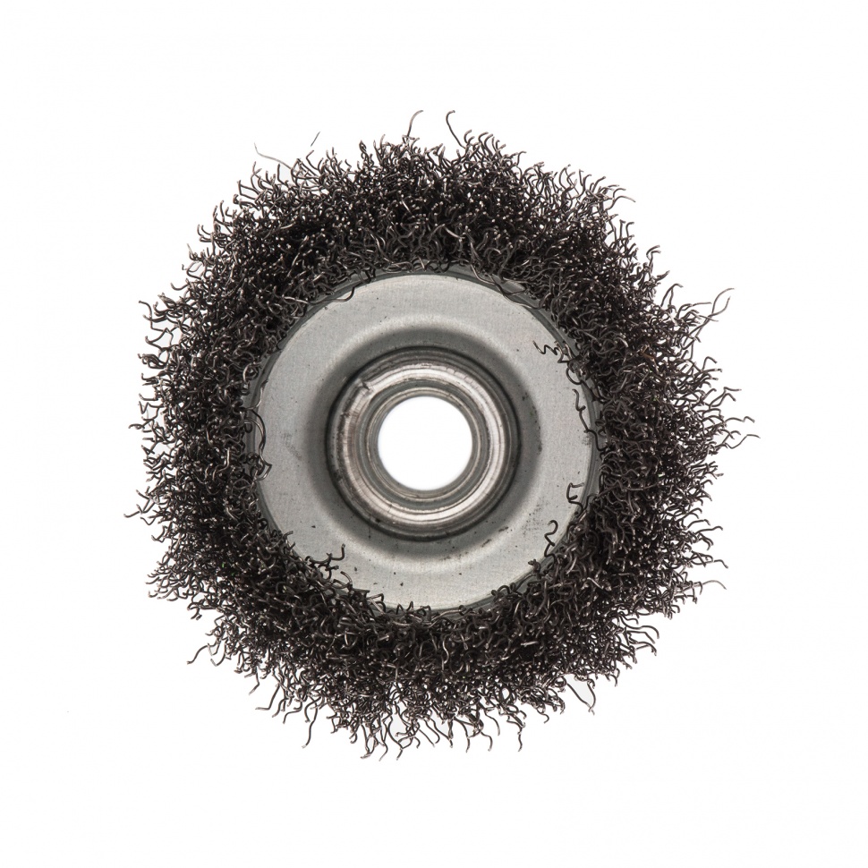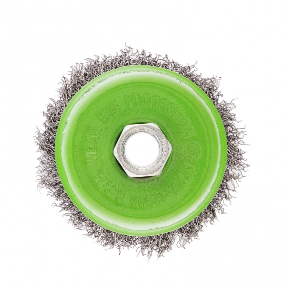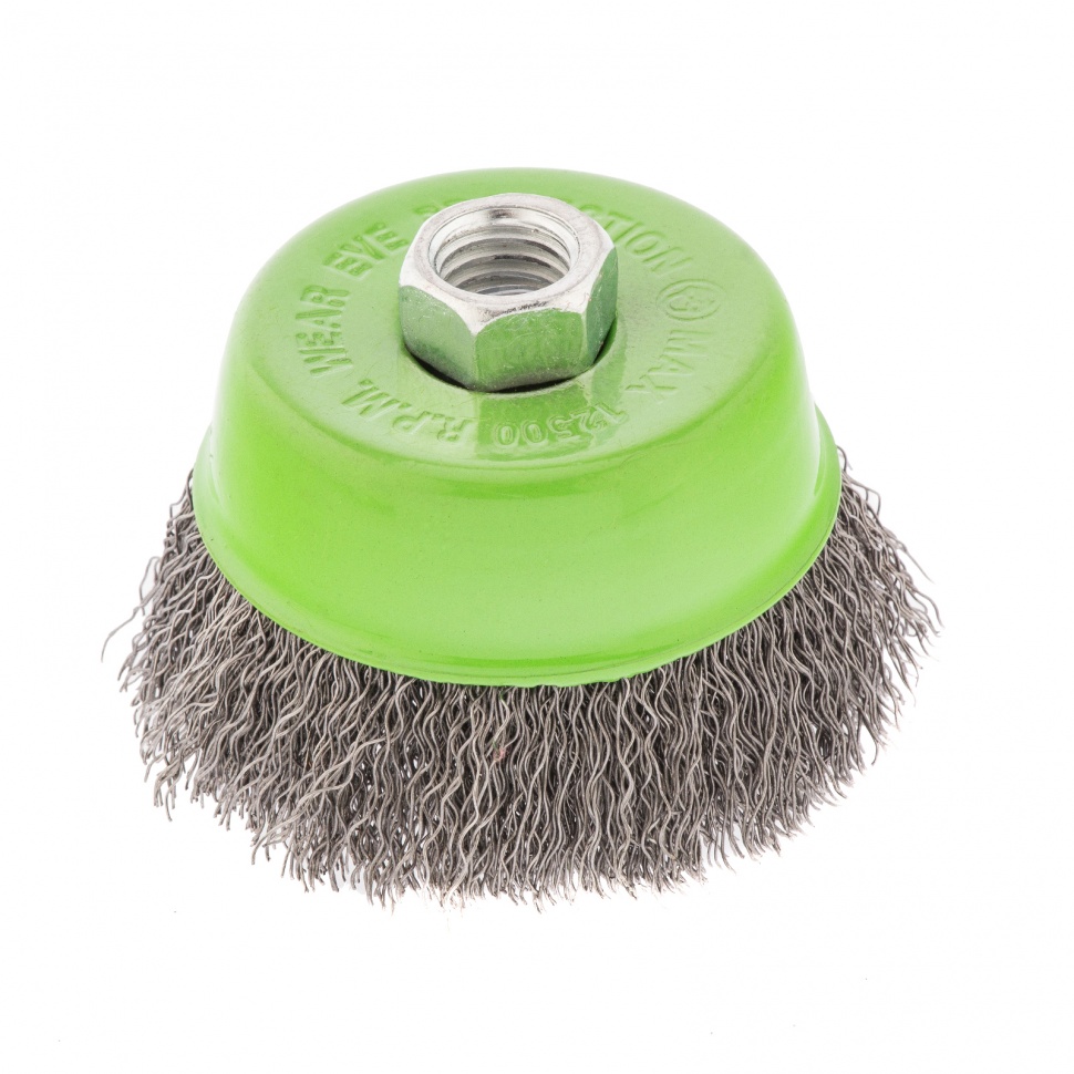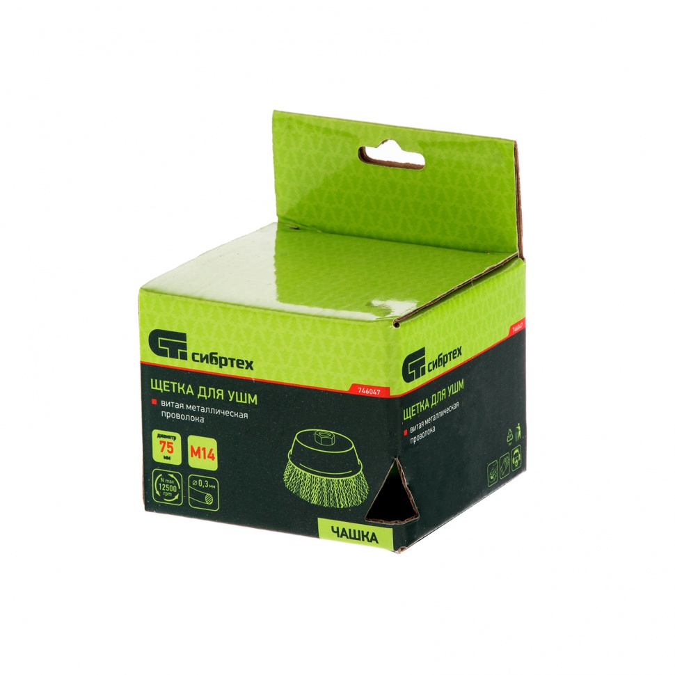 Щетка для УШМ Сибртех «чашка» 746047, М14, диаметром 75 мм, с щетиной из витой проволоки 0,3 мм, предназначена для постепенного снятия тонкого слоя материала с металлических, деревянных и пластиковых поверхностей. Удаляет ржавчину, загрязнения, а также остатки краски и других покрытий. Подходит для обработки участков значительной площади. Щетку устанавливают на вал углошлифовальной машины (УШМ), рекомендуемая максимальная скорость вращения 12500 об/мин. Работать с оснасткой следует в спецодежде.ПреимуществаДеформационная стойкость щетины — витая проволока принимает исходную форму после снятия нагрузок.Защита от коррозии — корпус покрыт эмалью, а на щетину нанесено техническое масло.Быстрая установка и замена насадки — щетка крепится на вал УШМ при помощи гайки М14.