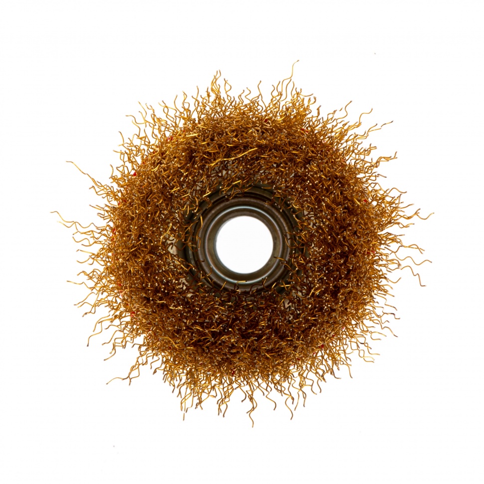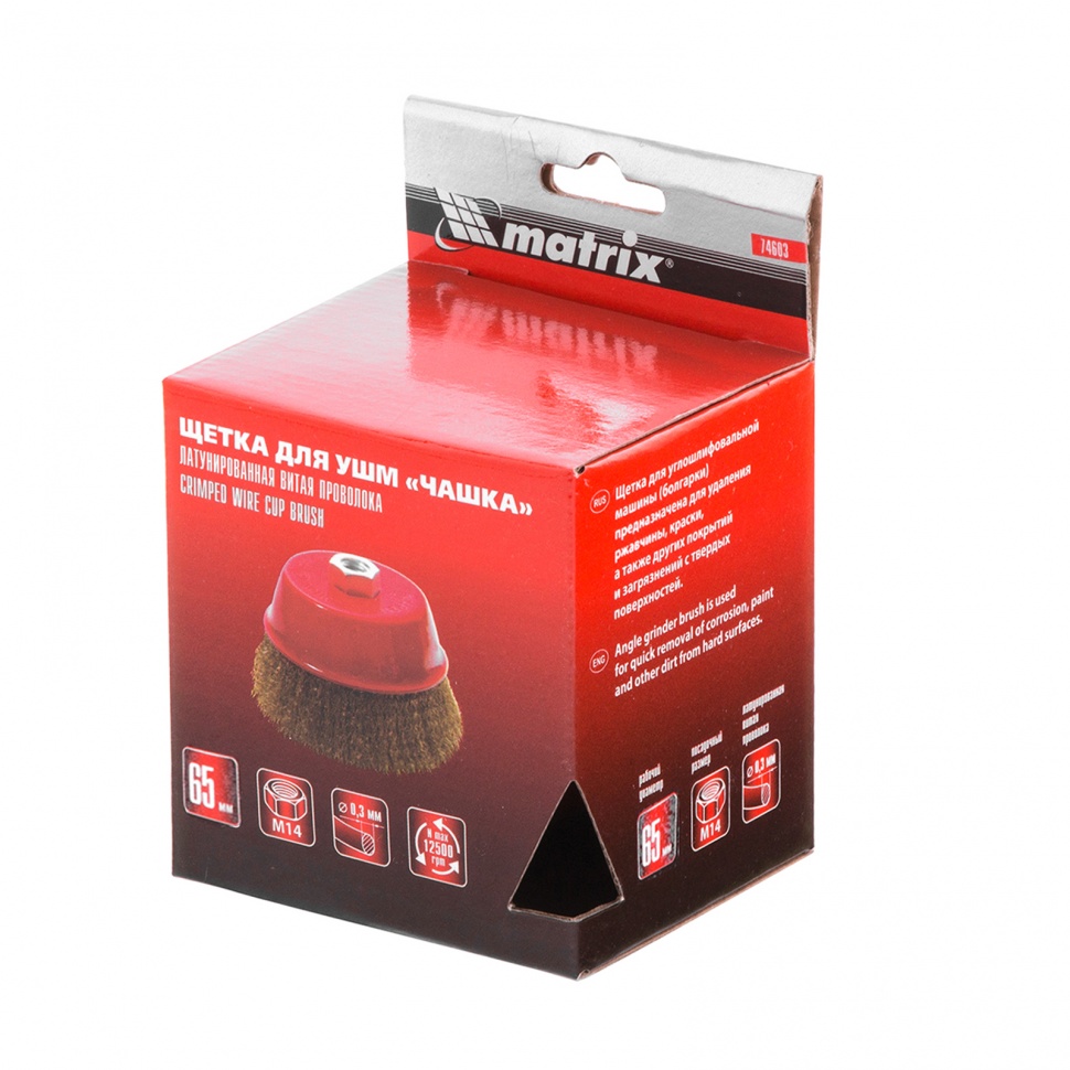 Щетка «чашка» Matrix 74603 диаметром 65 мм, с щетиной из латунированной витой проволоки, устанавливается на вал УШМ с помощью гайки М14. Предназначена для снятия тонкого слоя краски или лака, удаления ржавчины и загрязнений. При рекомендованной скорости вращения 12500 об/мин щеткой можно быстро обрабатывать участки большой площади.ПреимуществаВысокий ресурс — щетина выполнена из прочной стальной проволоки.Универсальность — щетка подходит для обработки древесины, металла, пластика и других твердых поверхностей.Аккуратная работа — витая щетина снимает тонкий слой материала.Коррозионная стойкость — корпус щетки покрыт защитной эмалью, щетина латунирована.