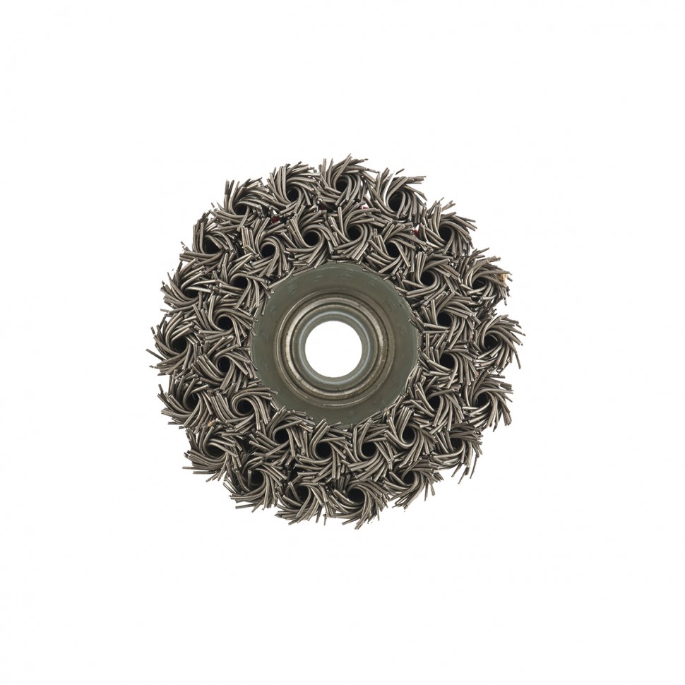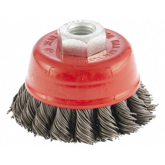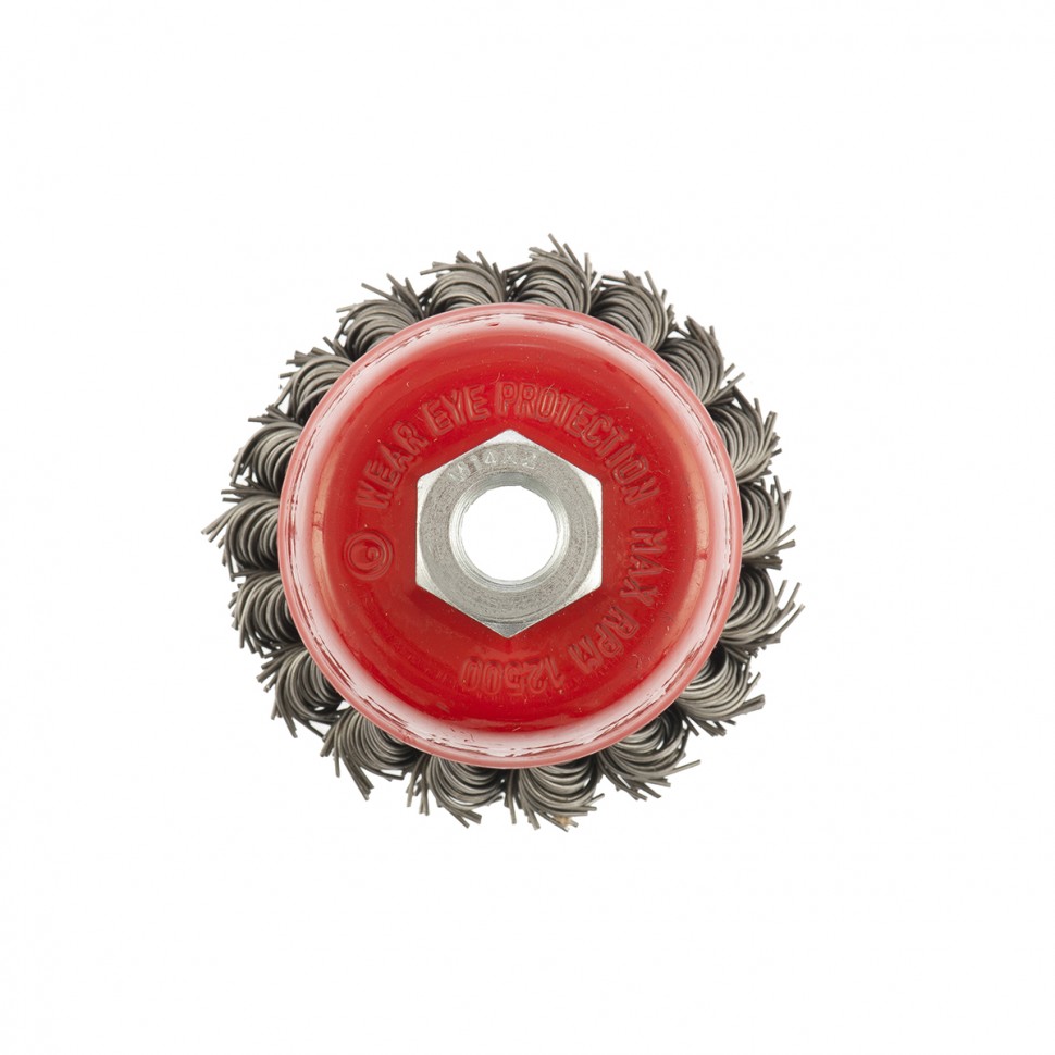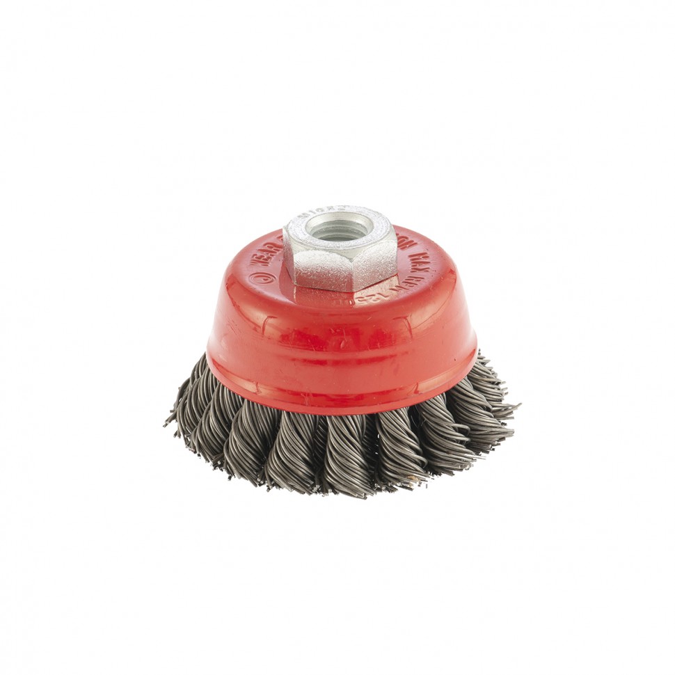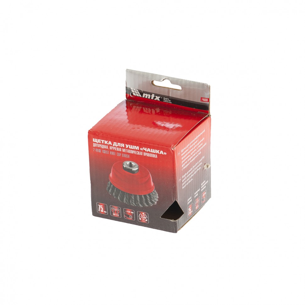 Двухрядная щетка Matrix «Чашка» 74686 диаметром 75 мм, с щетиной из крученой проволоки толщиной 0,8 мм, устанавливается на вал углошлифовальной машины с помощью гайки М14. Рекомендованная максимальная скорость вращения — до 12500 об/мин. Оснастка оптимальна для грубой (черновой) обработки: снятия старого слоя лакокрасочного покрытия и ржавчины, удаления загрязнений, зачистки сварных швов. Эффективно справляется с зачисткой больших поверхностей, подходит для выполнения работ повышенной сложности.ПреимуществаПрочность и долговечность — стальная крученая проволока выдерживает интенсивную эксплуатацию.Универсальность — щеткой можно обрабатывать любые твердые материалы: металл (в том числе цветной), древесину, пластик и т. д.Высокая производительность — двухрядная щетка за один проход снимает большое количество материала, не снижая качество работы.Эффективная работа — щетка очищает поверхности более агрессивно, чем изделия с щетиной 0,5 мм.Защита от коррозии — корпус оцинкован, щетина покрыта техническим маслом.