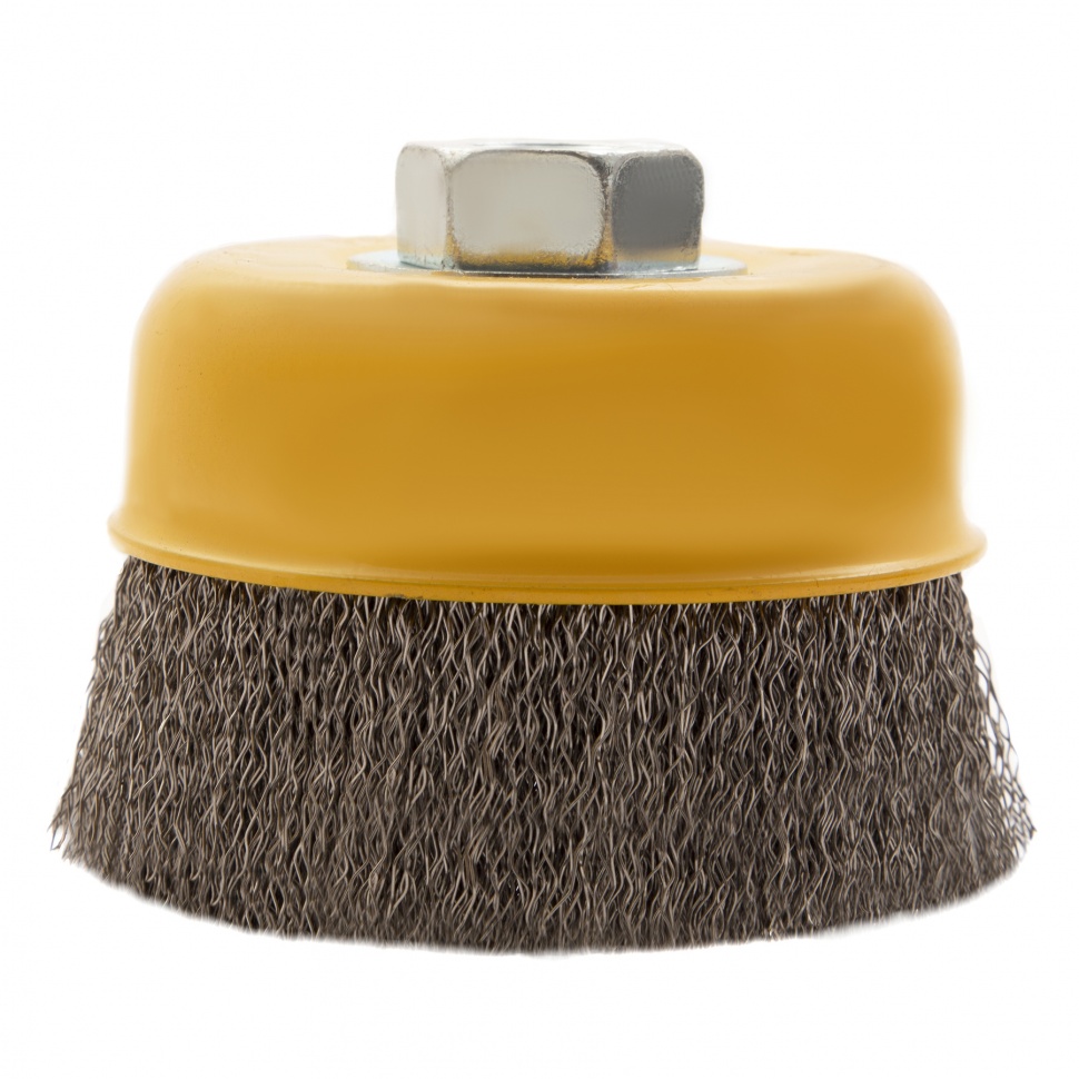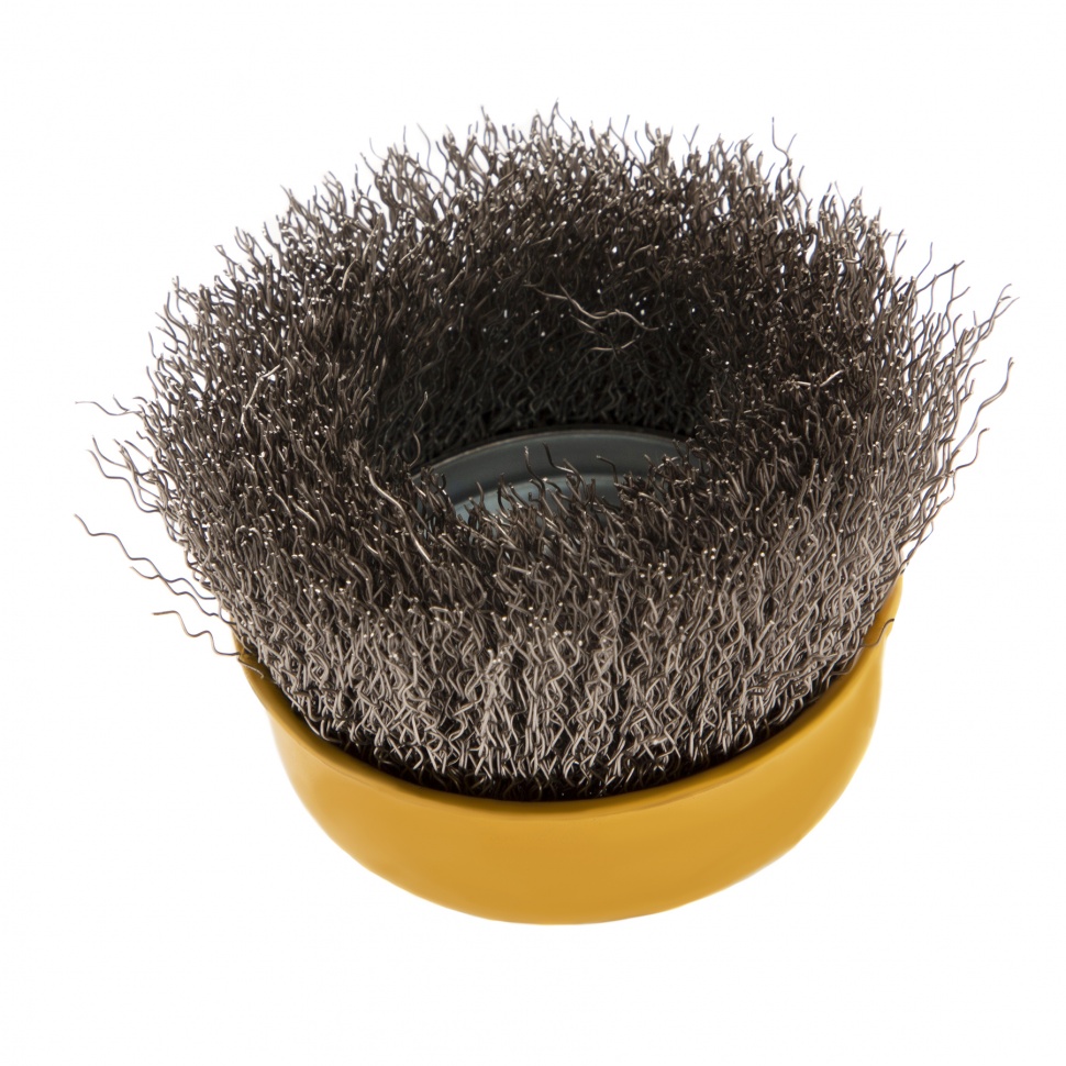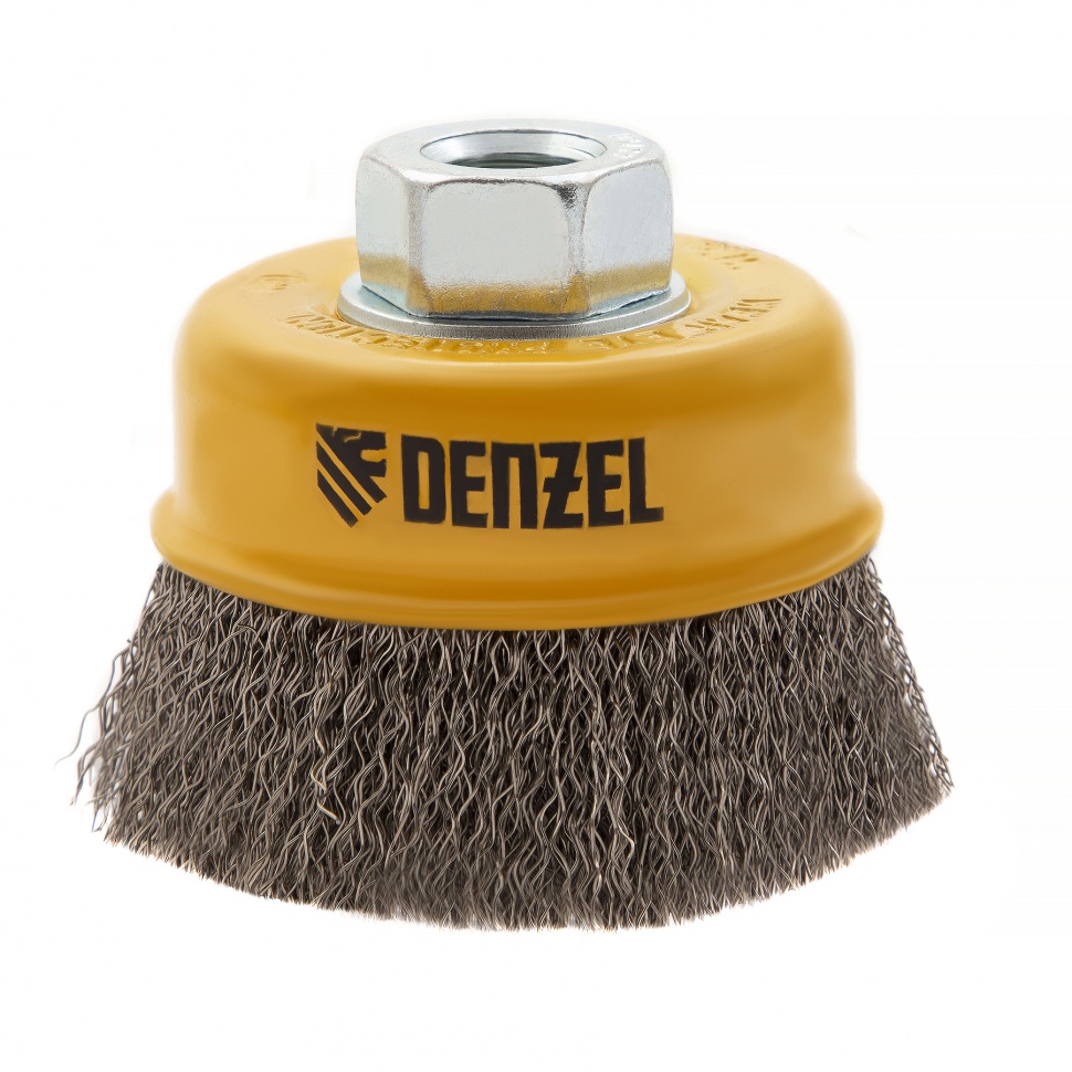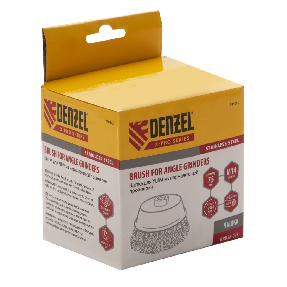 Щетка для УШМ «Чашка» Denzel 746043, М14, диаметром 75 мм, с щетиной из витой нержавеющей проволоки диаметром 0,3 мм, позволяет быстро и аккуратно очистить металлическую, деревянную или пластиковую поверхность от незначительных загрязнений и ржавчины, а также удалить остатки лакокрасочных материалов, сделать поверхность шероховатой или матовой. Насадка подходит для очистки плоских участков большой площади. Поскольку щетина выполнена из нержавеющей стали, щетку можно использовать для обработки изделий из нержавейки. Щетка устанавливается на вал углошлифовальной машины (УШМ) и предназначена для работы с максимальной скоростью 12500 об/мин. Во время работы обязательно соблюдение техники безопасности и использование средств индивидуальной защиты. Щетку применяют в строительстве, на производстве, а также в быту.ПреимуществаЩетина изготовлена из нержавеющей стали AISI 201, поэтому ее частицы не вызывают микрокоррозии обрабатываемой поверхности.Проволока имеет витую форму, что обеспечивает высокую деформационную стойкость щетины.Щетина из нержавейки и покрытый эмалью корпус не подвержены коррозии, поэтому насадку можно использовать в условиях повышенной влажности.Для крепления на вал УШМ предусмотрена гайка М14, что позволяет быстро устанавливать и заменять оснастку.Корпус и гайка усилены, поэтому щетка устойчива к повышенным нагрузкам.Щетка изготовлена под строгим технологическим контролем, что гарантирует ее высокое качество.