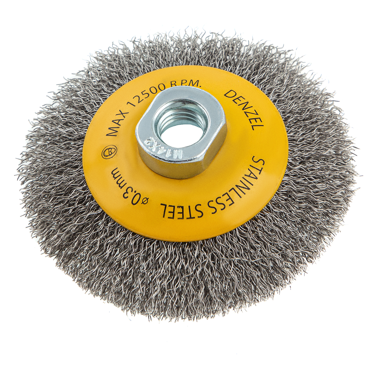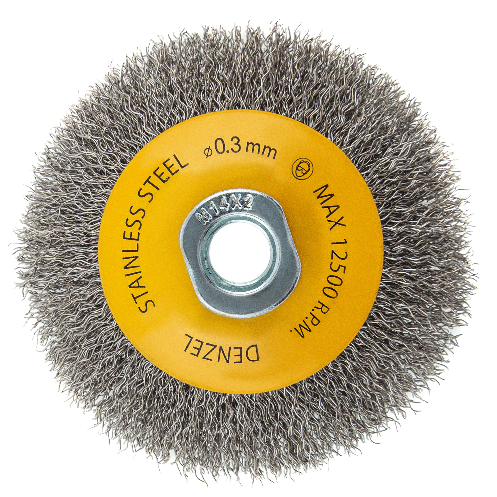 Щетка для УШМ Denzel «Тарелка» 746083, М14, 100 мм, с щетиной из витой нержавеющей проволоки диаметром 0,3 мм, используется для щадящей очистки металлических, деревянных или пластиковых поверхностей от незначительных загрязнений и ржавчины, а также остатков лакокрасочных материалов. Поможет придать поверхности шероховатость или матовость. Насадка является универсальной и подходит для обработки как плоскостей, так и углов, а также других труднодоступных участков. Оптимальна для обработки изделий из нержавейки. Насадка устанавливается на вал углошлифовальной машины (УШМ), рекомендуемая максимальная скорость составляет 12500 об/мин. Во время работы следует соблюдать технику безопасности и использовать средства индивидуальной защиты. Щетку применяют в строительстве, на производстве, а также в домашнем хозяйстве.ПреимуществаЩетина изготовлена из нержавеющей стали AISI 201, поэтому ее частицы не вызывают микрокоррозии обрабатываемой поверхности.Проволока имеет витую форму, что обеспечивает высокую деформационную стойкость щетины.Щетина из нержавейки и покрытый эмалью корпус не подвержены коррозии, поэтому насадку можно использовать в условиях повышенной влажности.Для крепления на вал УШМ предусмотрена гайка М14, что позволяет быстро устанавливать и заменять оснастку.Корпус и гайка усилены, поэтому щетка устойчива к повышенным нагрузкам.Щетка изготовлена под строгим технологическим контролем, что гарантирует ее высокое качество.