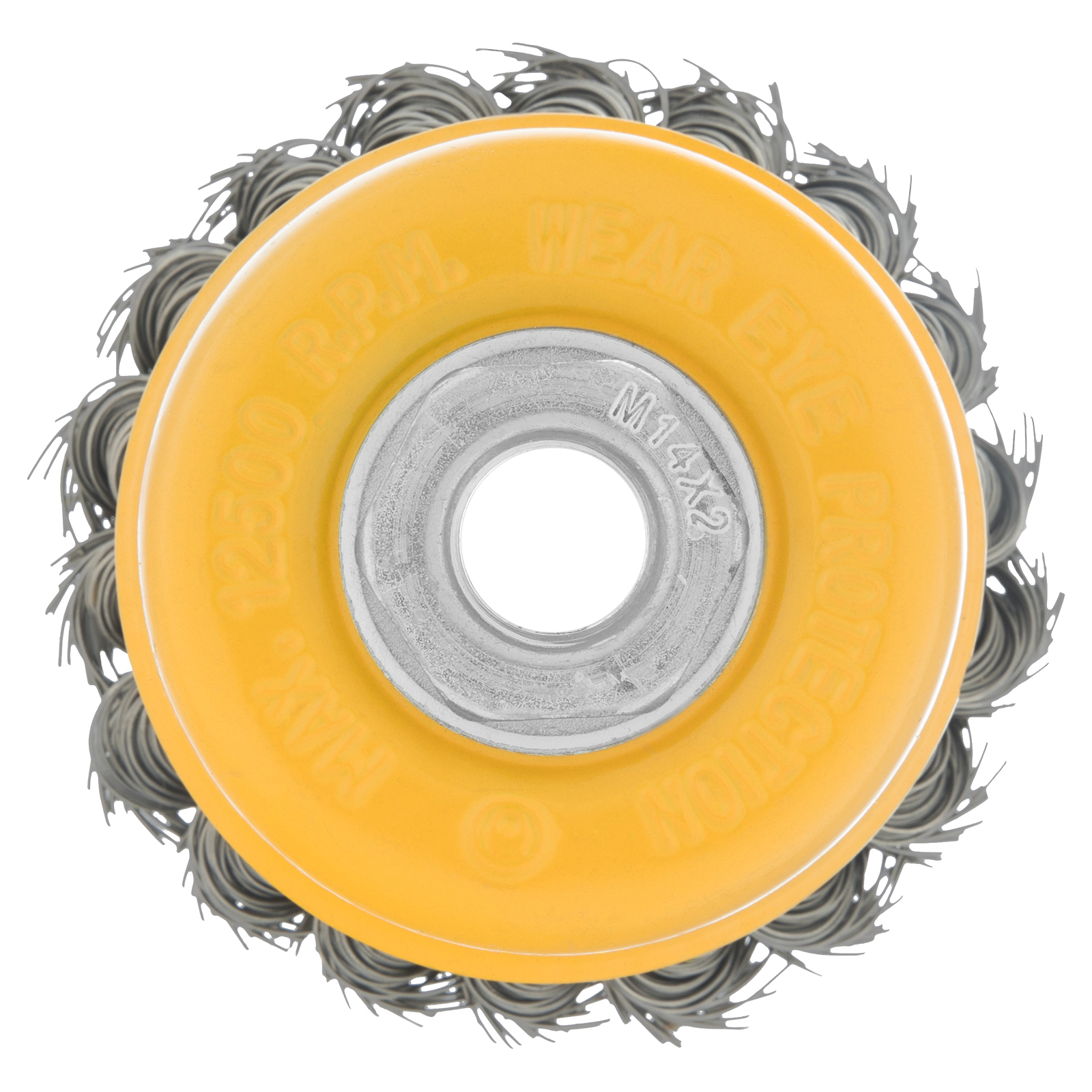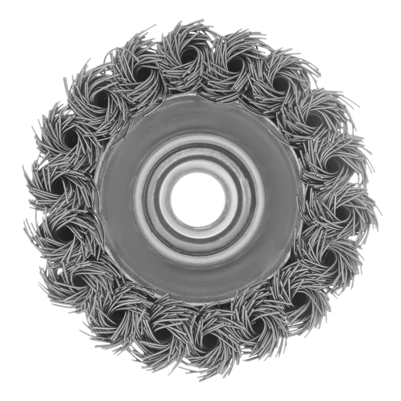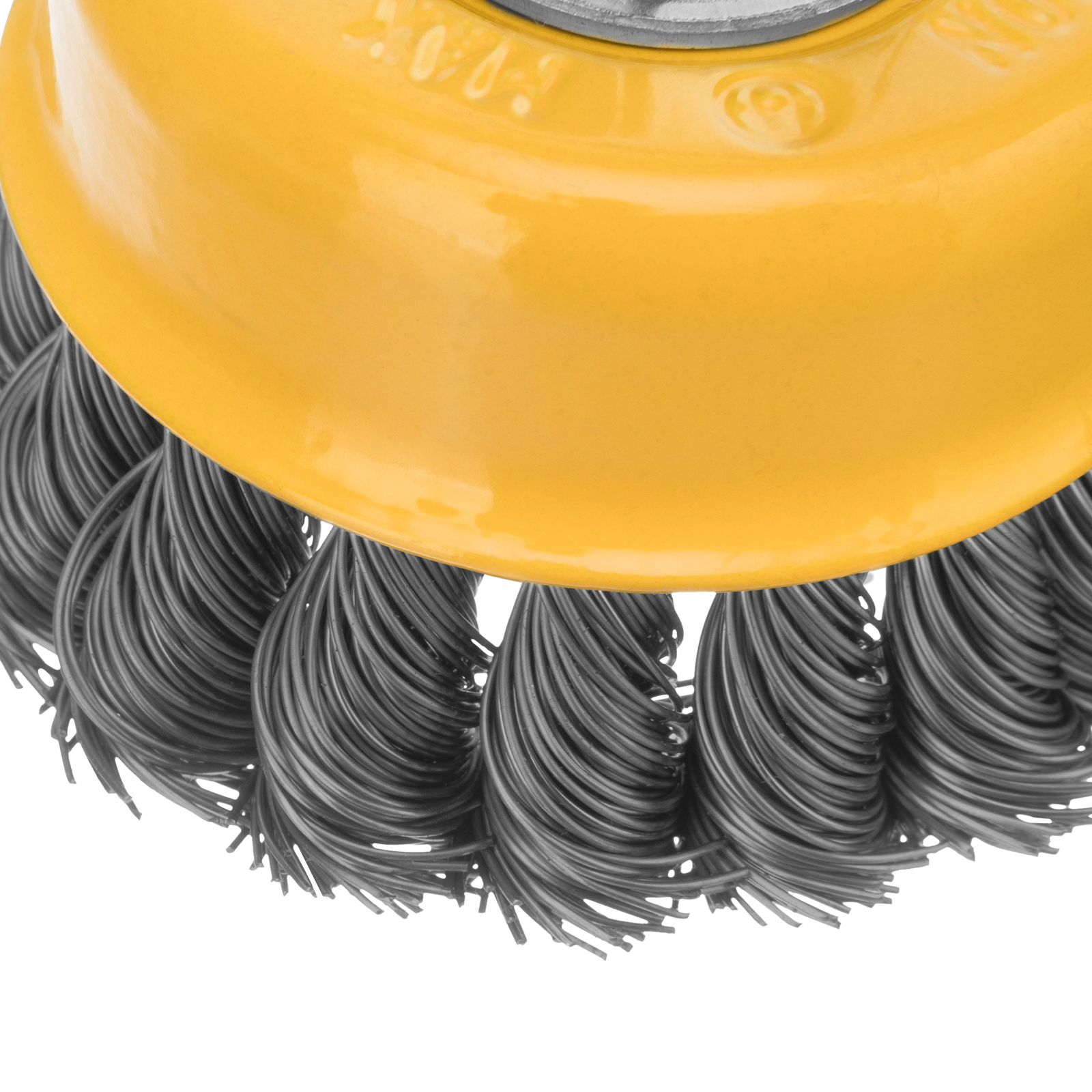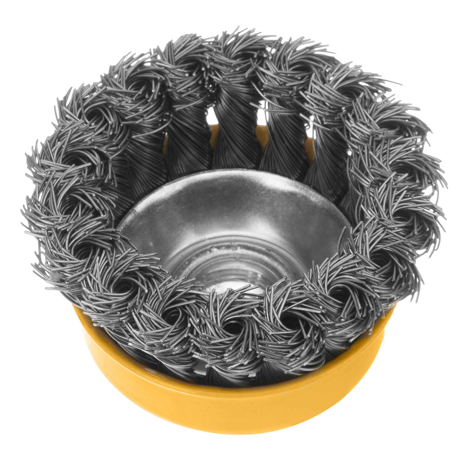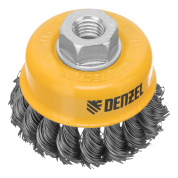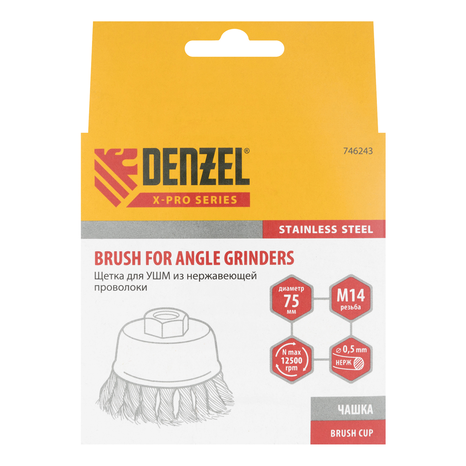 Щетка для УШМ «Чашка» Denzel 746243, М14, диаметром 75 мм, с щетиной из крученой нержавеющей проволоки диаметром 0,5 мм, предназначена для грубой очистки твердых поверхностей от ржавчины, лакокрасочных покрытий, загрязнений, удаления заусенцев, а также для зачистки сварных швов. Снимает толстый слой материала, идеально подходит для обработки изделий из нержавеющей стали. Щетка имеет форму чашки и позволяет очищать участки большой площади. Оснастку устанавливают на вал углошлифовальной машины. Рекомендуемая максимальная скорость вращения составляет 12500 об/мин. Во время работы следует использовать средства индивидуальной защиты — очки, респиратор, наушники, перчатки, а также специальную одежду и обувь. Щетка применяется в строительстве, на производстве, а также в быту.ПреимуществаПроволока толщиной 0,5 мм, скрученная в пучки, придает щетине устойчивость к повышенным нагрузкам.Покрытый эмалью корпус и щетина из нержавеющей стали AISI 201 не ржавеют, поэтому щетку можно использовать в условиях сильной влажности.Частицы проволоки из нержавейки, остающиеся на обрабатываемой поверхности, не вызывают ее коррозии.Усиленный корпус и гайка обеспечивают повышенную прочность щетки.Крепление на гайку М14 ускоряет установку и замену оснастки.Строгий контроль качества на всех этапах производства подтверждает надежность щетки.
