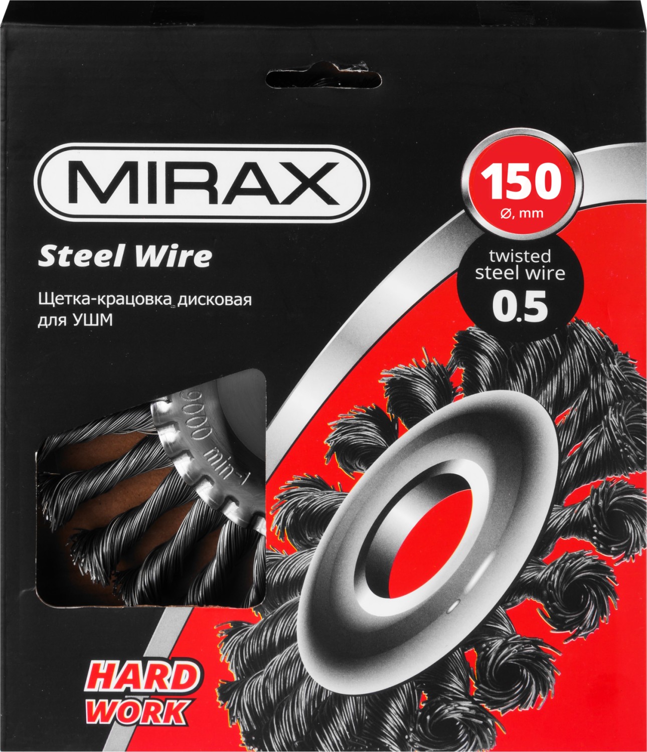 —MIRAX 150 мм, жгутированная стальная проволока 0.5 мм, щетка дисковая для УШМ (35140-150)