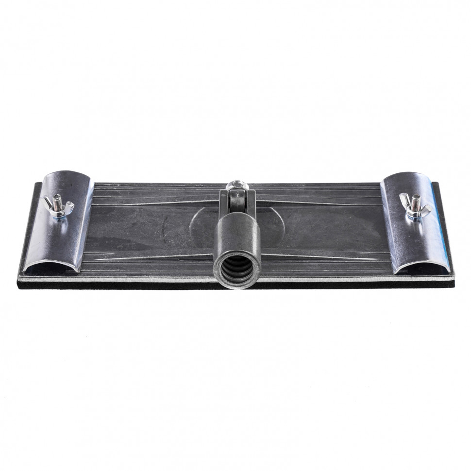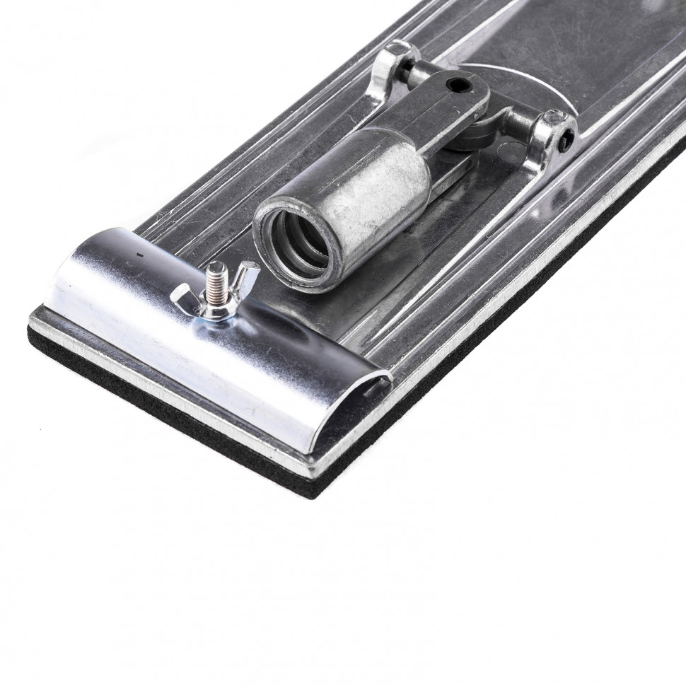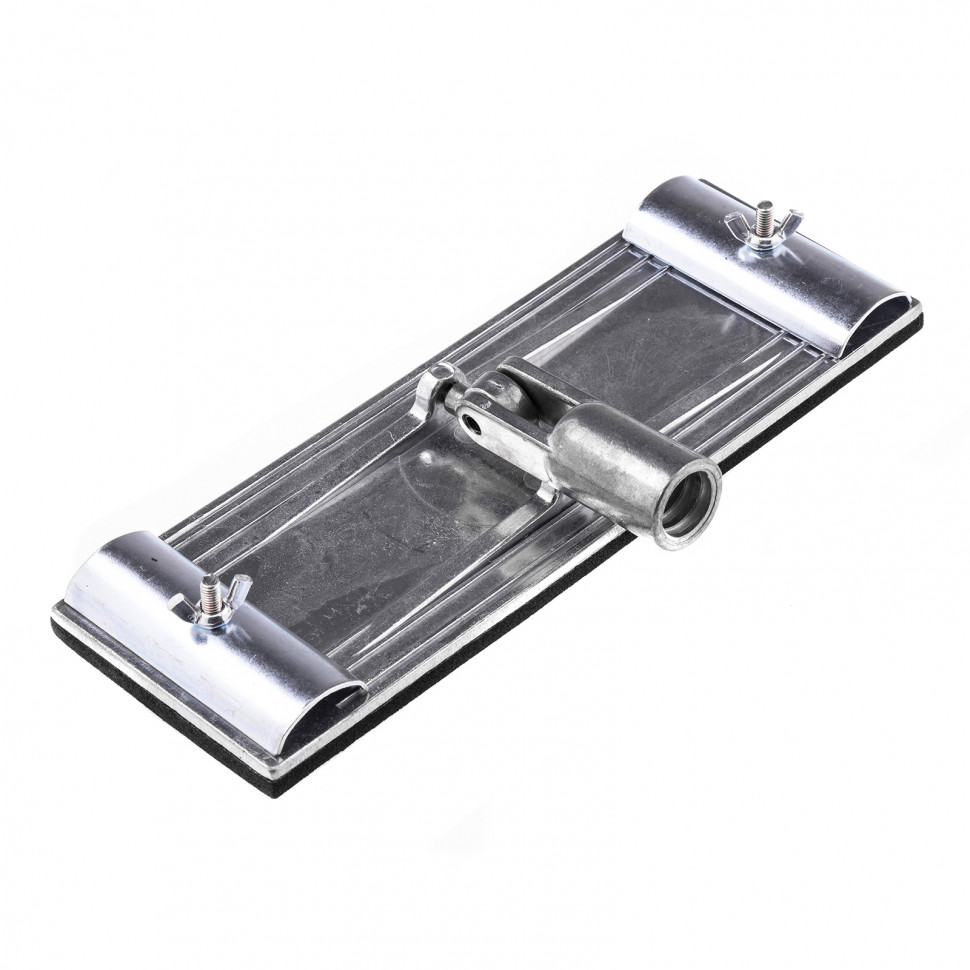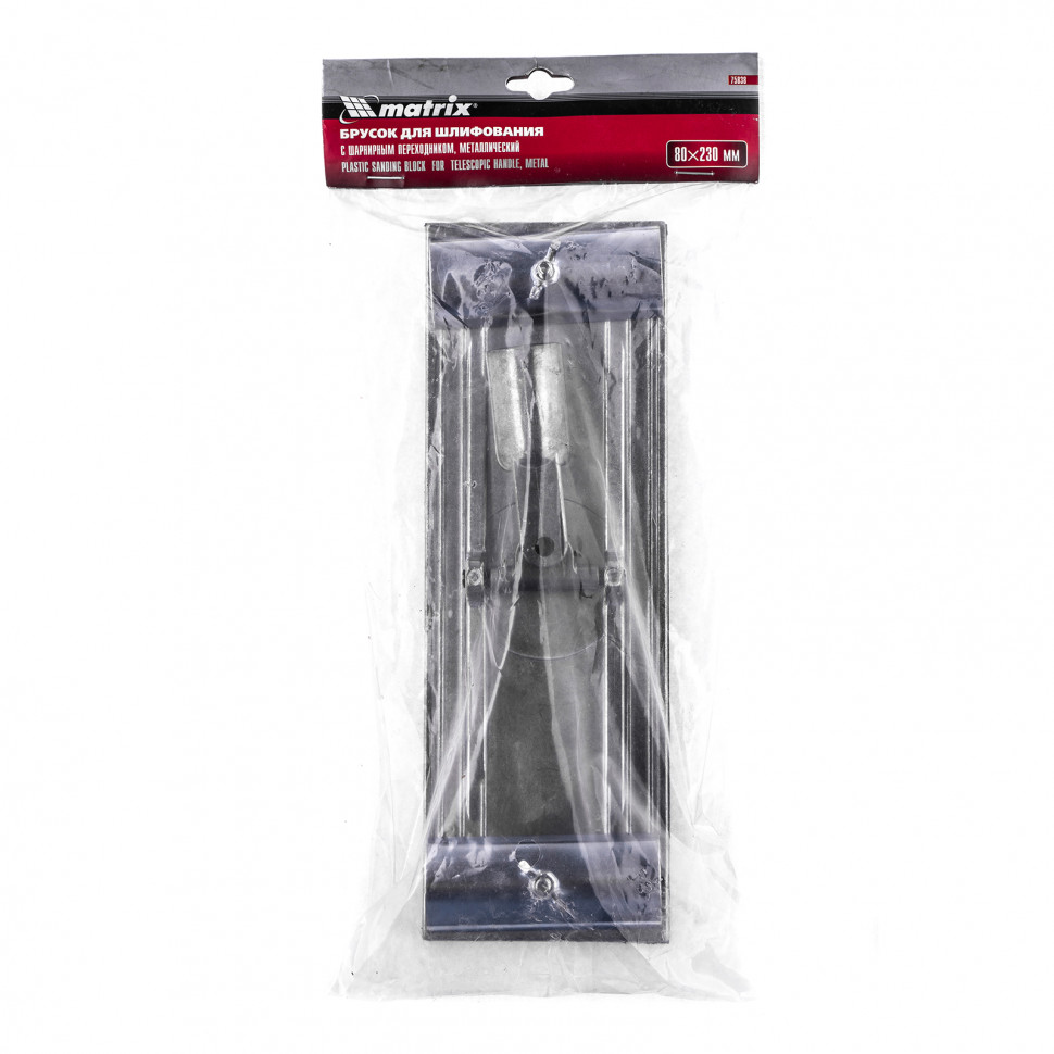 Брусок для шлифования Matrix 75838, 230 х 80 мм предназначен для абразивной обработки поверхностей с помощью зафиксированного шлифлиста или сетки любой зернистости. Он используется для подготовки потолков, стен, различных материалов к отделочным работам. Благодаря возможности установки на шарнирный переходник раздвижной ручки брусок особенно удобен при шлифовке поверхностей, расположенных на высоте.ПреимуществаИнструмент оснащен винтовыми зажимами — шлифовальный материал крепко фиксируется и не сползает при использовании.Шарнирное крепление для ручки обеспечивает движение бруска в любом направлении, облегчая работу.Подсоединение к телескопической ручке-удлинителю дает возможность ускорить шлифовку потолков и стен, особенно в труднодоступных местах.Брусок изготовлен из алюминиевого сплава, а значит, прослужит долго и не сломается.