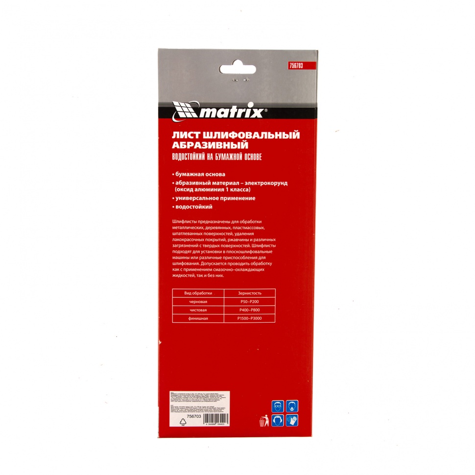Шлифлист Matrix 756703 размером 115 х 280 мм оптимален для промежуточной обработки. Устанавливается в плоскошлифовальную машину, а также различные шлифовальные приспособления, либо применяться для ручной обработки. Среднезернистый электрокорунд Р150 способен справиться с тонким слоем эмали, лака, краски, удалением налета ржавчины и загрязнений, подготовкой поверхности к отделке.ПреимуществаУниверсальность — шлифлист предназначен для обработки различных поверхностей: деревянных, металлических, пластмассовых, шпаклеванных, в том числе подготовленных под отделку и покраску.Абразив из оксида алюминия 1-го класса — твердые крупицы заостренной формы обеспечивают высокую скорость обработки.Возможность обработки неровных поверхностей — бумажная основа в сочетании с тонкой структурой листа обеспечивают высокую чувствительность к рельефу поверхности.Водостойкость — шлифлист может использоваться для сухой и мокрой обработки поверхностей.Удобная упаковка — набор состоит из 5 штук.