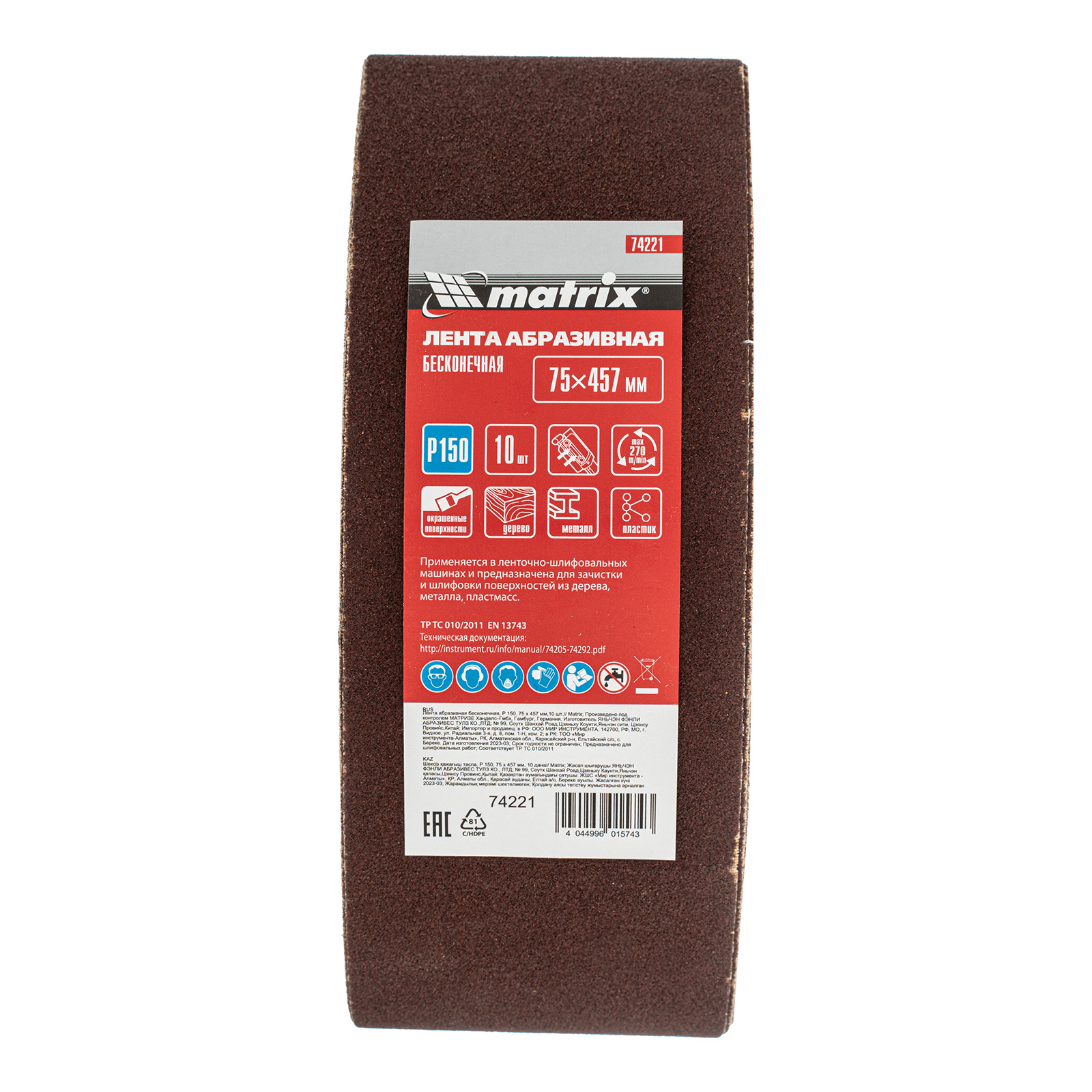 Абразивная лента Matrix Р150 арт. 74221 используется на ленточных шлифовальных машинах с размером сменных элементов 75 х 457 мм. Применяется для финишной обработки деревянных и металлических поверхностей.ПреимуществаВысокая скорость обработки — зерно из оксида алюминия твердое и имеет заостренную форму.Лента с зернистостью Р150 оптимальна для финишной обработки материалов, получения гладкой поверхности для дальнейшего нанесения лака, эмали и т.д.Лента упакована по 10 штук, а значит, ее хватит надолго.
