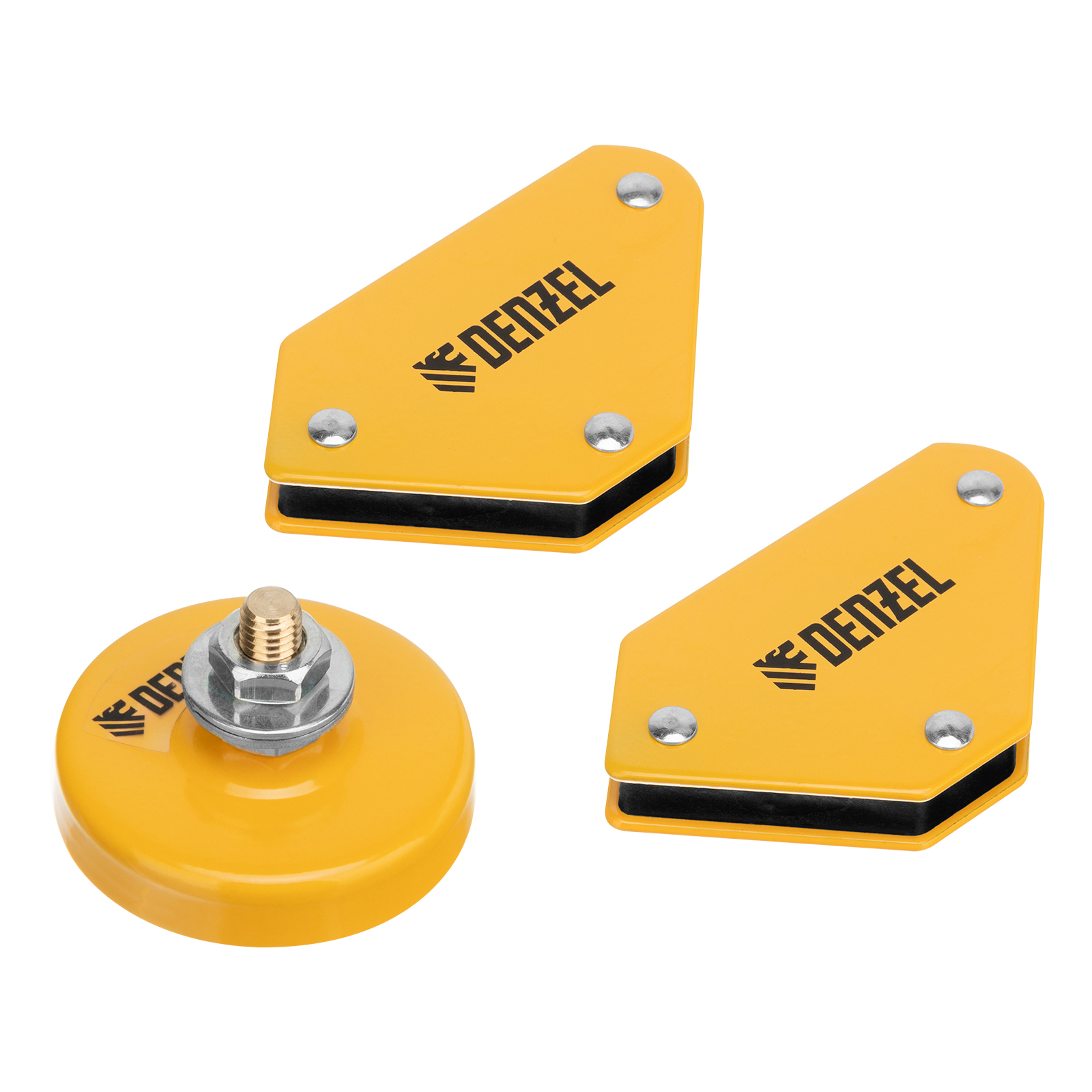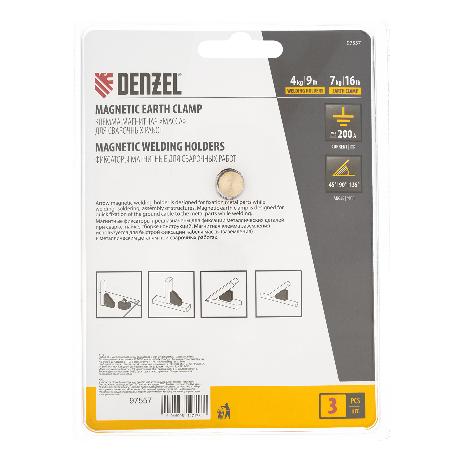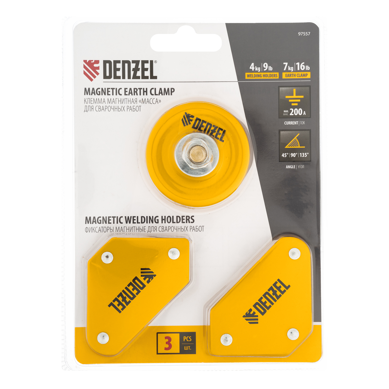 Набор из 2 магнитных фиксаторов и магнитной клеммы «масса» Denzel 97557 предназначен для проведения сварочных работ, пайки и монтажа металлоконструкций. Клемма с максимальным током 200 А обеспечивает электрическое соединение кабеля заземления и обрабатываемой детали, без которого невозможна ручная дуговая сварка. А магнитные уголки фиксируют свариваемые детали весом до 4 кг в нужном положении, благодаря чему мастер может работать в одиночку.ПреимуществаПрочность и долговечность — элементы набора устойчивы к ударам и внешним повреждениям благодаря износостойкому корпусу.Универсальное решение для разных задач — с помощью магнитных уголков можно выставлять элементы под углом 45, 90 или 135 градусов или использовать их одновременно для выстраивания более сложных конструкций.Простое применение — пользоваться инструментами интуитивно понятно и удобно, они не требуют сложного обслуживания.