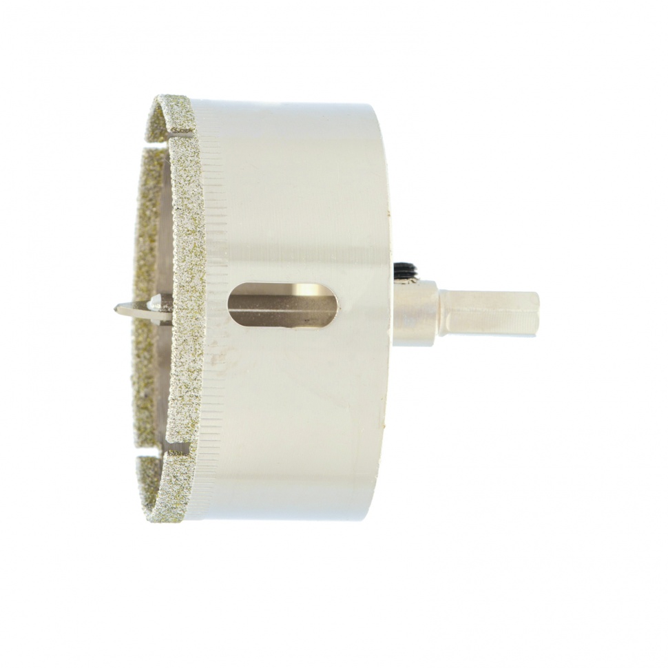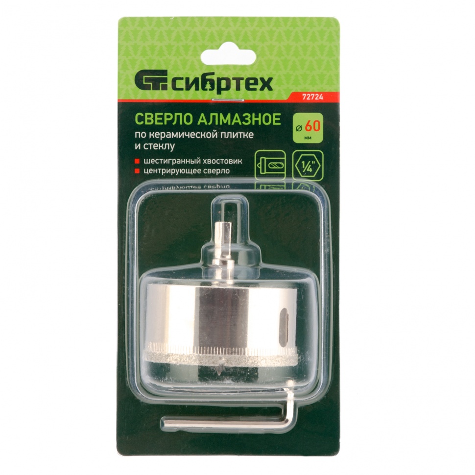 Сверло Сибртех 72724, 60 х 55 м, с 6-гранным хвостовиком и центрирующим сверлом позволяет сверлить отверстия в керамической плитке и стекле. Его устанавливают на дрель или шуруповерт, рекомендуемый диапазон рабочих оборотов 350-700 об/мин. Благодаря 6-гранному хвостовику сверло не проворачивается в патроне электроинструмента. После заглубления алмазной коронки на 1-2 мм рекомендуется снять центрирующее сверло, это поможет увеличить его ресурс. Применение водяного охлаждения значительно повышает срок службы оснастки. Ее используют при выполнении бытовых ремонтных и отделочных работ.ПреимуществаКоронка изготовлена из среднеуглеродистой стали марки 45, поэтому выдерживает повышенные механические нагрузки.Центрирующее сверло быстро заглубляется в материал, не давая коронке сдвигаться во время сверления.Центровик является съемным, при необходимости его можно заменить на сверло Сибртех 72709.Коррозионностойкое покрытие защищает оснастку от ржавчины при мокром сверлении, продлевая срок ее службы.