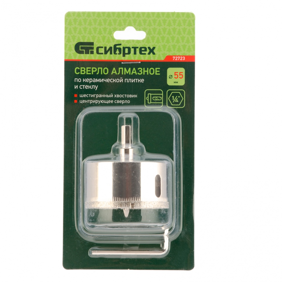 Сверло Сибртех 72723, 55 х 55 м, с 6-гранным хвостовиком и центрирующим сверлом позволяет сверлить отверстия в керамической плитке и стекле. Его устанавливают на дрель или шуруповерт, рекомендуемый диапазон рабочих оборотов 350-700 об/мин. Благодаря 6-гранному хвостовику сверло не проворачивается в патроне электроинструмента. После заглубления алмазной коронки на 1-2 мм рекомендуется снять центрирующее сверло, это поможет увеличить его ресурс. Применение водяного охлаждения значительно повышает срок службы оснастки. Ее используют при выполнении бытовых ремонтных и отделочных работ.ПреимуществаКоронка изготовлена из среднеуглеродистой стали марки 45, поэтому выдерживает повышенные механические нагрузки.Центрирующее сверло быстро заглубляется в материал, не давая коронке сдвигаться во время сверления.Центровик является съемным, при необходимости его можно заменить на сверло Сибртех 72709.Коррозионностойкое покрытие защищает оснастку от ржавчины при мокром сверлении, продлевая срок ее службы.