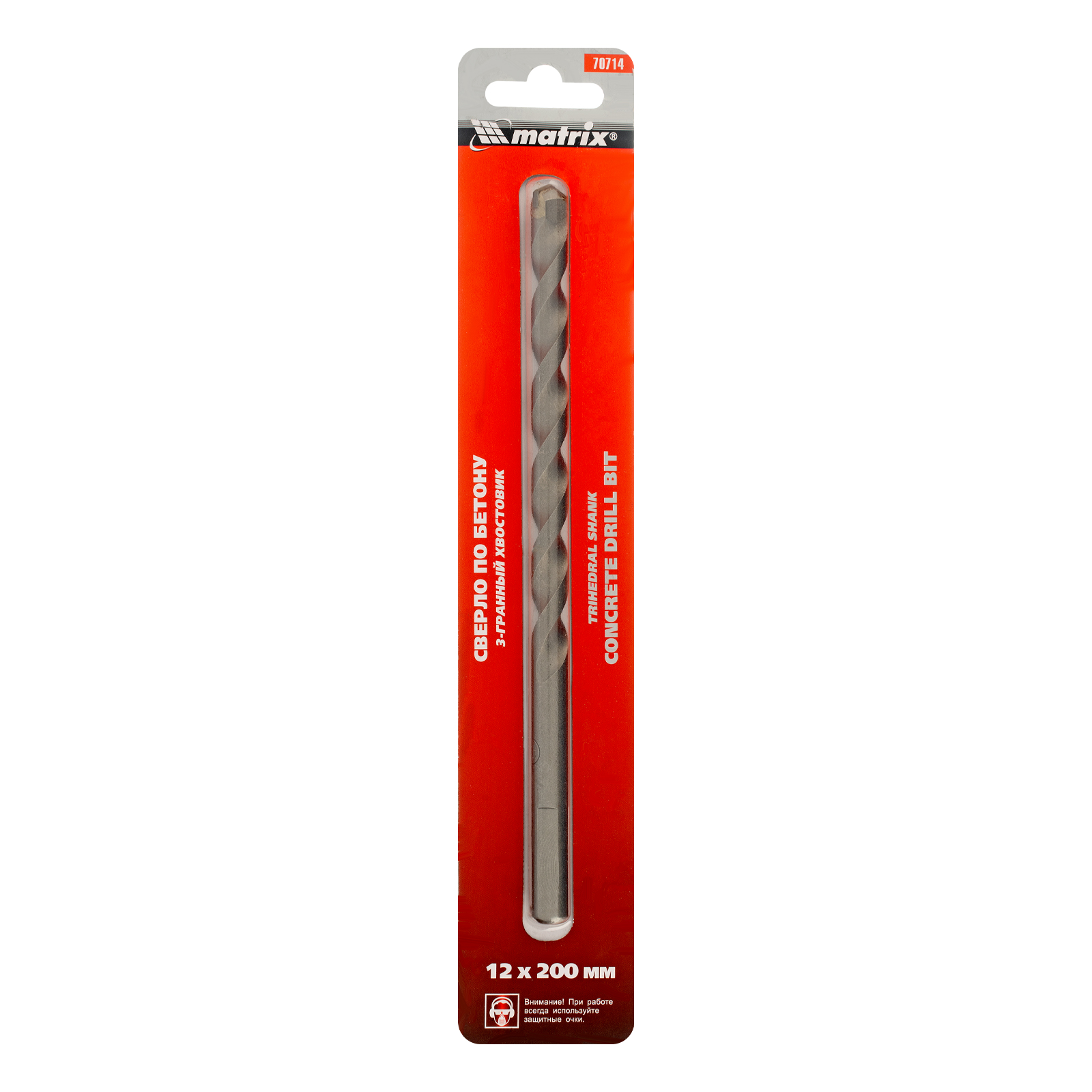 Сверло по бетону Matrix 70714 размером 12 х 200 мм, с 3-гранным хвостовиком, используется для получения отверстий с помощью дрели. Пригодится для сверления бетона, мрамора, керамики и других твердых материалов.ПреимуществаСверло из прочной углеродистой стали 40Х устойчиво к нагрузкам и прослужит долго.Твердосплавная пластина ВК8 обеспечивает эффективное и точное сверление.3-гранный хвостовик не проворачивается в патроне во время работы.