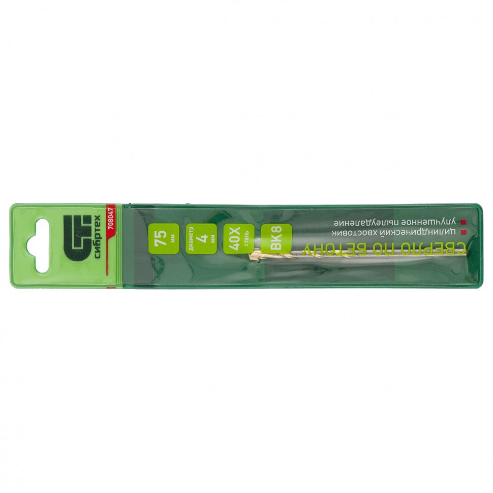 Сверло по бетону Сибртех 708047 диаметром 4 мм и длиной 75 мм, с цилиндрическим хвостовиком и улучшенным пылеудалением, предназначено для сверления в ударном режиме бетона и кирпича. Пригодится во время строительных и ремонтных работ.ПреимуществаПрочность — сверло изготовлено из стали 40Х, легированной хромом, поэтому устойчиво к динамическим нагрузкам. Эффективная работа с твердыми материалами — остро заточенная режущая пластина изготовлена из сплава карбида вольфрама твердостью 80-90 HRC.Долговечность — специальная канавка способствует ускоренному отведению шлама, что обеспечивает защиту сверла от перегрева.