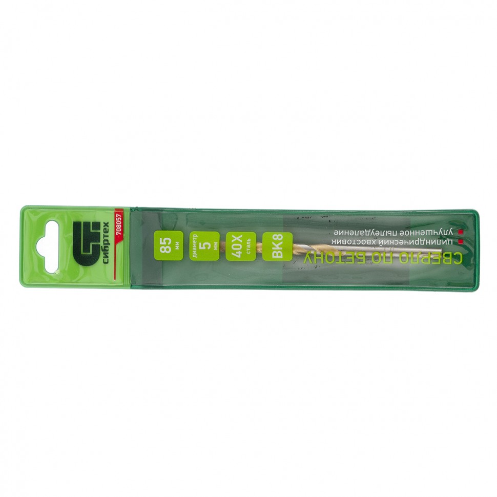 Сверло по бетону Сибртех 708057 диаметром 5 мм и длиной 85 мм, с цилиндрическим хвостовиком и улучшенным пылеудалением, предназначено для сверления в ударном режиме бетона и кирпича. Пригодится во время строительных и ремонтных работ.ПреимуществаПрочность — сверло изготовлено из стали 40Х, легированной хромом, поэтому устойчиво к динамическим нагрузкам. Эффективная работа с твердыми материалами — остро заточенная режущая пластина изготовлена из сплава карбида вольфрама твердостью 80-90 HRC.Долговечность — специальная канавка способствует ускоренному отведению шлама, что обеспечивает защиту сверла от перегрева.