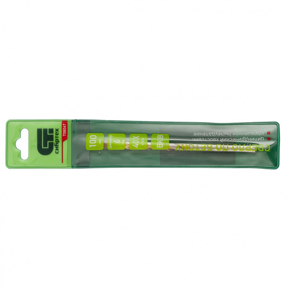 Сверло по бетону Сибртех 708067 диаметром 6 мм и длиной 100 мм, с цилиндрическим хвостовиком и улучшенным пылеудалением, предназначено для сверления в ударном режиме бетона и кирпича. Пригодится во время строительных и ремонтных работ.ПреимуществаПрочность — сверло изготовлено из стали 40Х, легированной хромом, поэтому устойчиво к динамическим нагрузкам. Эффективная работа с твердыми материалами — остро заточенная режущая пластина изготовлена из сплава карбида вольфрама твердостью 80-90 HRC.Долговечность — специальная канавка способствует ускоренному отведению шлама, что обеспечивает защиту сверла от перегрева.