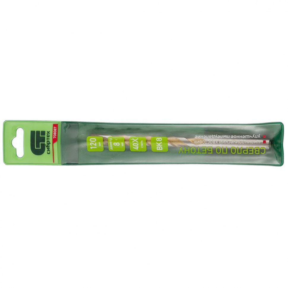 Сверло по бетону Сибртех 708087 диаметром 8 мм и длиной 120 мм, с цилиндрическим хвостовиком и улучшенным пылеудалением, предназначено для сверления в ударном режиме бетона и кирпича. Пригодится во время строительных и ремонтных работ.ПреимуществаПрочность — сверло изготовлено из стали 40Х, легированной хромом, поэтому устойчиво к динамическим нагрузкам. Эффективная работа с твердыми материалами — остро заточенная режущая пластина изготовлена из сплава карбида вольфрама твердостью 80-90 HRC.Долговечность — специальная канавка способствует ускоренному отведению шлама, что обеспечивает защиту сверла от перегрева.