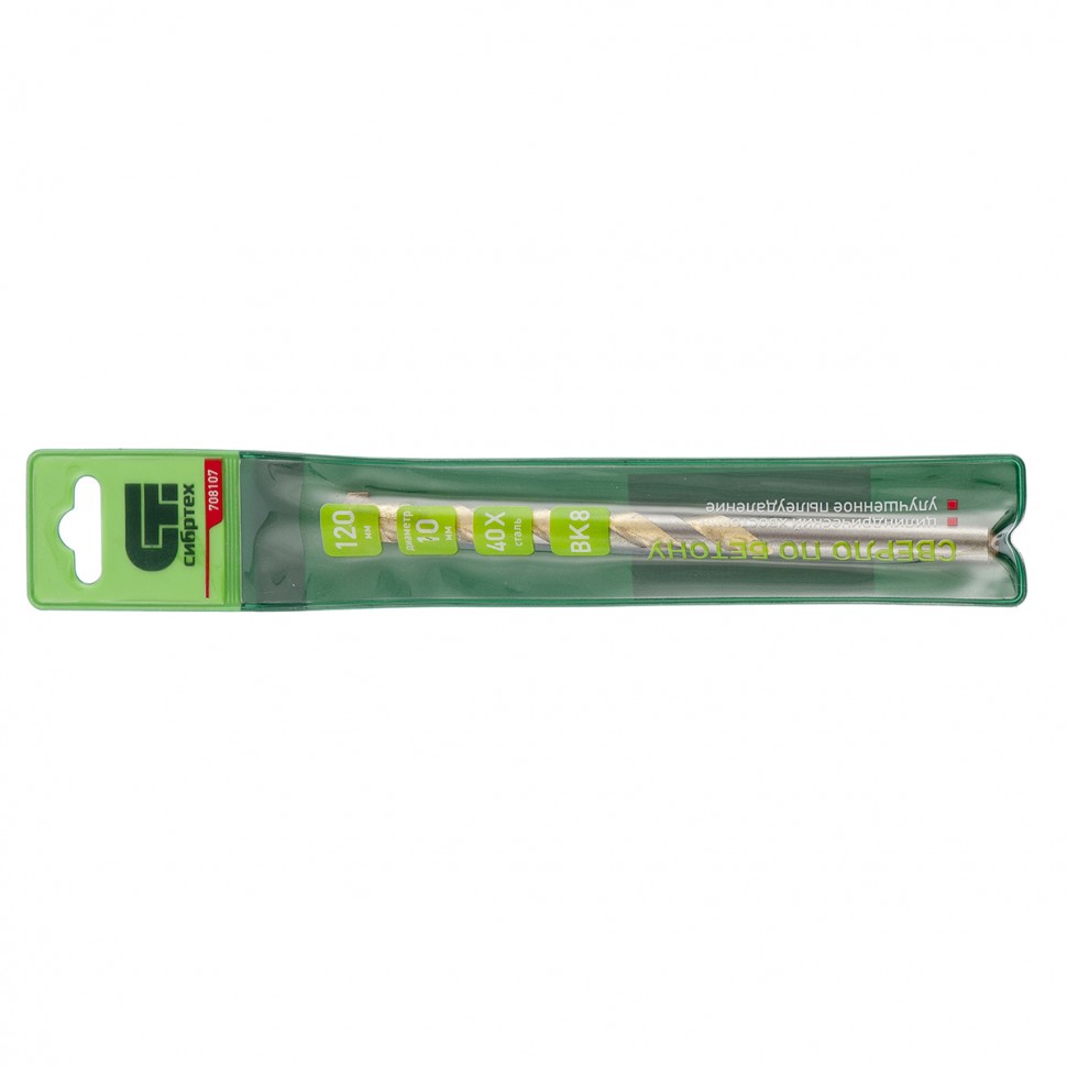 Сверло по бетону Сибртех 708107 диаметром 10 мм и длиной 120 мм, с цилиндрическим хвостовиком и улучшенным пылеудалением, предназначено для сверления в ударном режиме бетона и кирпича. Пригодится во время строительных и ремонтных работ.ПреимуществаПрочность — сверло изготовлено из стали 40Х, легированной хромом, поэтому устойчиво к динамическим нагрузкам. Эффективная работа с твердыми материалами — остро заточенная режущая пластина изготовлена из сплава карбида вольфрама твердостью 80-90 HRC.Долговечность — специальная канавка способствует ускоренному отведению шлама, что обеспечивает защиту сверла от перегрева.