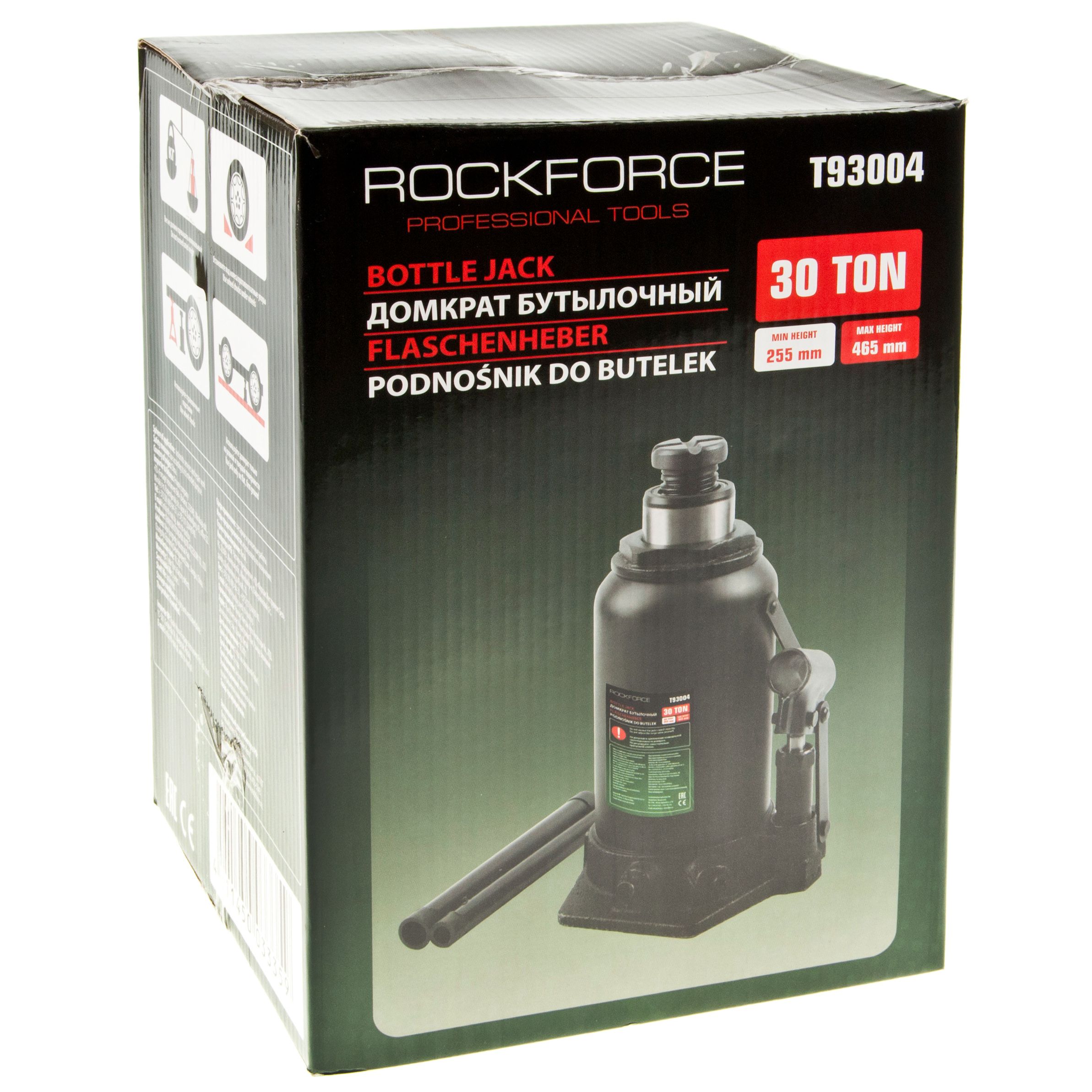 Домкрат RockForce бутылочный 30т Отлично подойдет для работ в сервисе, или же в собственном гараже. Домкрат изготовлен из прочного материала, устойчив к механическому воздействию, а так же к коррозии и ржавчине. У Домкрата высота подхвата — 255мм, высота подъема — 465мм, ход штока — 210мм. Домкрат проходит контроль качества на заводе изготовителя, и повторный контроль перед поступлением в продажу.