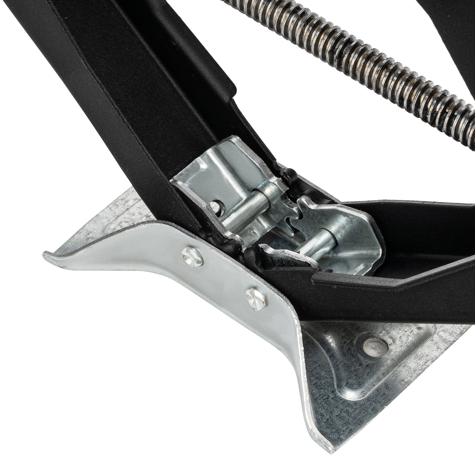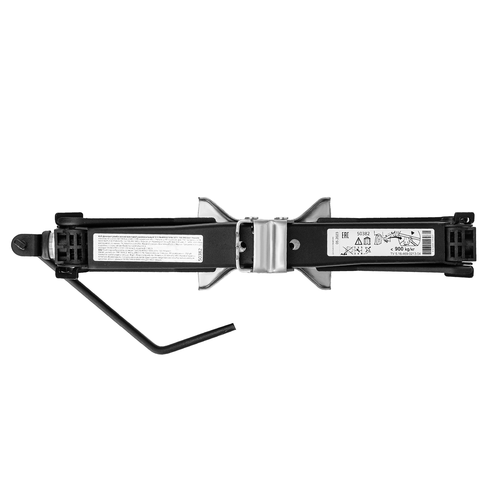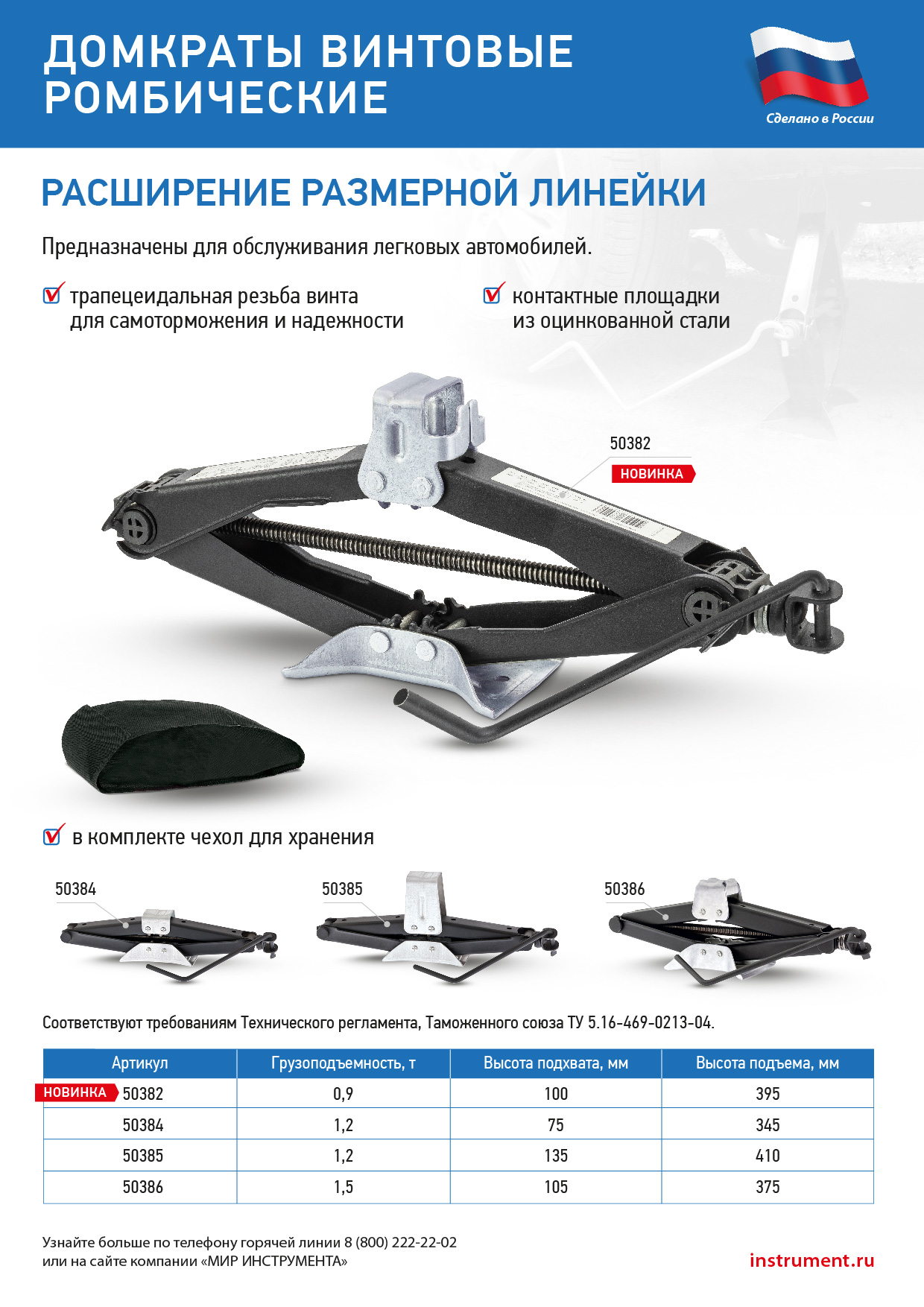 Универсальный винтовой ромбический домкрат 50382 соответствует ТУ 5.16-469-0213-04 и способен поднять груз массой 0,9 т на высоту от 100 до 395 мм. Предназначен для обслуживания малолитражных автомобилей. За счет небольшой высоты подхвата 100 мм домкрат является универсальным. Он приводится в действие при помощи простого и надежного винтового механизма. Будет полезен в гараже, пригодится также и в дороге.ПреимуществаУстойчивость — благодаря широкому основанию домкрат не опрокидывается во время работы.Надежность и долговечность — контактные площадки из оцинкованной стали и корпус с лакокрасочным покрытием не боятся коррозии, домкрат выдерживает эксплуатацию при низкой температуре.Защита от самопроизвольного опускания груза — трапецеидальная резьба винта обеспечивает функцию самоторможения.Компактность и малый вес — домкрат не занимает много места в зоне хранения, его удобно перемещать.