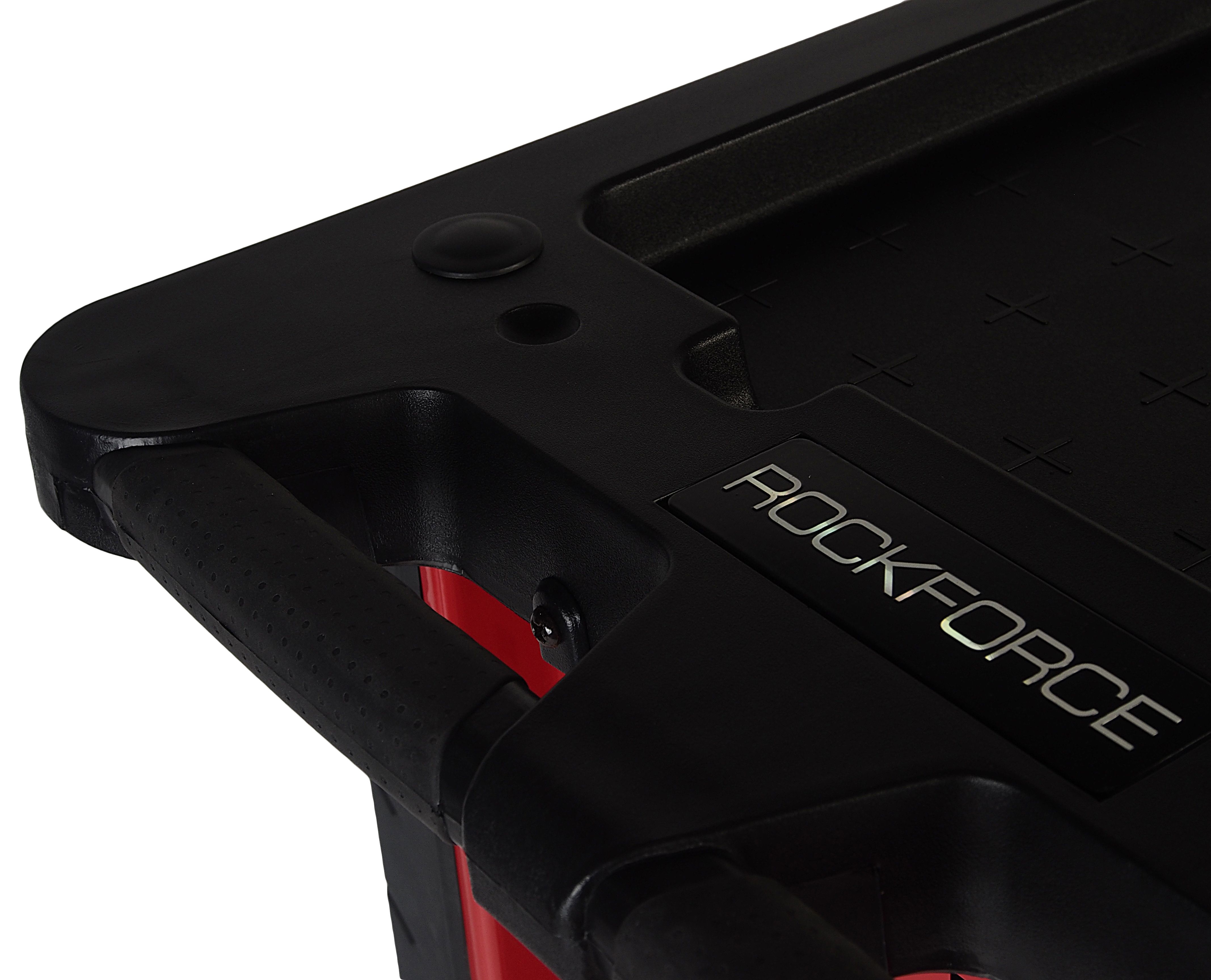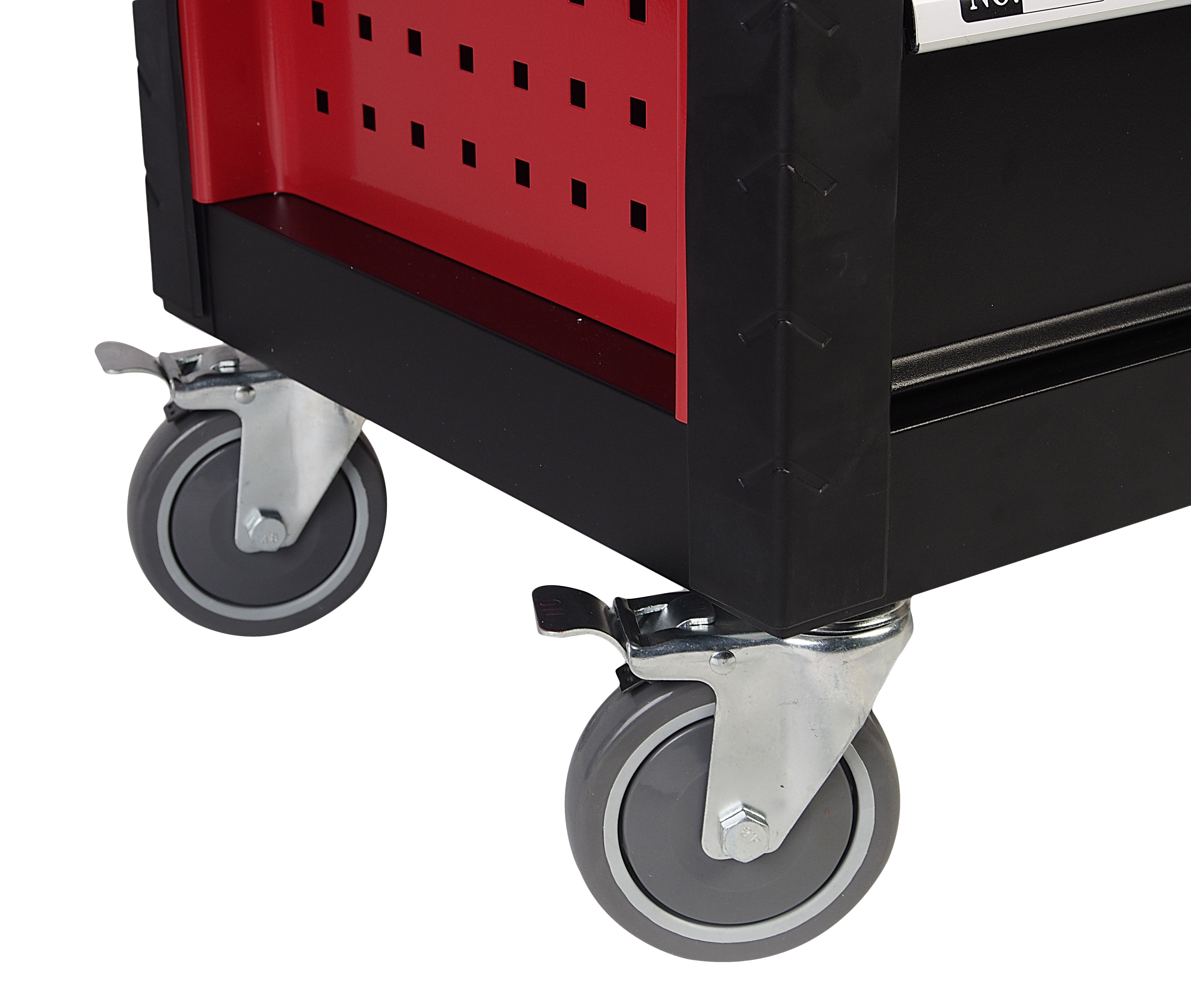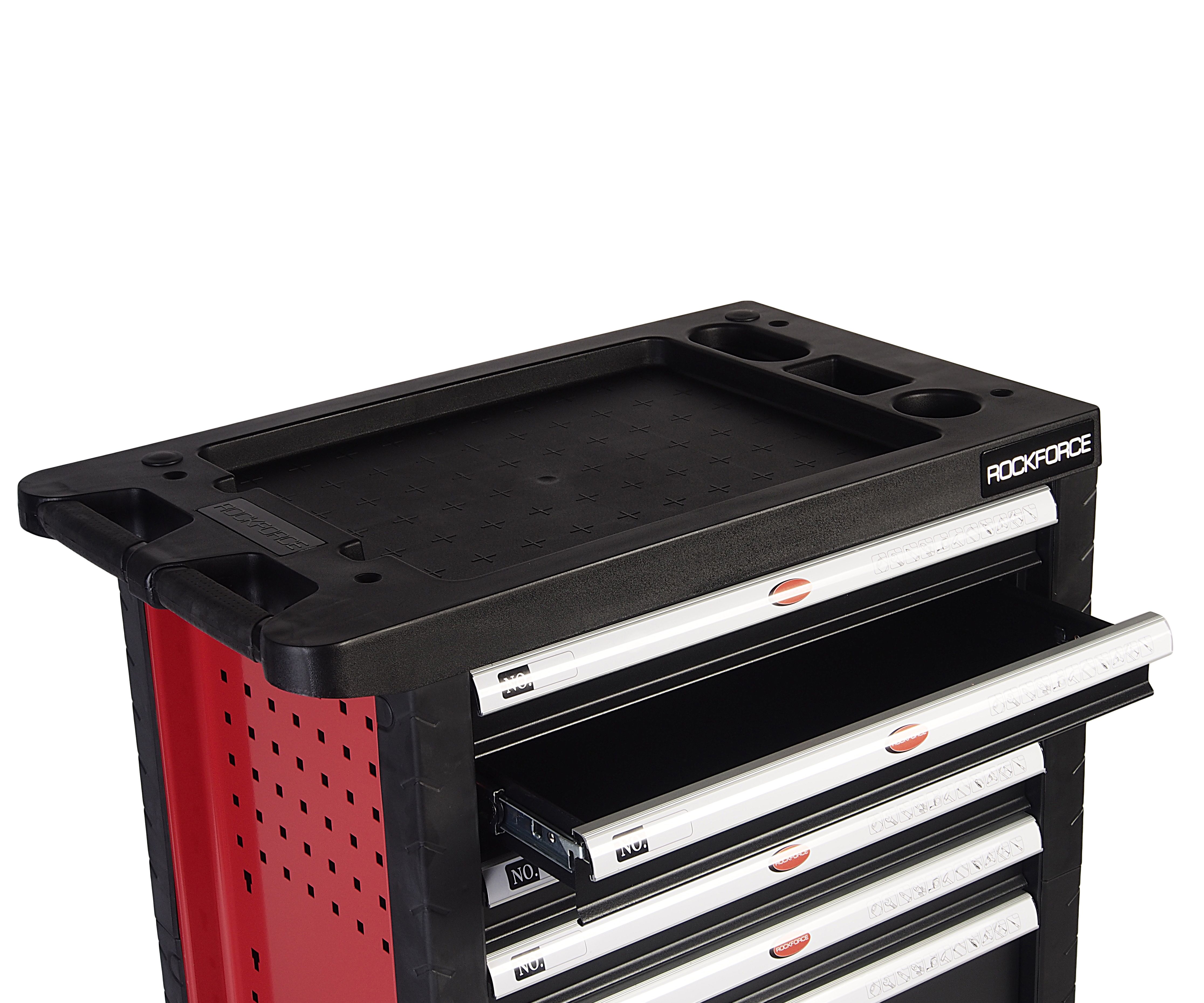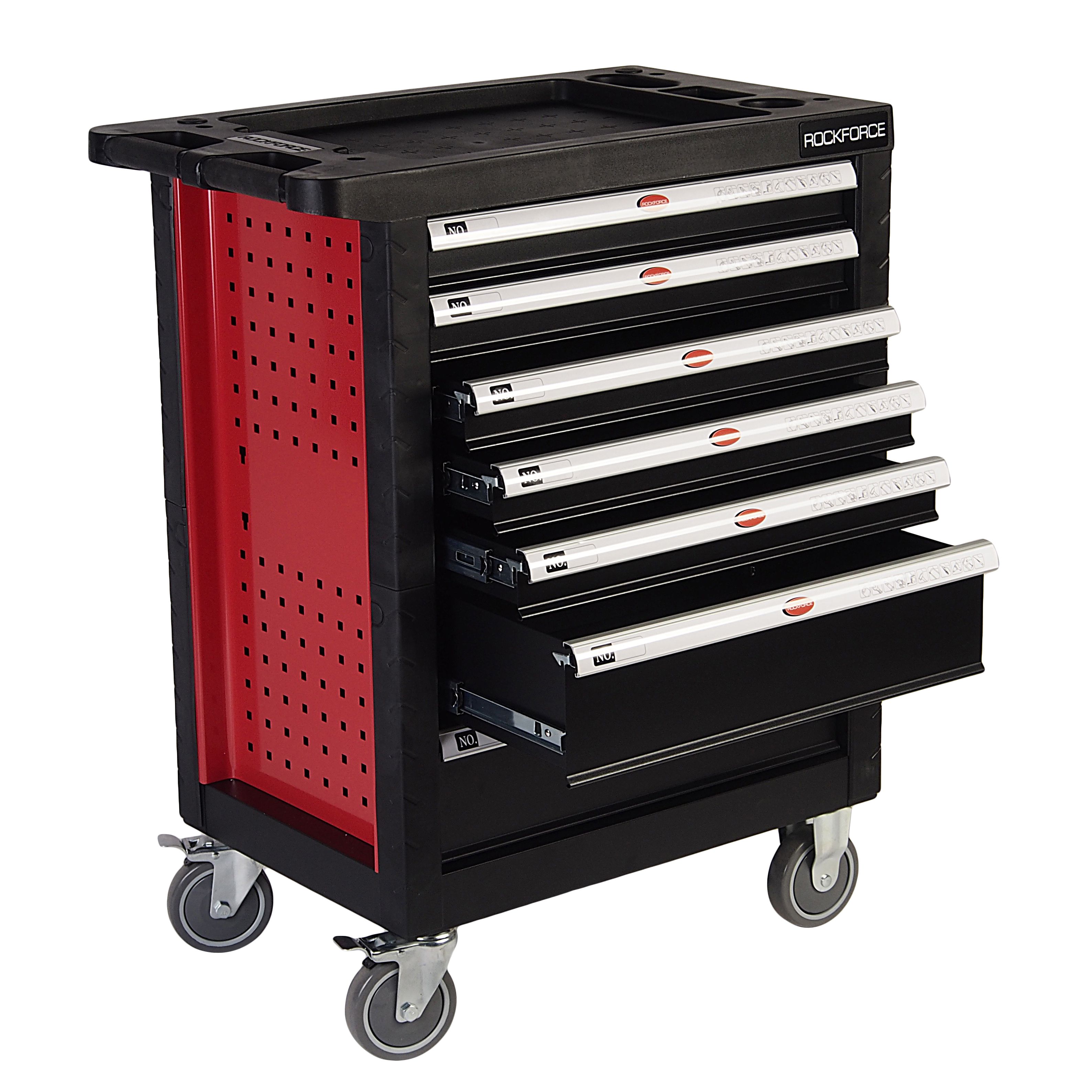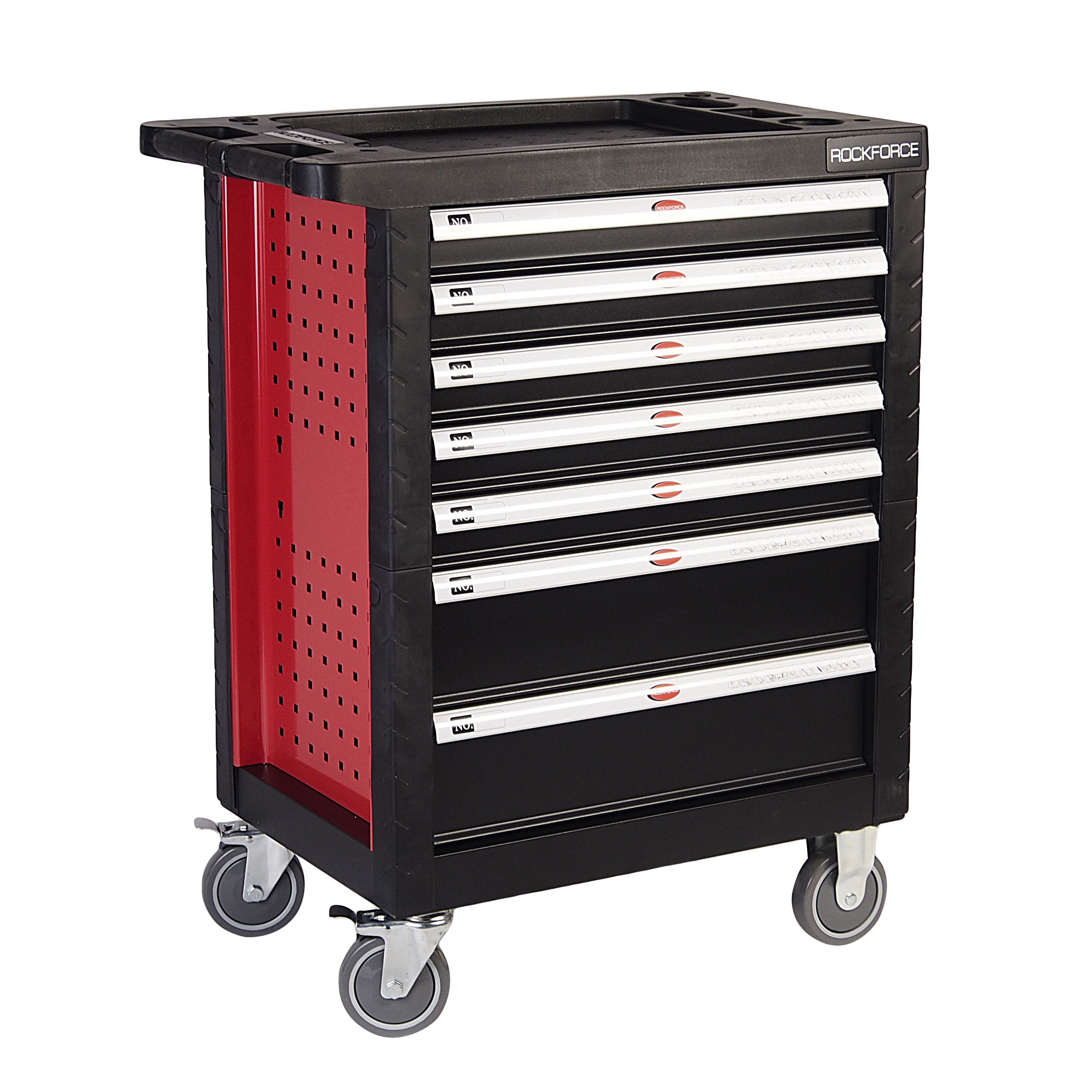 Тележка инструментальная RockForce 7 секций с пластиковой защитой корпуса,2 боковые перфорации 460×770×980мм (красная) Изделие подойдет для автомастерских и для собственного гаража. Наличие ящиков различного объема позволяет систематизировать хранение и сделать его более понятным и удобным. Верхняя полка покрыта специальным защитным материалом. В верхней части есть транспортировочная рукоятка и крючья для подвешивания инструмента. Поворотные колеса упрощают эксплуатацию тележки.