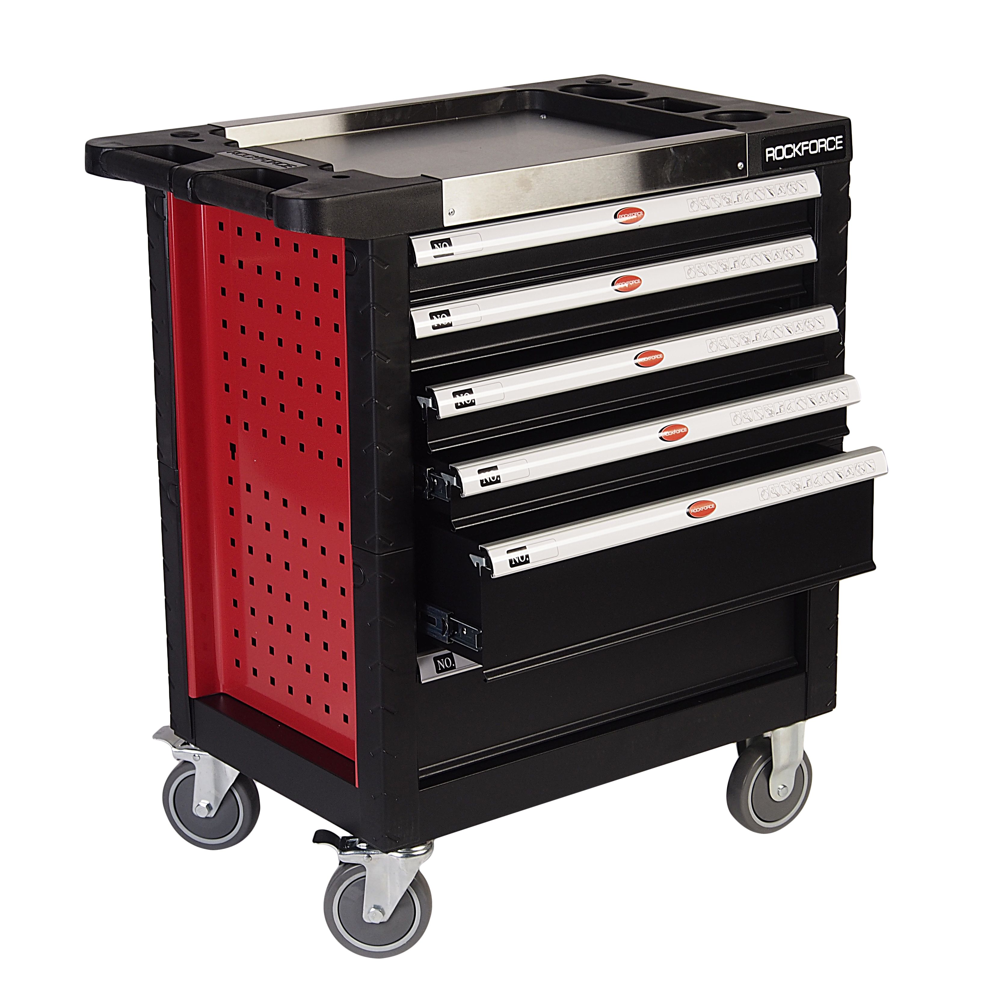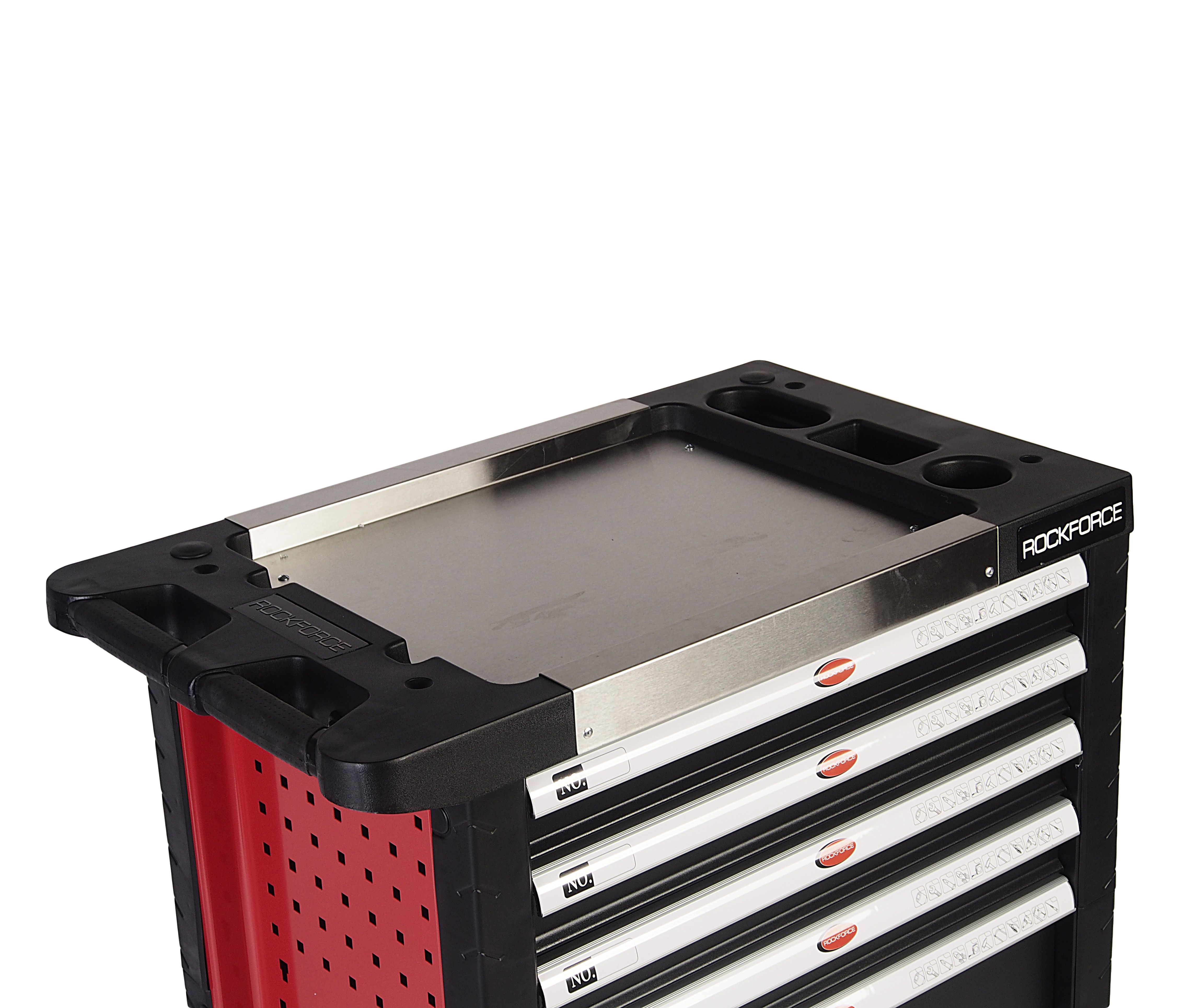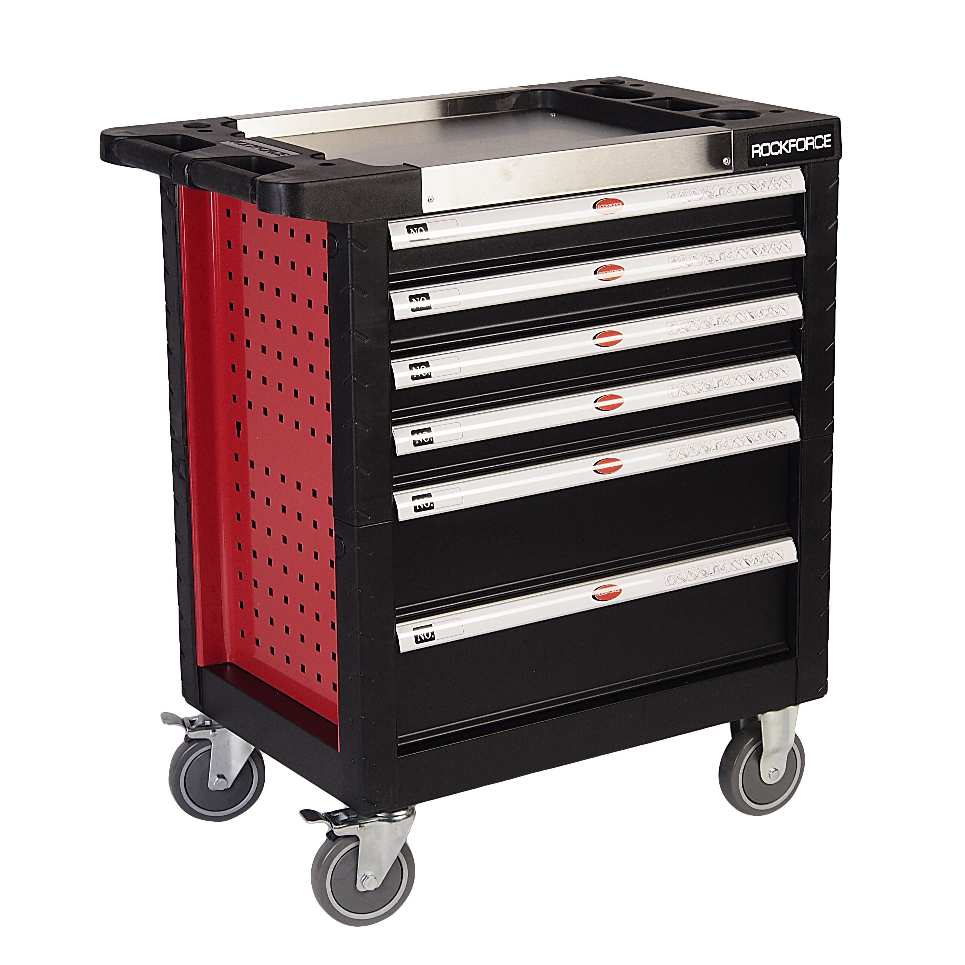 Тележка инструментальная RockForce 6 секций с пластиковой защитой корпуса, металлической крышкой+2бок. перфорации,460×770×900(красная) Изделие подойдет для автомастерских и для собственного гаража. Наличие ящиков различного объема позволяет систематизировать хранение и сделать его более понятным и удобным. Верхняя полка покрыта специальным защитным материалом. В верхней части есть транспортировочная рукоятка и крючья для подвешивания инструмента. Поворотные колеса упрощают эксплуатацию тележки.
