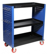 Тележка инструментальная RockForce 3 полочная с двумя перфорациями Изделие подойдет для автомастерских и для собственного гаража. Наличие ящиков различного объема позволяет систематизировать хранение и сделать его более понятным и удобным. Верхняя полка покрыта специальным защитным материалом. В верхней части есть транспортировочная рукоятка и крючья для подвешивания инструмента. Поворотные колеса упрощают эксплуатацию тележки.
