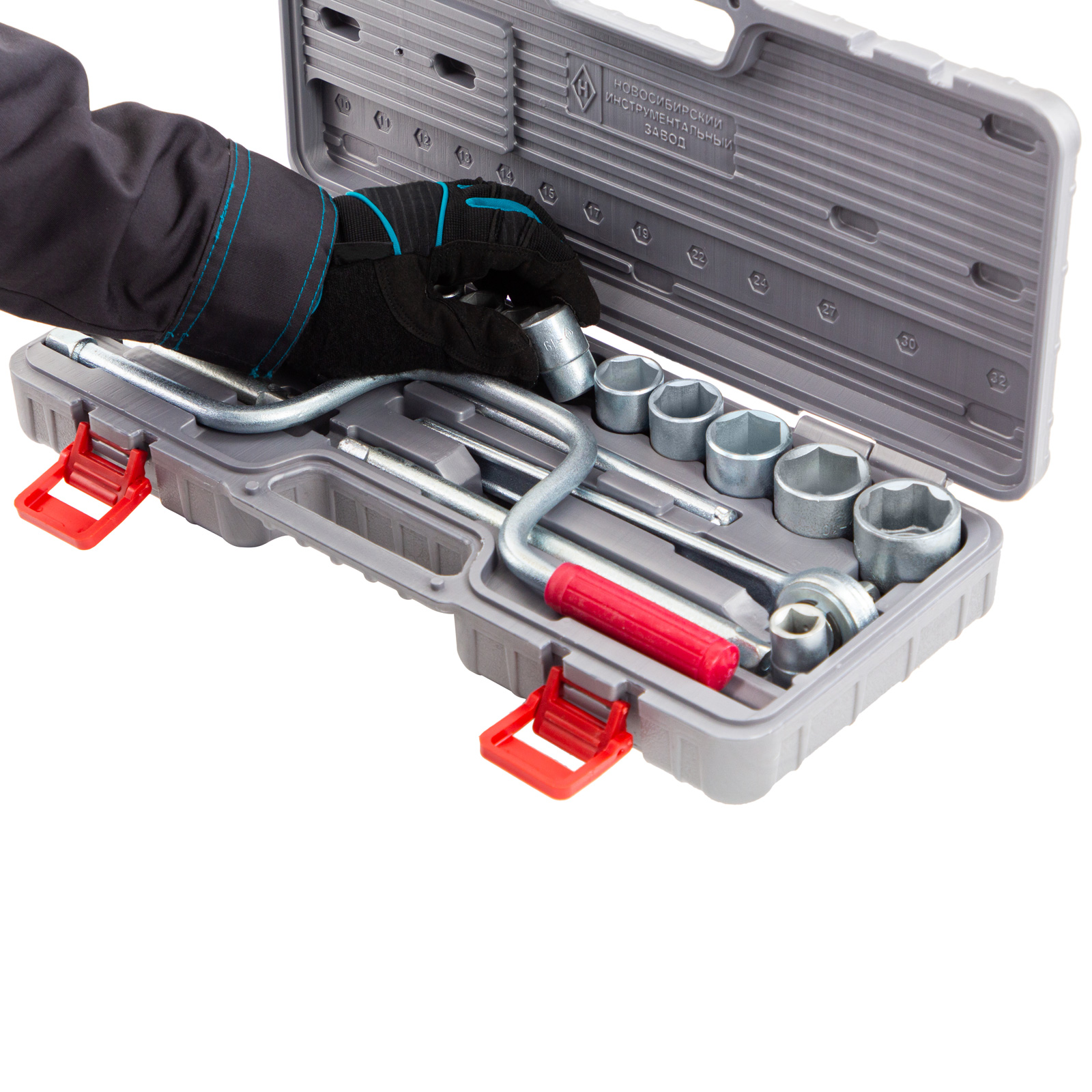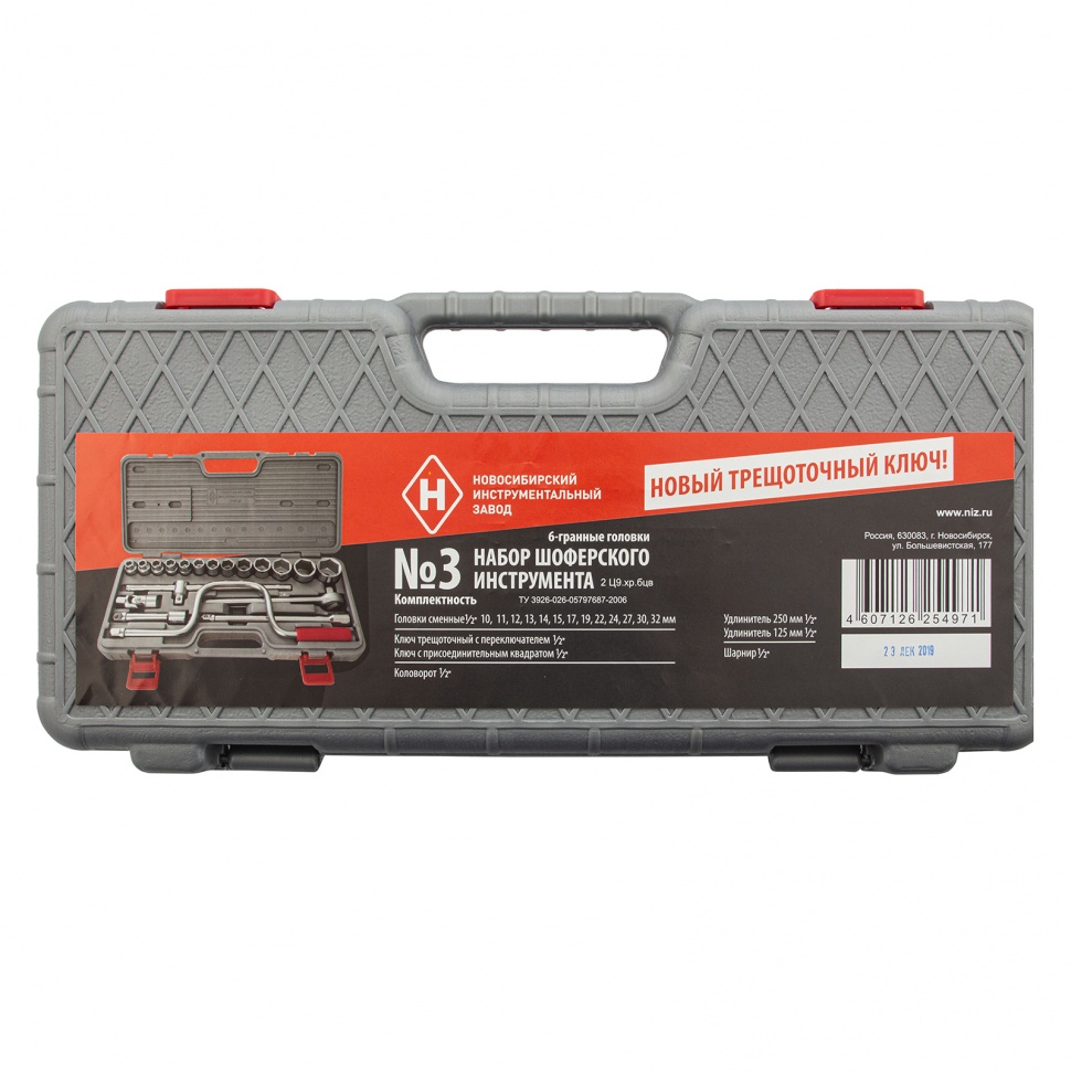 Набор шоферского инструмента № 3 НИЗ 13451 в пластиковом боксе используется для ремонта автомобиля и станет незаменимым помощником в дороге и гараже. В комплект входят инструменты, применяемые при монтаже и демонтаже резьбовых крепежей, а также торцевые головки на 10, 11, 12, 13, 14, 17, 19 мм.ПреимуществаПрочность — инструменты изготовлены из инструментальной стали 40Х, устойчивой к динамическим нагрузкам.Коррозионная стойкость — вороток и торцевые головки оцинкованы для защиты от воздействия влаги.Надежная фиксация торцевой головки — благодаря шариковому фиксатору насадка не соскакивает с воротка.Удобное хранение и транспортировка — набор поставляется в прочном пластиковом кейсе.