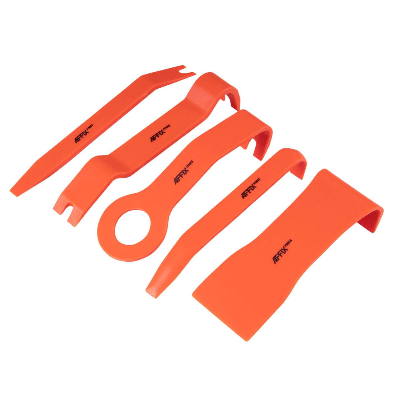 Инструменты изготовлены из полиамидного композита, устойчивого к маслам и растворителям, а форма съёмников позволяет проводить работы без опасения повредить приборную панель или внутреннюю обшивку авто.