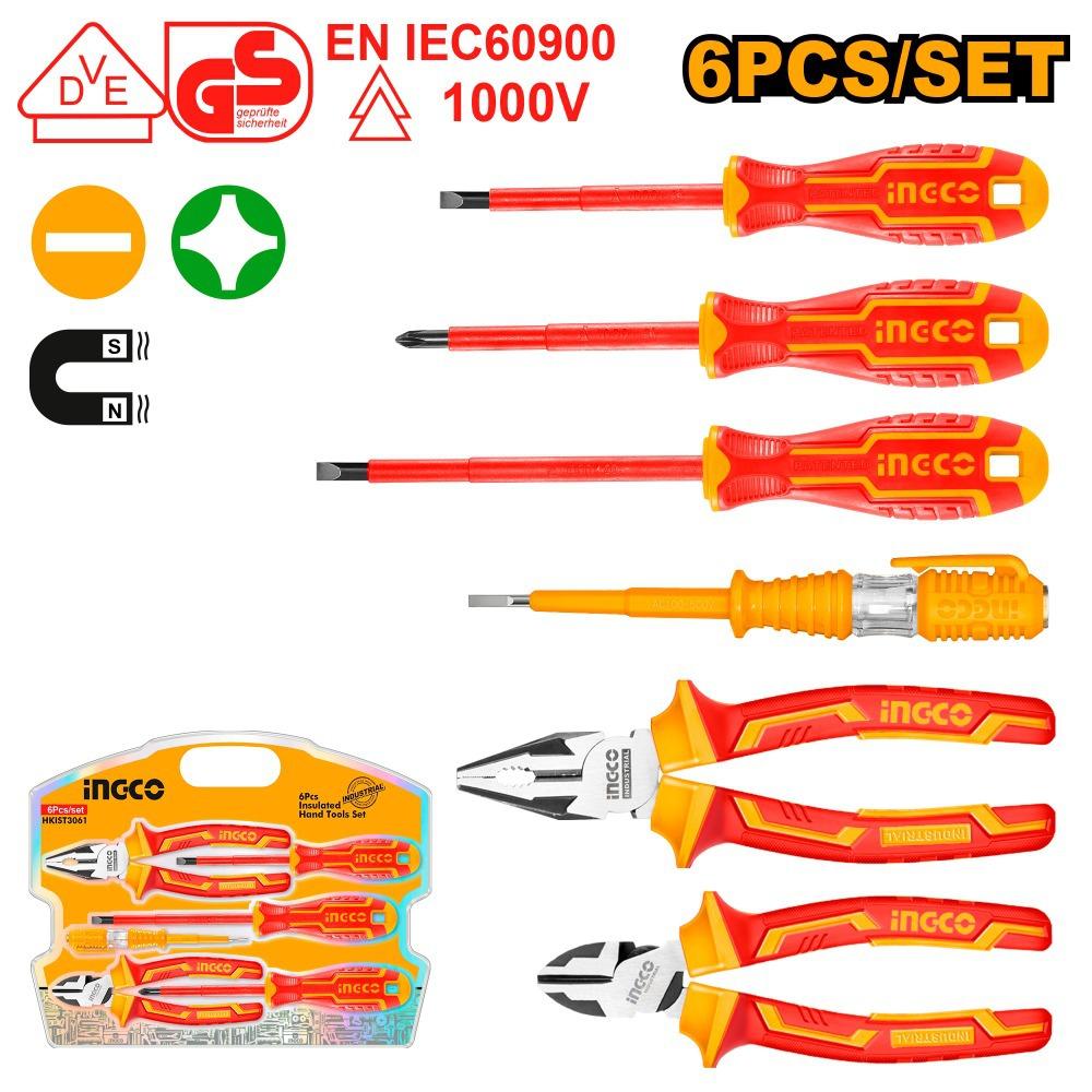Набор диэлектрического инструмента 6 шт. INGCO HKIST3061 INDUSTRIAL включает: 3 диэлектрические отвертки SL5.5x125, SL4.0x100, PH2x100, диэлектрические плоскогубцы 18 см, диэлектрические бокорезы 16 см, индикаторная отвертка 100-500 VAC. Упаковка - блистер.