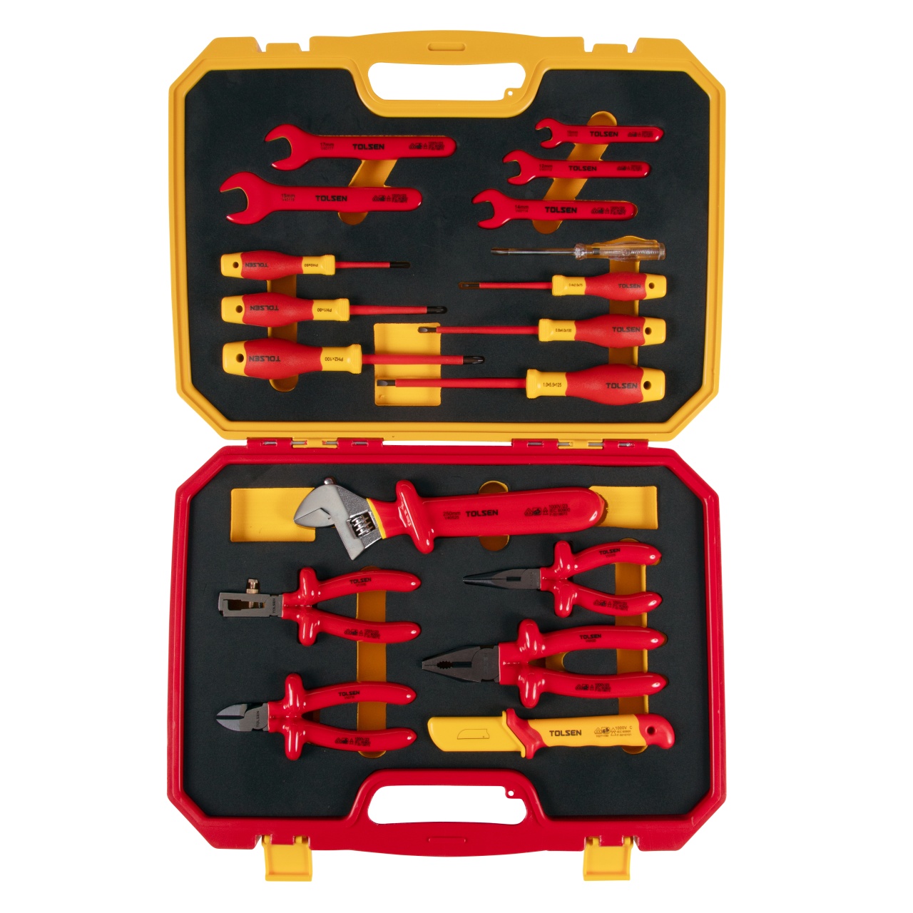 Материалы – сталь Cr-V, обливной PP (изоляция ключей, шарнирно-губцевого инструмента), PP+TPR (рукояти отвёрток, ножа), EVA (ложемент)
