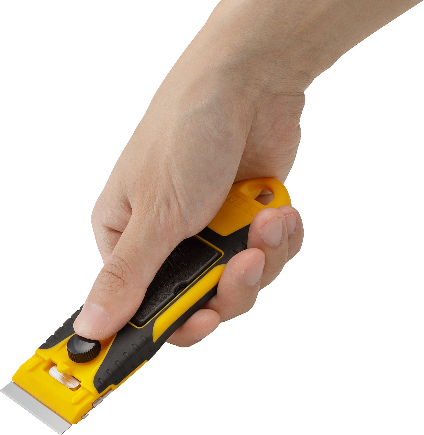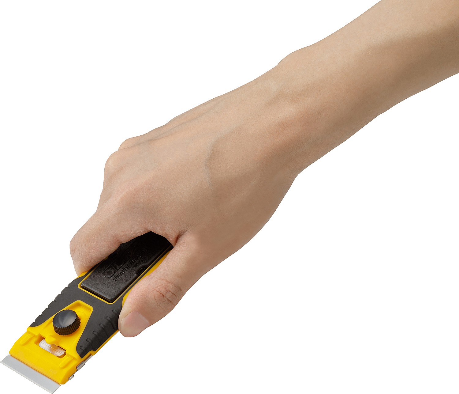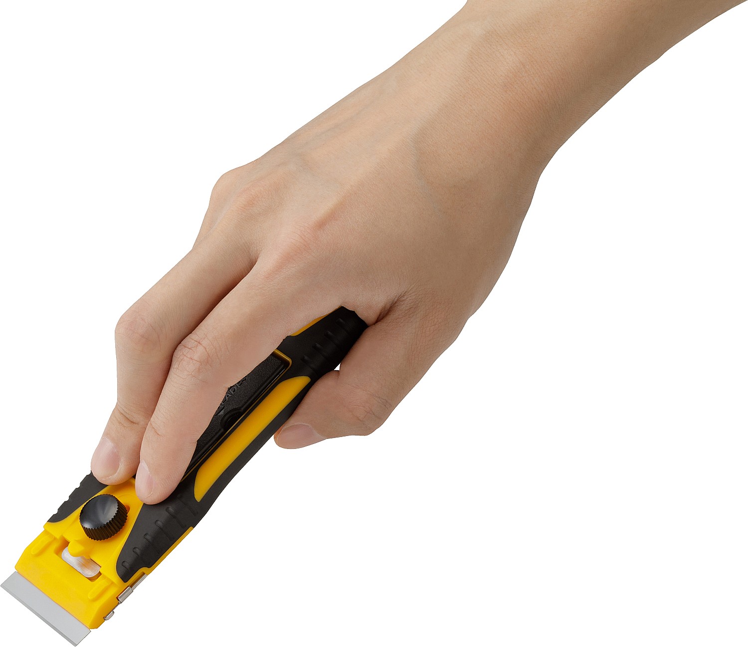 Компактный скребок OLFA GSR-2 удобен тем, что позволяет устранять загрязнения на небольшой площади в труднодоступных местах и на изогнутых поверхностях. Контейнер для лезвия можно использовать как защитную крышку для ножа.