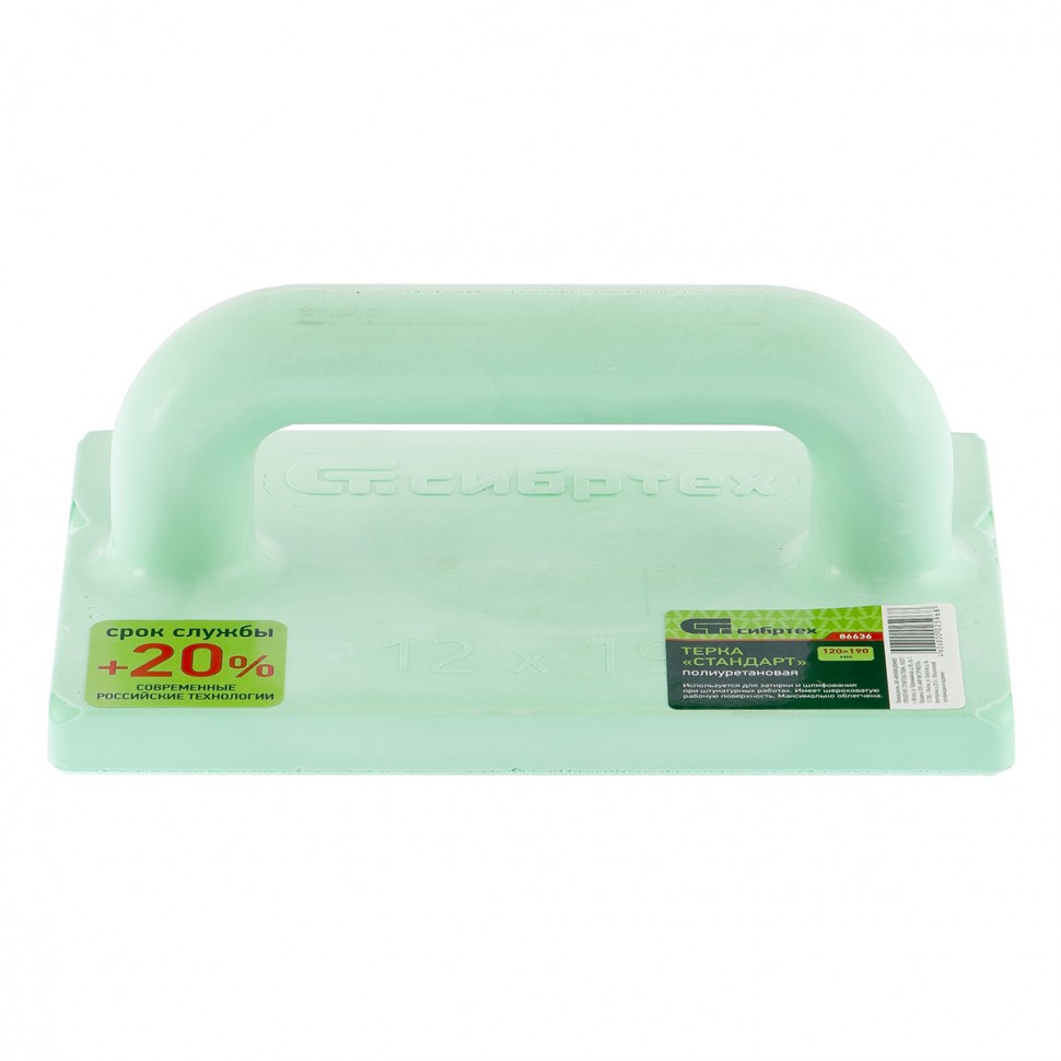 Облегченная полиуретановая терка Сибртех 86636 размером 120 х 190 мм предназначена для затирки и шлифования оштукатуренной поверхности во время отделочных работ. Успешно справляется со своей задачей благодаря шероховатой подошве. Компактное приспособление удобно для обработки небольших участков. Инструмент используется в профессиональной сфере, подойдет также для выполнения самостоятельного ремонта помещения.ПреимуществаТерка выдерживает многократное применение, поскольку изготовлена из износостойкого пенополиуретана и устойчива к механическим повреждениям, термическому и химическому воздействию.Инструмент подходит для длительного хранения, т.к. он не подвержен гниению и коррозии, не впитывает влагу и не рассыхается.Штукатурная терка комфортна да благодаря эргономичной, круглой в сечении ручке.Небольшой вес терки 96 г позволяет сэкономить силы во время длительной работы.