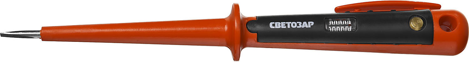 Электрический пробник SV-45161-19-C Светозар используется при проведении электромонтажных и других работ с электросетью. Пробник является отличным помощником при электромонтажных работах в доме, когда необходимо проверить, находится ли тот или иной провод под напряжением и т.д. Это гарантирует безопасность работы с электросетью. Индикатор загорается, если напряжение в сети 100-250 В. Электронный пробник имеет цельнолитой пластмассовый корпус. Длина 190 мм.
