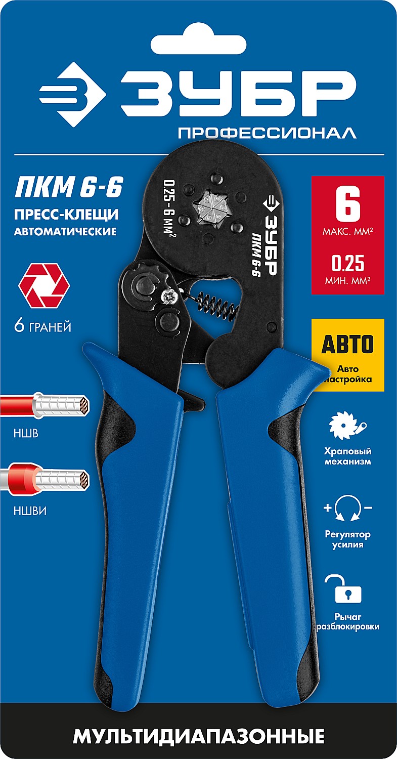 - Обжим изолированных и неизолированных втулочных наконечников 0.25-6 мм2.
