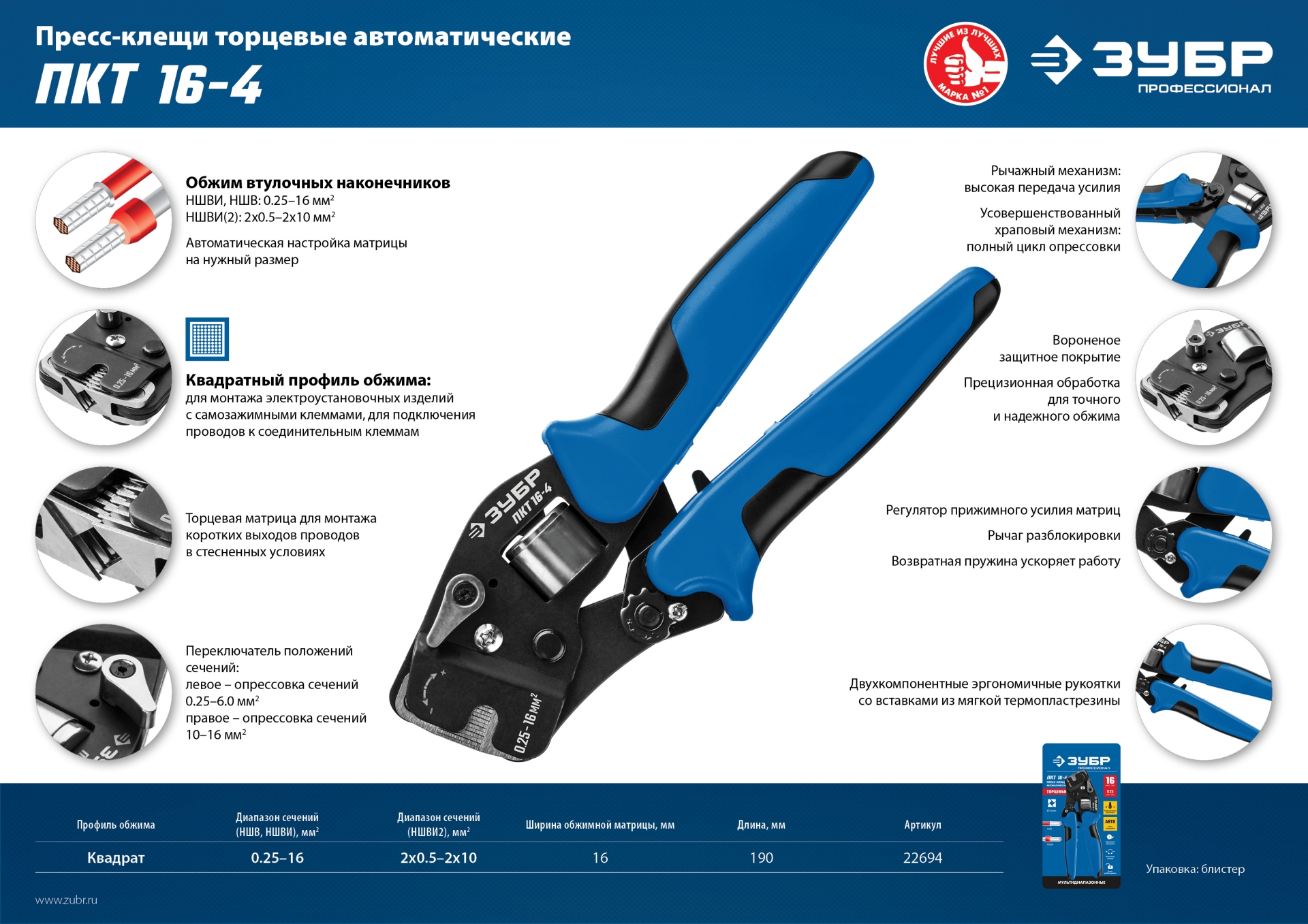 - Обжим изолированных и неизолированных втулочных наконечников 0.5-16 мм2.