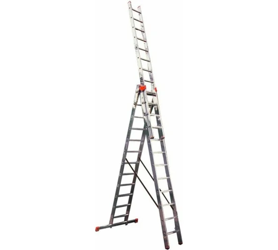 Трехсекционная универсальная лестница используется как приставная или выдвижная лестница, а так же как стремянка с выдвижной частью.