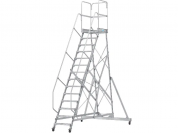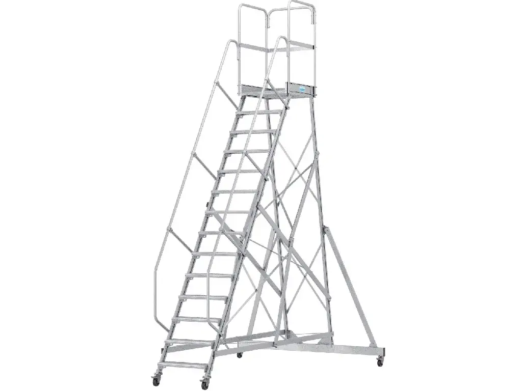 Односторонняя алюминиевая передвижная лестница с площадкой. Широкие ступени, двухсторонние перила и трёхстороннее ограждение площадки.