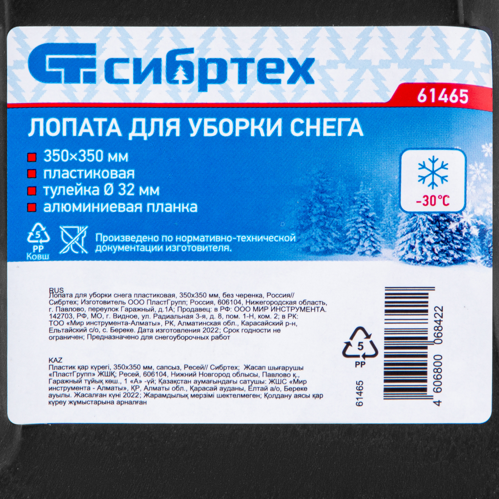 Пластиковая лопата Сибртех 61465, 350 х 350 мм, без черенка, используется для уборки снега на занесенных дорожках, тротуарах, подъездных путях. Эффективность работ обеспечивается благодаря вместительному ковшу с высокими бортиками. Ковш можно установить на черенок диаметром 32 мм, лопата совместима с артикулами 68408, 68412, 68409.ПреимуществаРабочая плоскость, усиленная ребрами жесткости, выдерживает повышенные нагрузки без риска излома.Ковш из ударопрочного полипропилена рассчитан на работу при температуре до -30 градусов и подходит для многократного использования.Кромка ковша защищена от истирания алюминиевой окантовкой и легко проникает в плотный снег и наст.