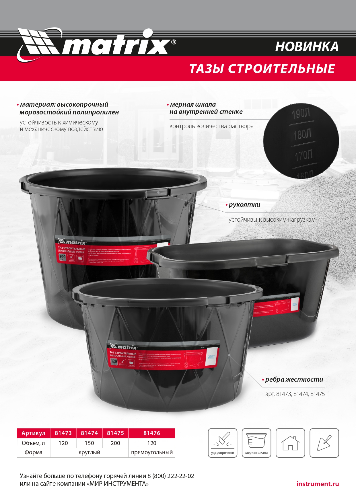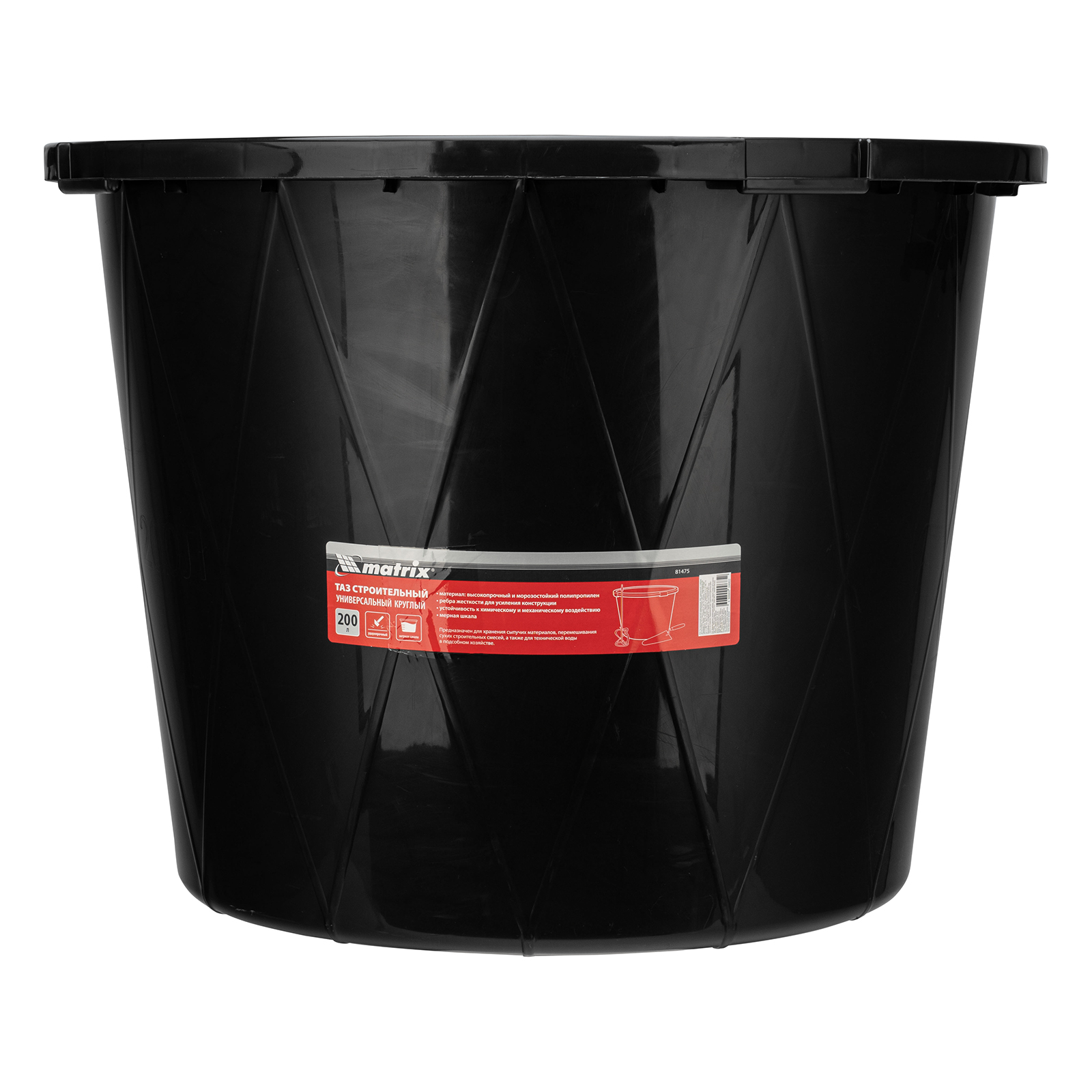 Круглый строительный ударопрочный таз Matrix 81475 с ребрами жесткости, объемом 200 л, универсален в применении: он используется для перемешивания строительных смесей, хранения сыпучих материалов и воды для технических нужд. Будет полезен во время проведения строительно-отделочных работ, пригодится также в подсобном хозяйстве и на огороде. Преимущества Оптимальное сочетание легкости, прочности и эластичности — таз изготовлен из высококачественного полипропилена, устойчивого к химическим и механическим воздействиям. Морозостойкость — изделие подходит для использования при низких температурах. Надежность — корпус усилен дополнительными ребрами жесткости. Контроль количества приготовляемого раствора — на внутренней стенке имеется мерная шкала. Удобная транспортировка — усиленные ручки позволяют с легкостью перемещать даже наполненный таз.