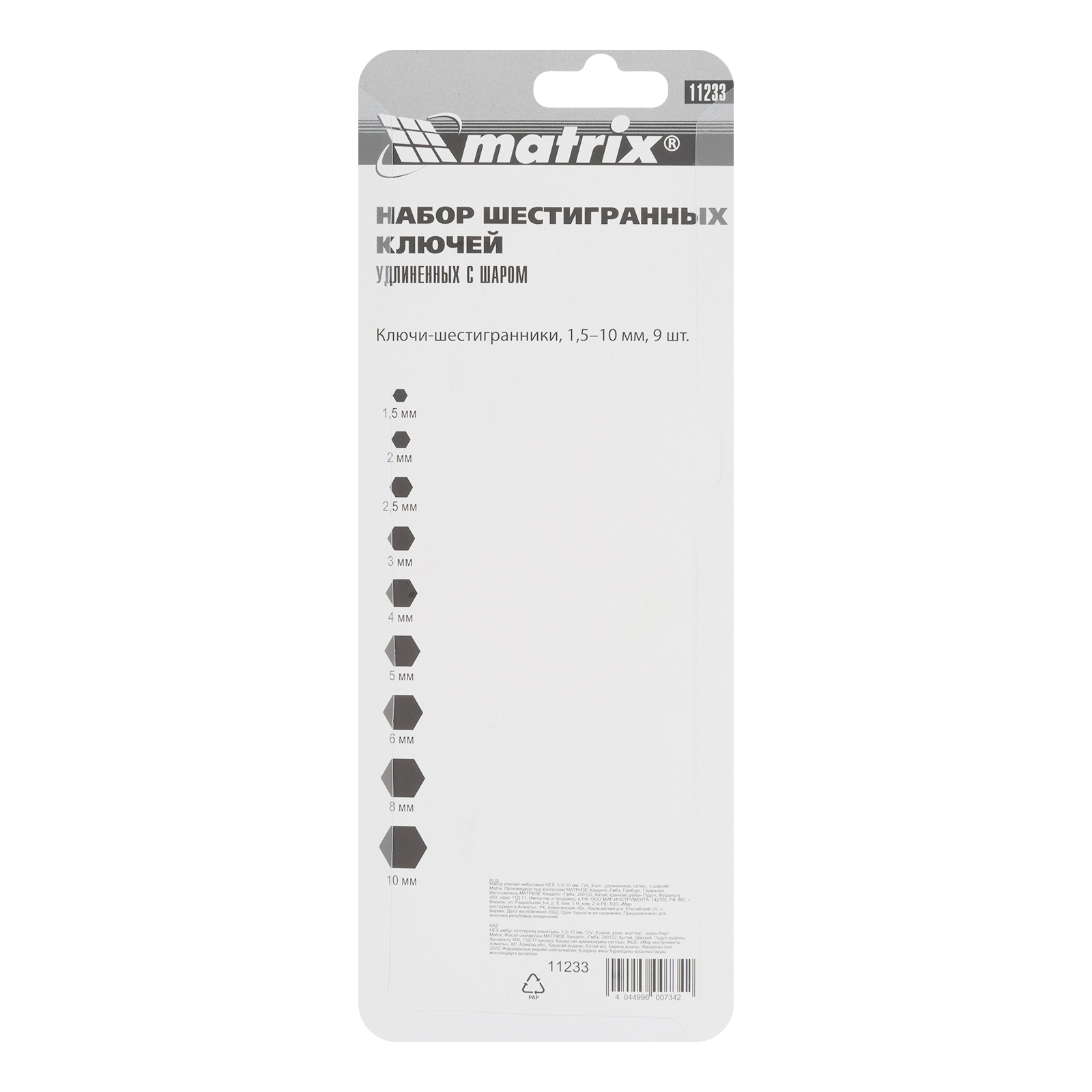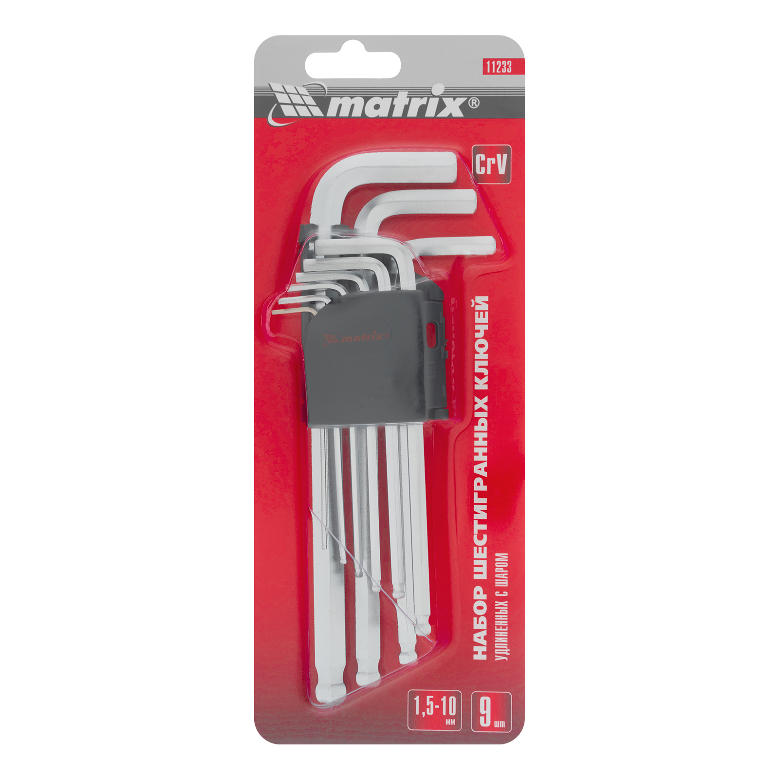 Набор Matrix 11233 из 9 удлиненных сатинированных имбусовых ключей размером 1,5-10 мм, с шаром, из стали CrV, используется для монтажа и демонтажа крепежа со шлицем HEX. Шестигранники наиболее часто применяются для закручивания мебельных евровинтов и ремонта велосипедов. Удлиненные рабочие части обеспечивают удобный доступ в труднодоступные места.ПреимуществаВысокий ресурс — ключи изготовлены из прочной и износостойкой хромованадиевой стали.Защита от разрушения — сатинированная поверхность инструментов устойчива к повреждениям.Универсальность — короткие части ключей можно использовать для работы в ограниченном пространстве и в случаях, когда требуется приложить большое усилие.Продуманная конструкция — шар на конце каждого ключа позволяет работать с крепежами под углом.Удобное хранение и транспортировка — в набор входит пластиковый держатель.