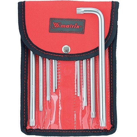 Набор Matrix 12313 в чехле включает 9 удлиненных сатинированных имбусовых ключей размером Т10-Т50, из стали CrV, и используется для монтажа и демонтажа крепежных элементов с профилем TORX-TORX Tampered. Набор пригодится для домашнего применения и профессиональных работ по ремонту бытовой и электронной техники. Ключи Г-образной формы удобны для работы с большим усилием и в труднодоступных местах.ПреимуществаВысокий ресурс — ключи изготовлены из прочной стали CrV твердостью 50-55 HRC.Универсальность — в набор входит 9 ключей для работы с крепежом разного типоразмера.Комфортная работа — сатинированные ключи с гладкой поверхностью без микронеровностей надежно ложатся в руку.Удобное хранение и транспортировка — ключи поставляются в тканевом чехле с застежкой, который можно закрепить на поясе.