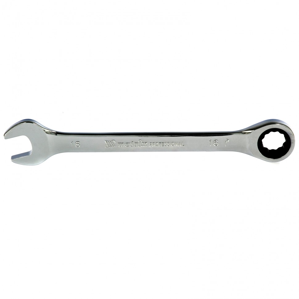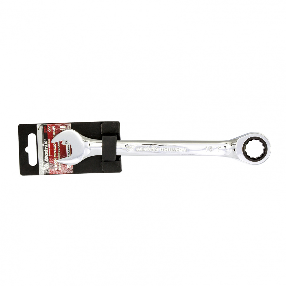 Комбинированный трещоточный ключ Matrix 14809 из стали CrV, с покрытием «зеркальный хром», размером 16 мм, позволяет быстро откручивать и закручивать болты и гайки. Рожковую часть удобно использовать там, где нет возможности полного охвата детали, а трещоточный механизм повышает удобство работы в труднодоступных местах.ПреимуществаПрочность — ключ из высококачественной стали 40CrV с храповым механизмом твердостью 58 HRC легко выдерживает интенсивные нагрузки.Коррозионная стойкость — зеркальное хромоникелевое покрытие защищает инструмент от воздействия влаги.Аккуратная работа — накидная часть с 12-гранным профилем полностью охватывает головку крепежа, что снижает риск деформации ее граней.