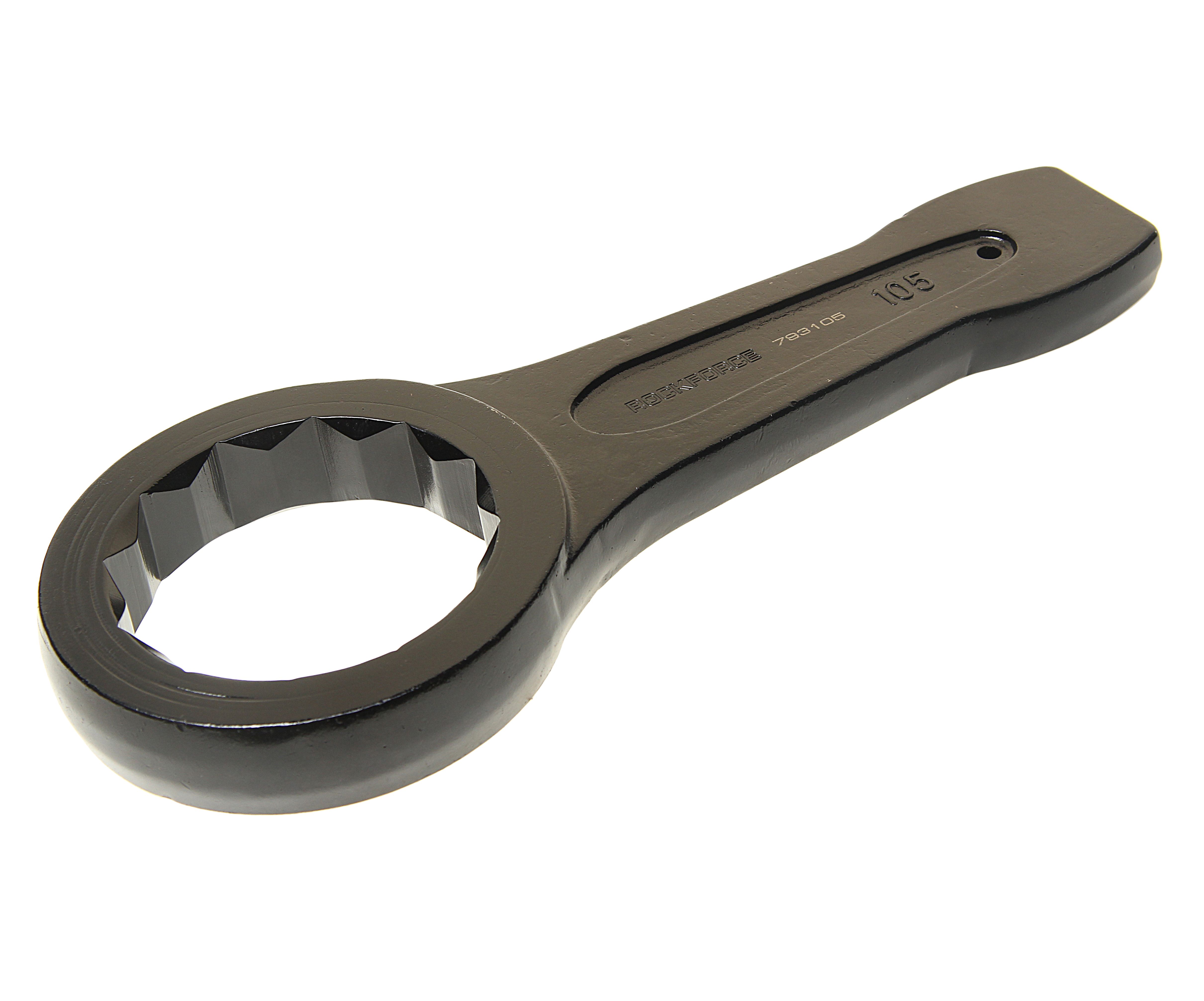 Ключ накидной RockForce ударный односторонний 105мм (L-400мм) Комплект ключей для работы с резьбовыми соединениями. Набор состоит из рожково-накидных ключей, с динамическим профилем, ключи установлены в полотно или пластиковом держателе. Рожковый профиль имеет 15-ти градусный угол, и такой же угол отгиба у накидного кольца, что упрощает работу с элементами в труднодоступных местах. Выполнен из высокопрочной хром-ванадиевой стали со специальной термообработкой.