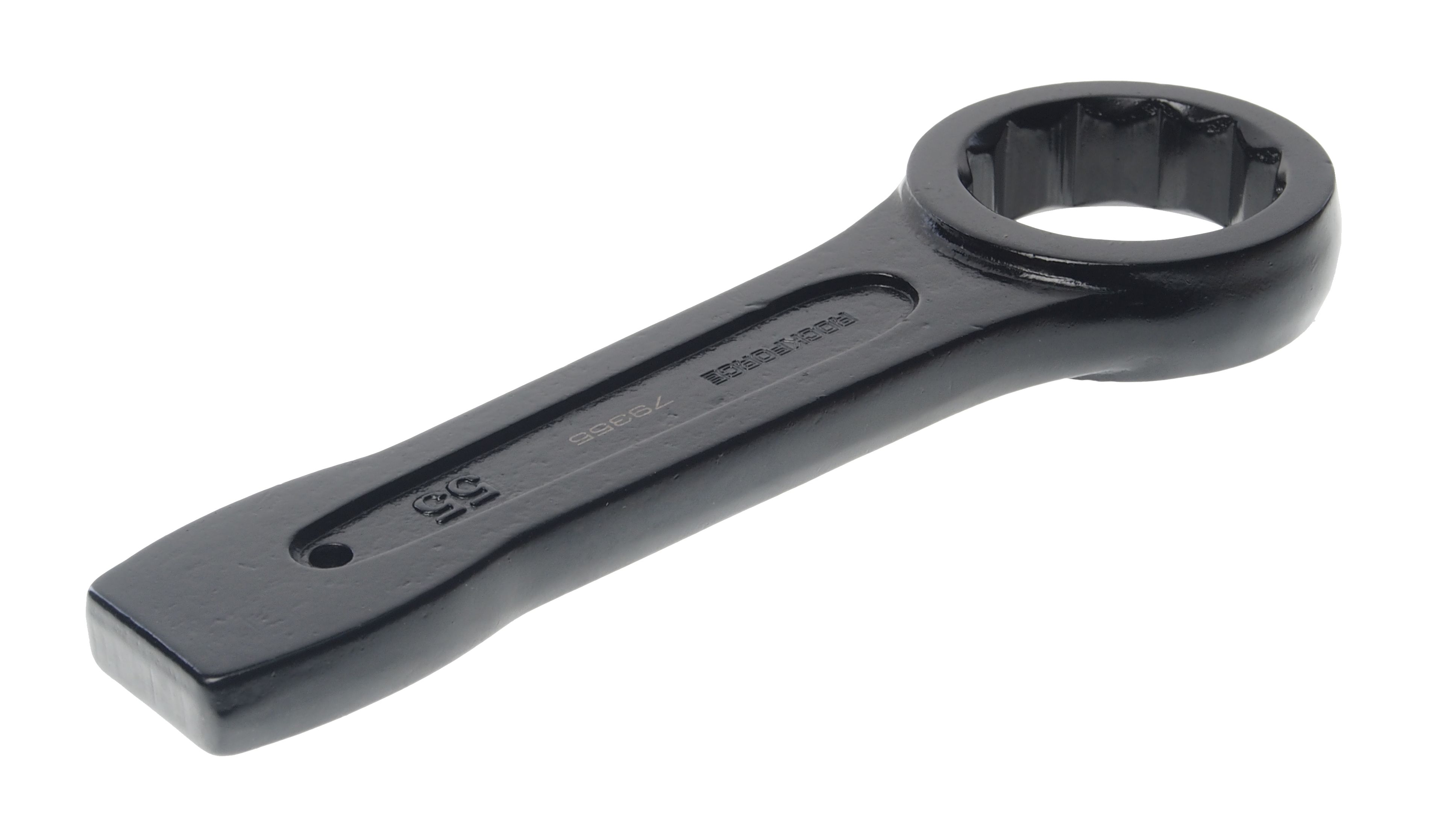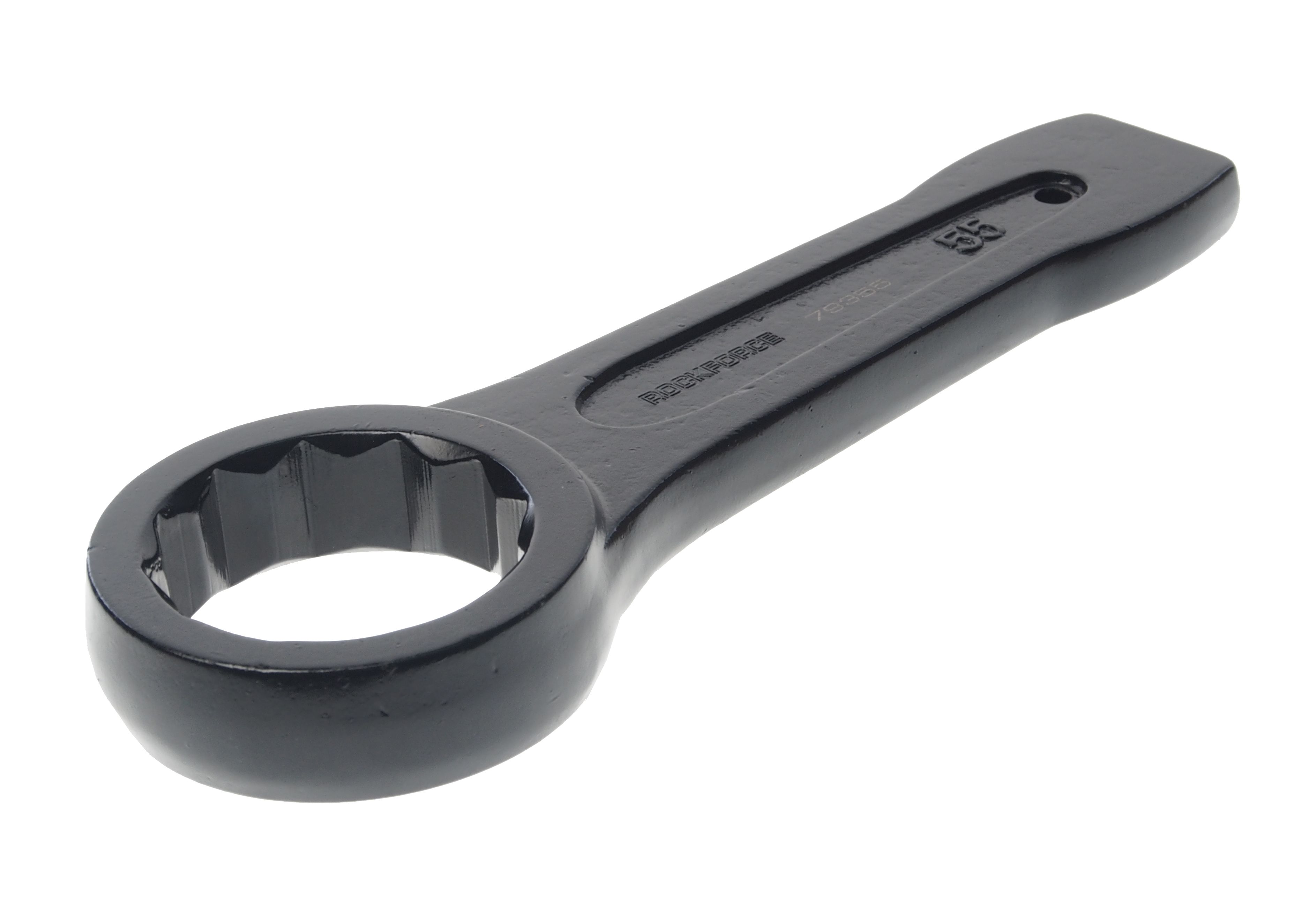 Ключ накидной RockForce ударный односторонний 55мм (L-260мм) Комплект ключей для работы с резьбовыми соединениями. Набор состоит из рожково-накидных ключей, с динамическим профилем, ключи установлены в полотно или пластиковом держателе. Рожковый профиль имеет 15-ти градусный угол, и такой же угол отгиба у накидного кольца, что упрощает работу с элементами в труднодоступных местах. Выполнен из высокопрочной хром-ванадиевой стали со специальной термообработкой.