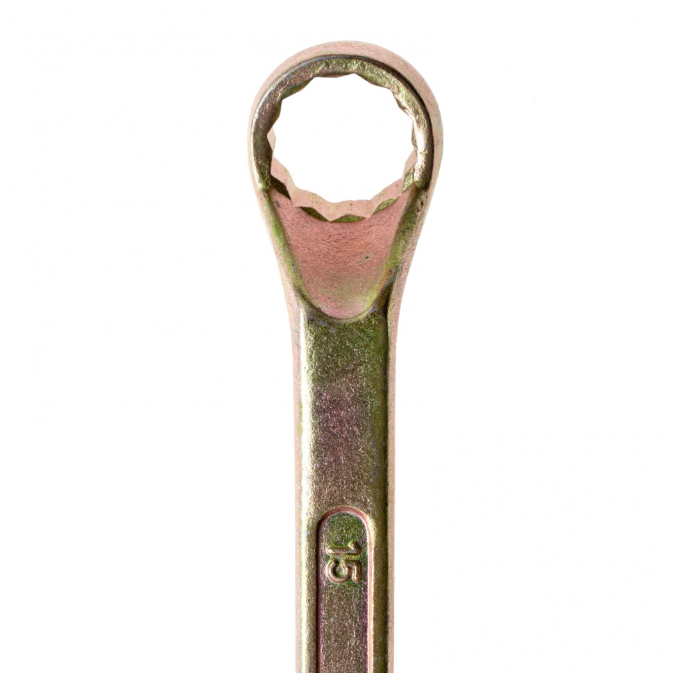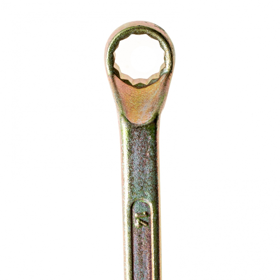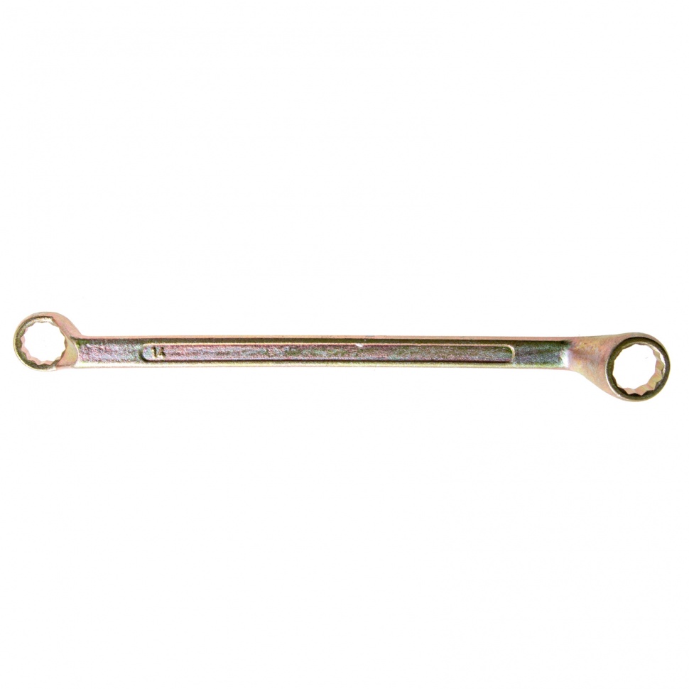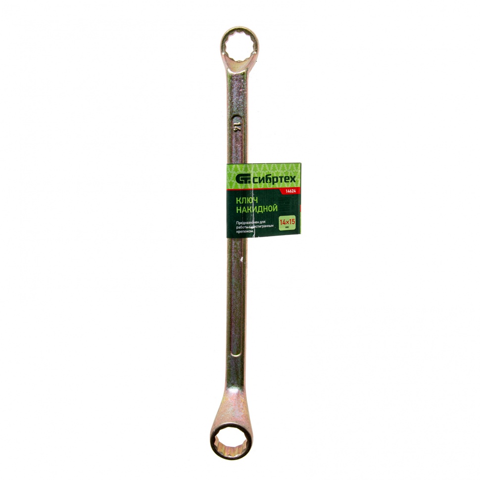 Накидной ключ Сибртех 14624 с покрытием из желтого цинка используется для монтажа и демонтажа резьбового крепежа с шестигранной головкой диаметром 14 и 15 мм. Пригодится для выполнения монтажных работ в гараже, на небольшом производстве и в быту. Кольцевой зев полностью захватывает шляпку крепежного элемента, поэтому ключом легко откручивать даже закисшие болты и гайки.ПреимуществаПрочность и долговечность — инструмент изготовлен из высококачественной углеродистой стали 45, твердость рабочих частей составляет 42 HRC, что соответствует требованиям ГОСТ (41-46 HRC).Устойчивость к воздействию влаги — желтое цинковое покрытие защищает от образования коррозии.Надежный захват крепежа — 12-гранный профиль каждого кольцевого зева имеет увеличенную площадь соприкосновения с головкой болта или гайки, что минимизирует риск повреждения ее граней.Продуманная конструкция — рабочие части смещены относительно плоскости рукоятки, что делает удобной работу в труднодоступных местах.