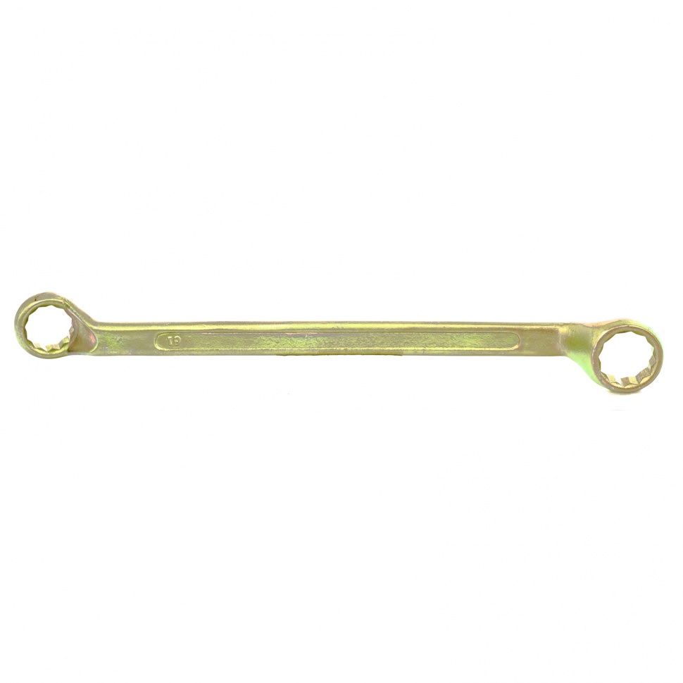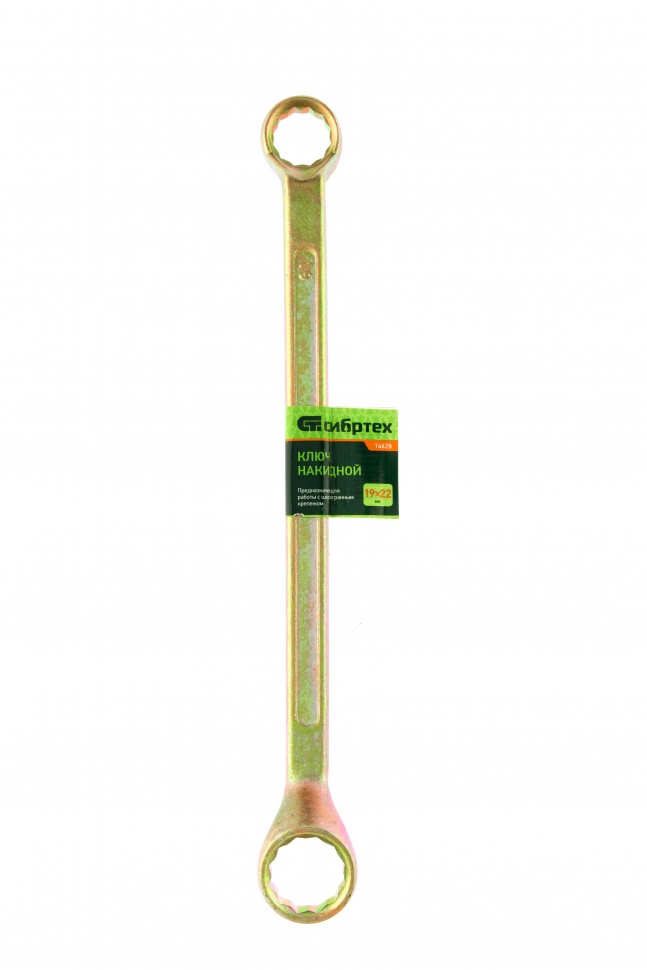 Накидной ключ Сибртех 14628 с покрытием из желтого цинка используется для монтажа и демонтажа резьбового крепежа с шестигранной головкой диаметром 19 и 22 мм. Пригодится для выполнения монтажных работ в гараже, на небольшом производстве и в быту. Кольцевой зев полностью захватывает шляпку крепежного элемента, поэтому ключом легко откручивать даже закисшие болты и гайки.ПреимуществаПрочность и долговечность — инструмент изготовлен из высококачественной углеродистой стали 45, твердость рабочих частей составляет 42 HRC, что соответствует требованиям ГОСТ (41-46 HRC).Устойчивость к воздействию влаги — желтое цинковое покрытие защищает от образования коррозии.Надежный захват крепежа — 12-гранный профиль каждого кольцевого зева имеет увеличенную площадь соприкосновения с головкой болта или гайки, что минимизирует риск повреждения ее граней.Продуманная конструкция — рабочие части смещены относительно плоскости рукоятки, что делает удобной работу в труднодоступных местах.